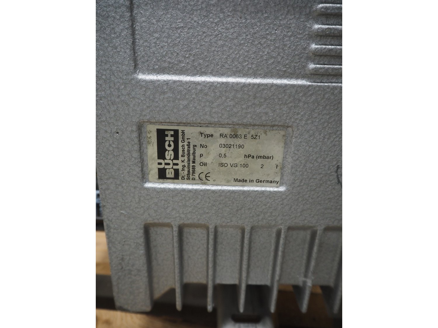 Busch vacuum pump, type: RA 0063 E 5Z1, number: 03021190, capacity: 63 m³ per hour, dimensions: 620 mm x 430 mm x 400 mm.