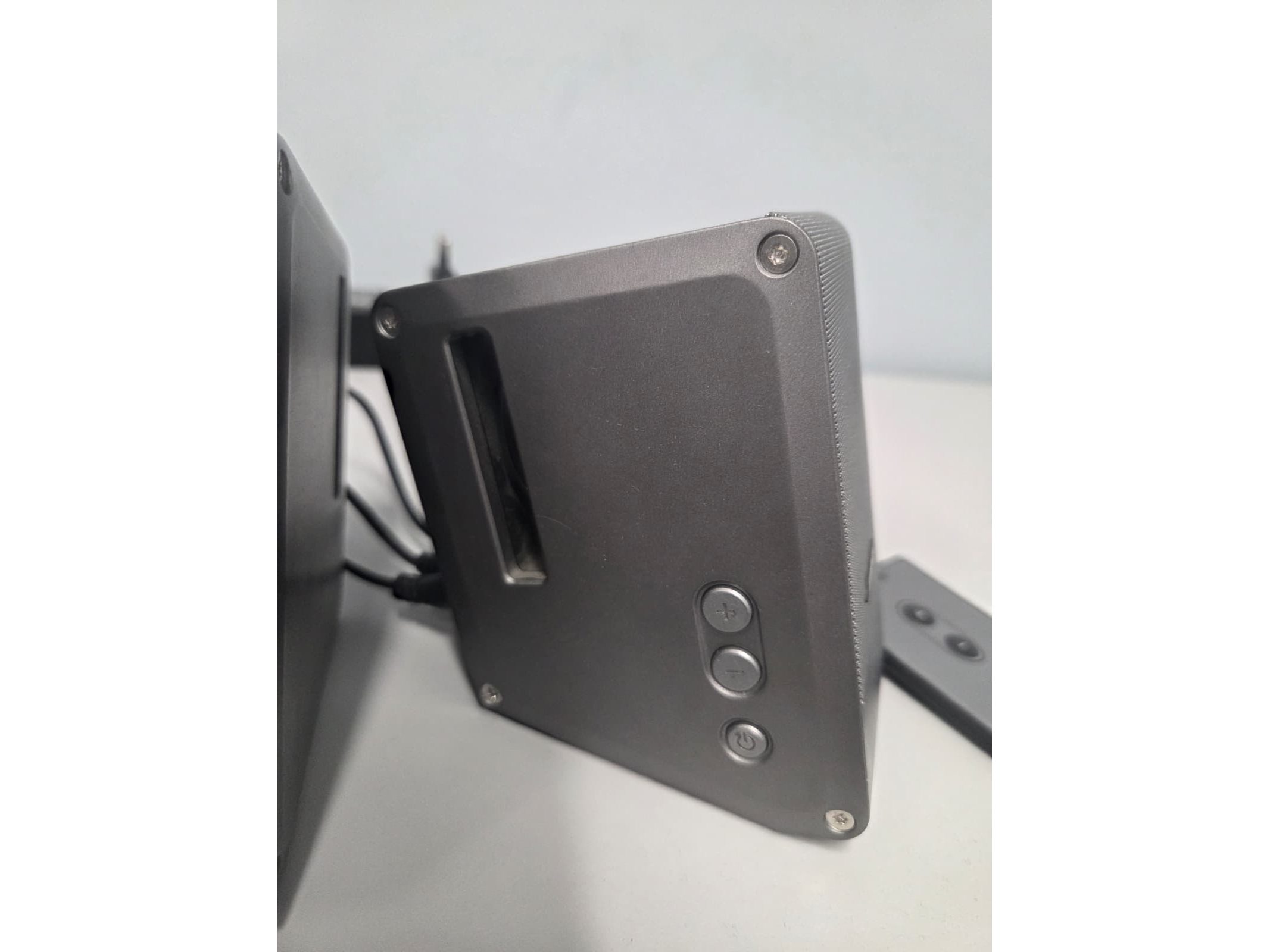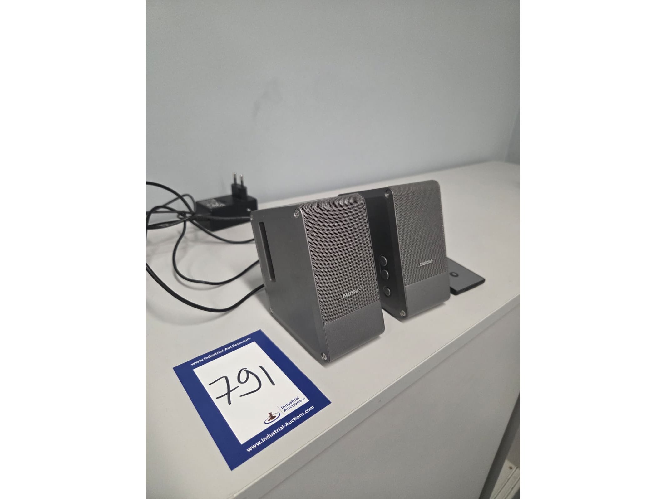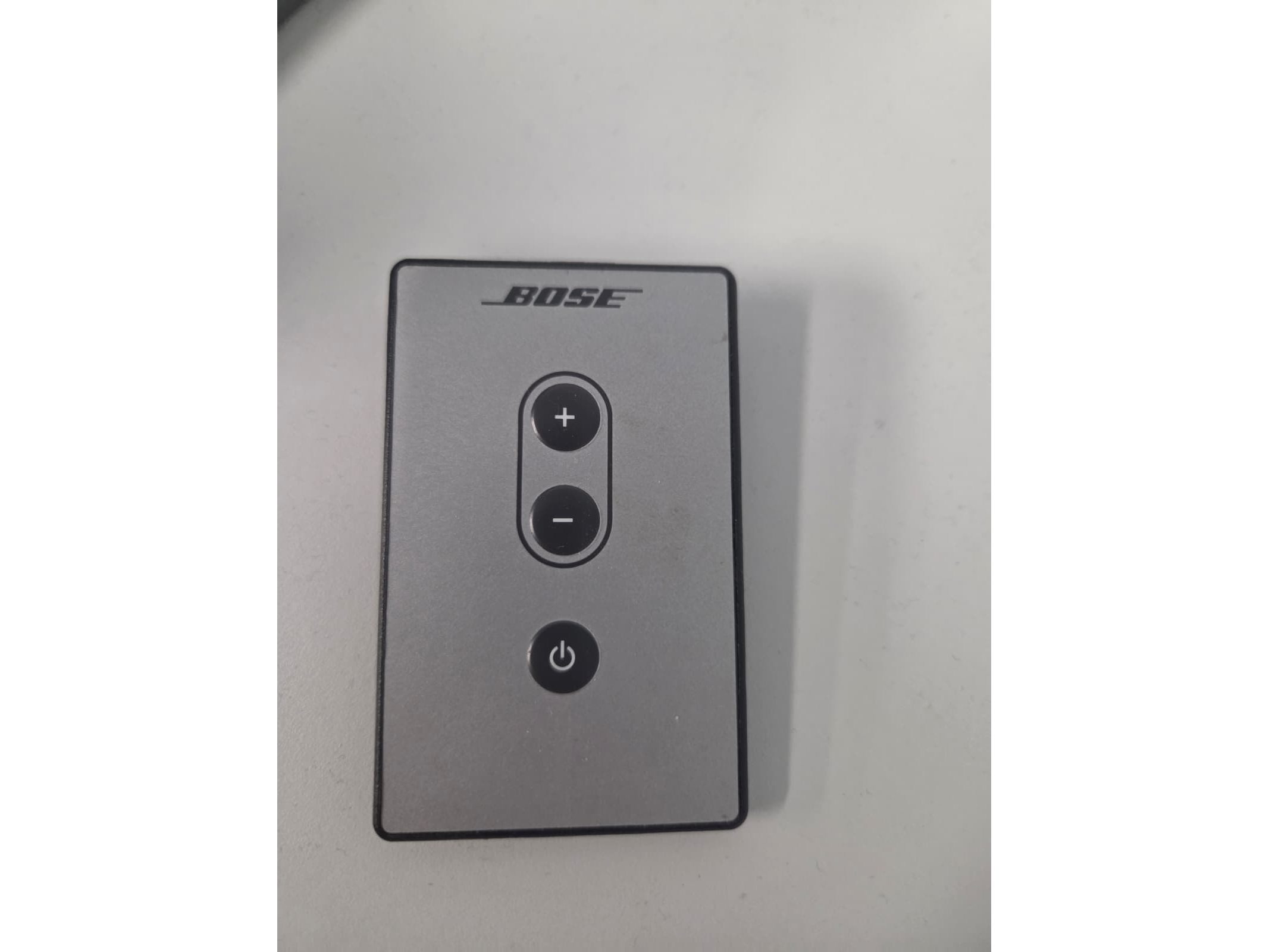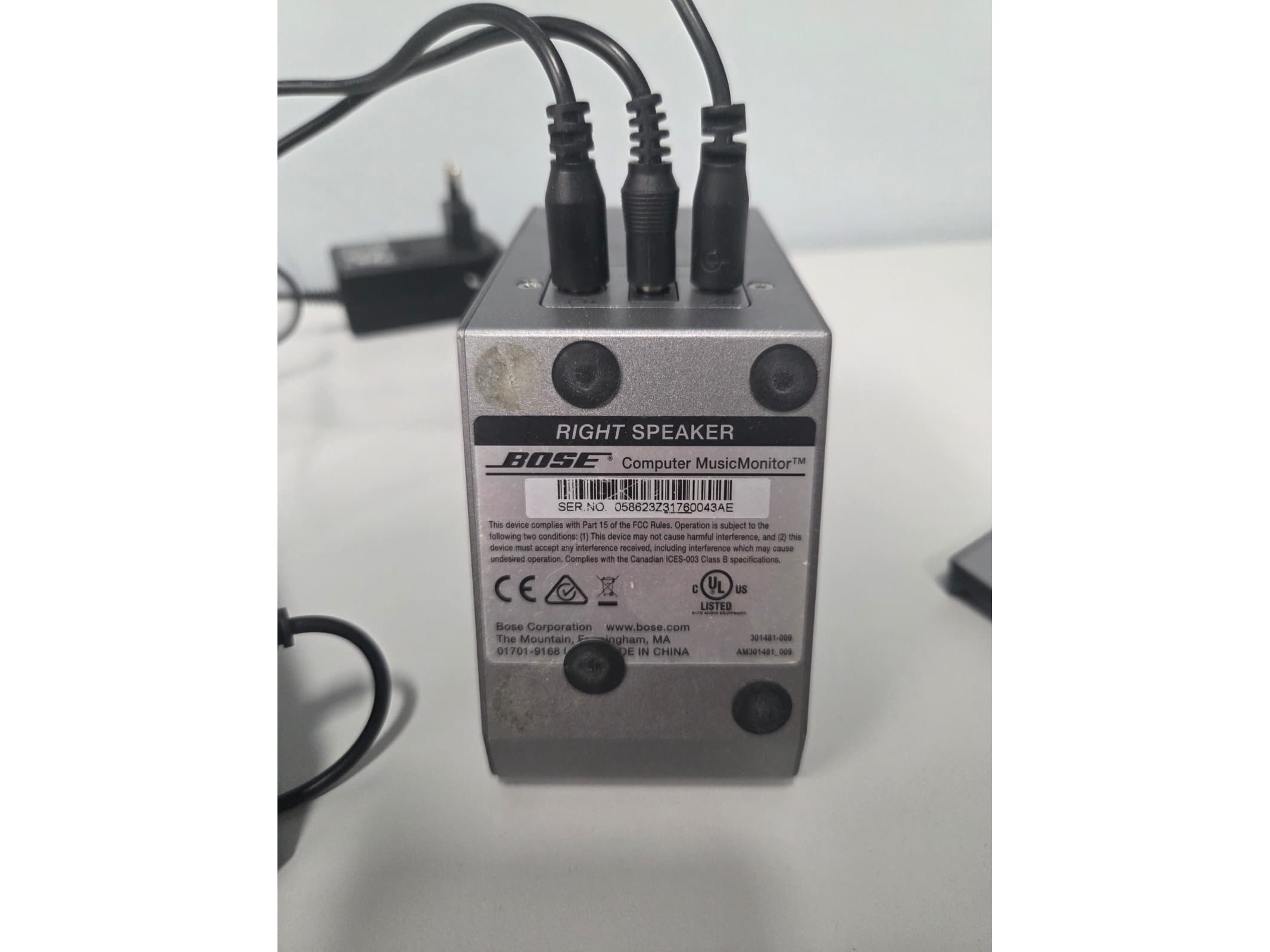 Bose speakers, model: Computer MusicMonitor, serial number: 058263Z31760043AE, dimensions: (2x) 95 mm x 75 mm x 100 mm. With remote control.