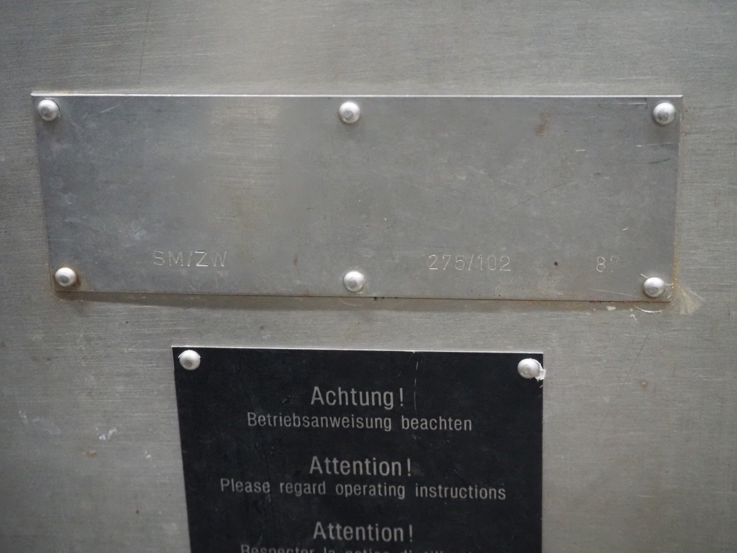 Kramer + Grebe GmbH & Co.KG grinder/cutter, model: SM/ZW, number: 275/102, diameter plate: 110 mm, dimensions bowl: Ø 730 mm x 120 mm, total dimensions: 1650 mm x 1150 mm x 1140 mm. Missing knives and plates.