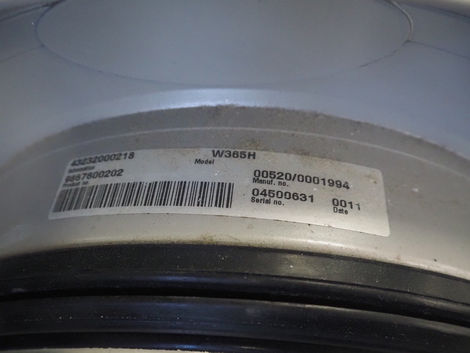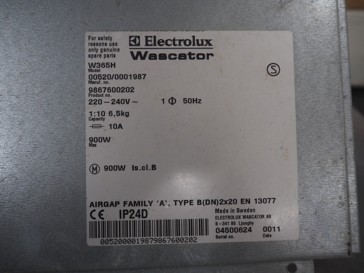 Electrolux washing machine, model: W365H, serial number: 04500624, 220/240 V, 1 Ph, 50 Hz, 10 A, 900 W, capacity: 6.5 kg, total dimensions: 720 mm x 680 mm x 1155 mm.