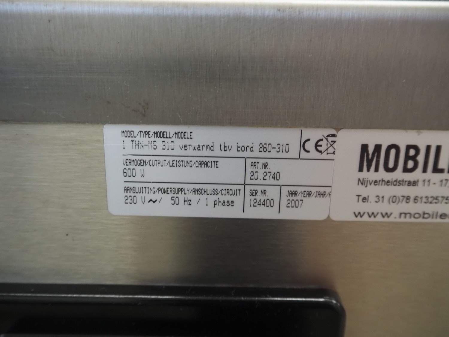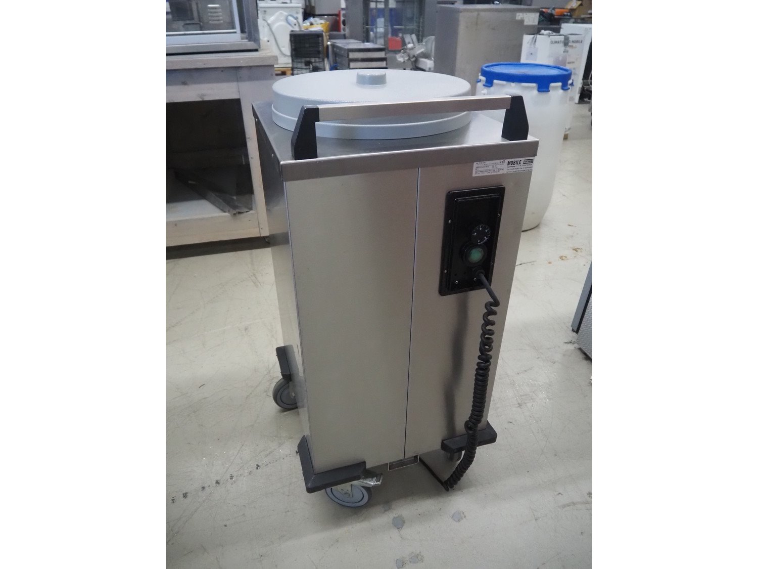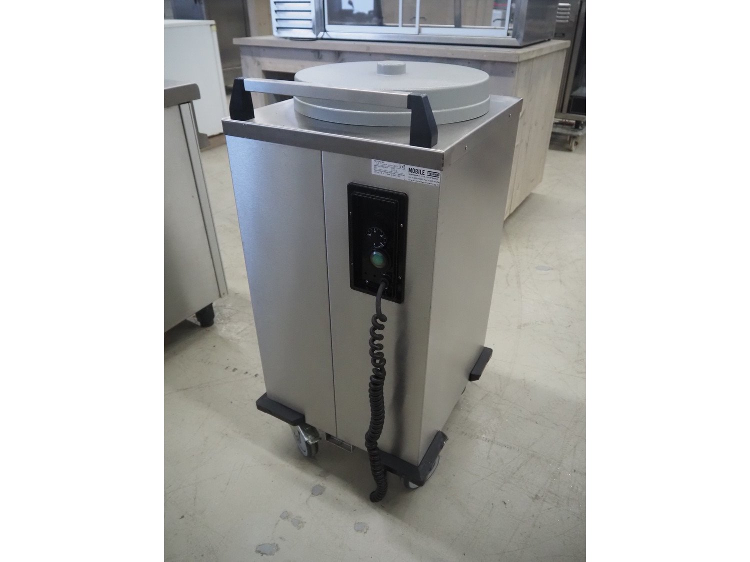 Mobile Containing mobile plate dispenser, model: THN-MS 310, serial number: 12440, year of construction: 2007, 230 V, 1 Ph, 50 Hz, 600 W, clearance: Ø 310 mm, total dimensions: 500 mm x 470 mm x 980 mm.