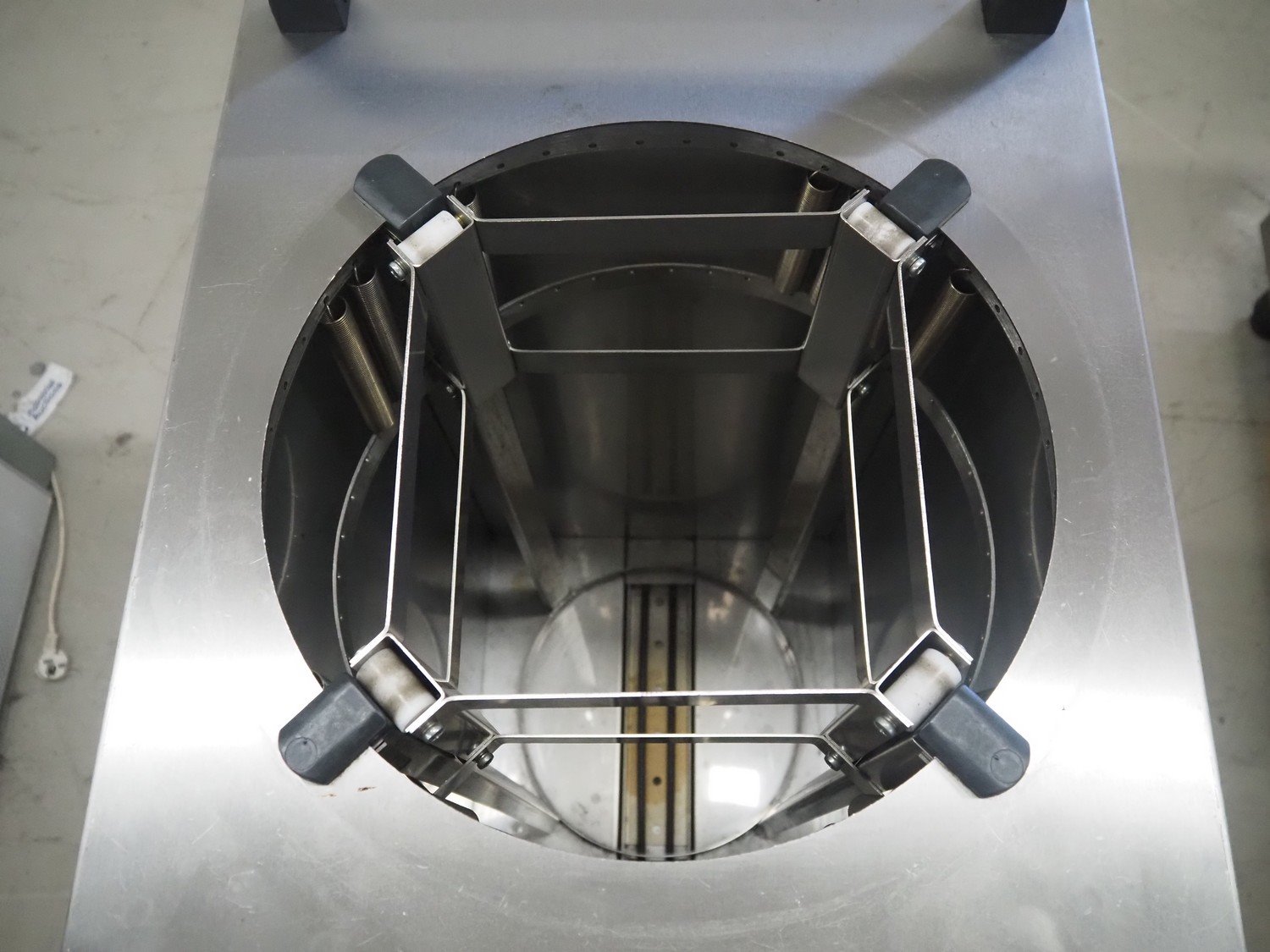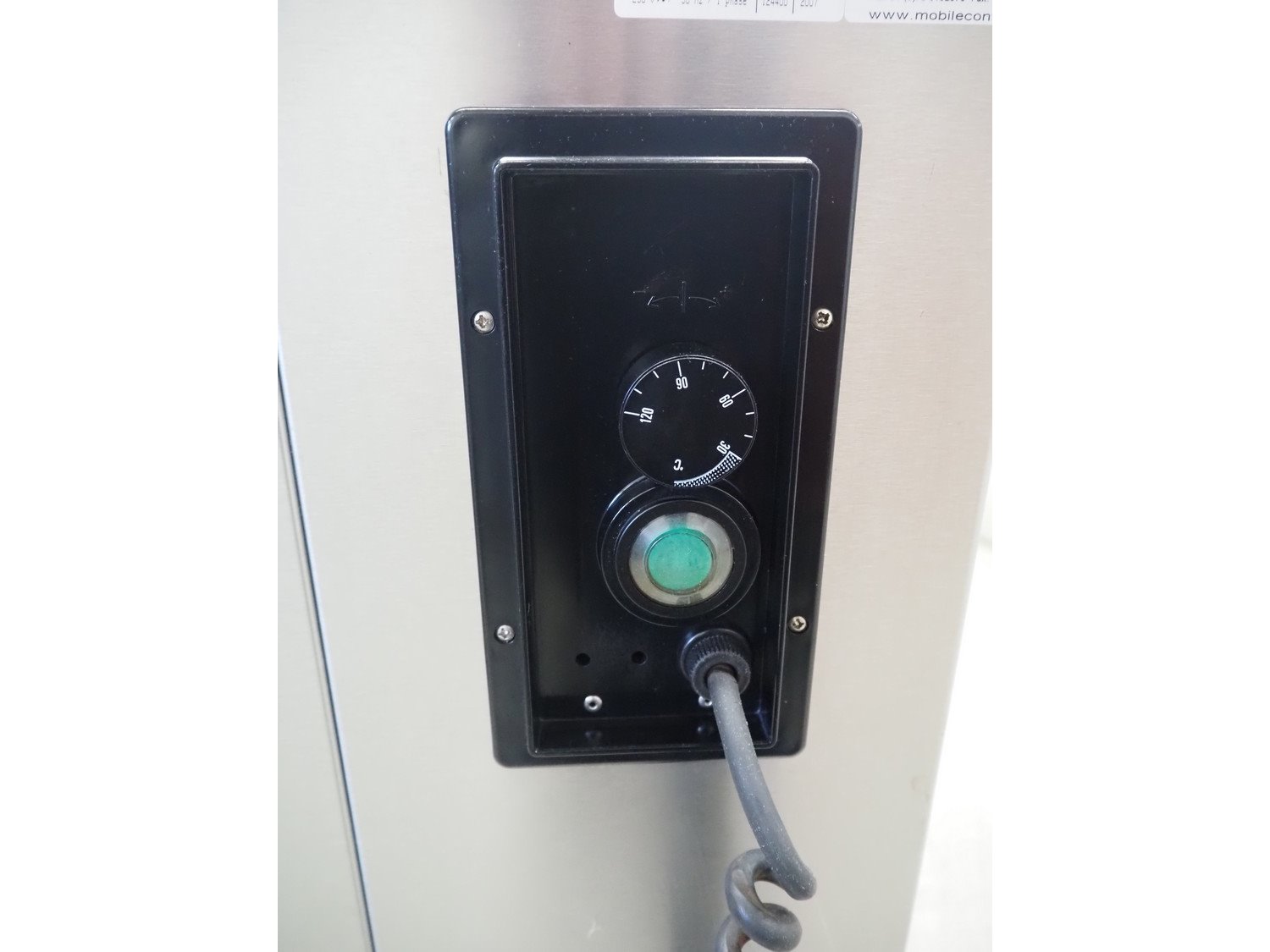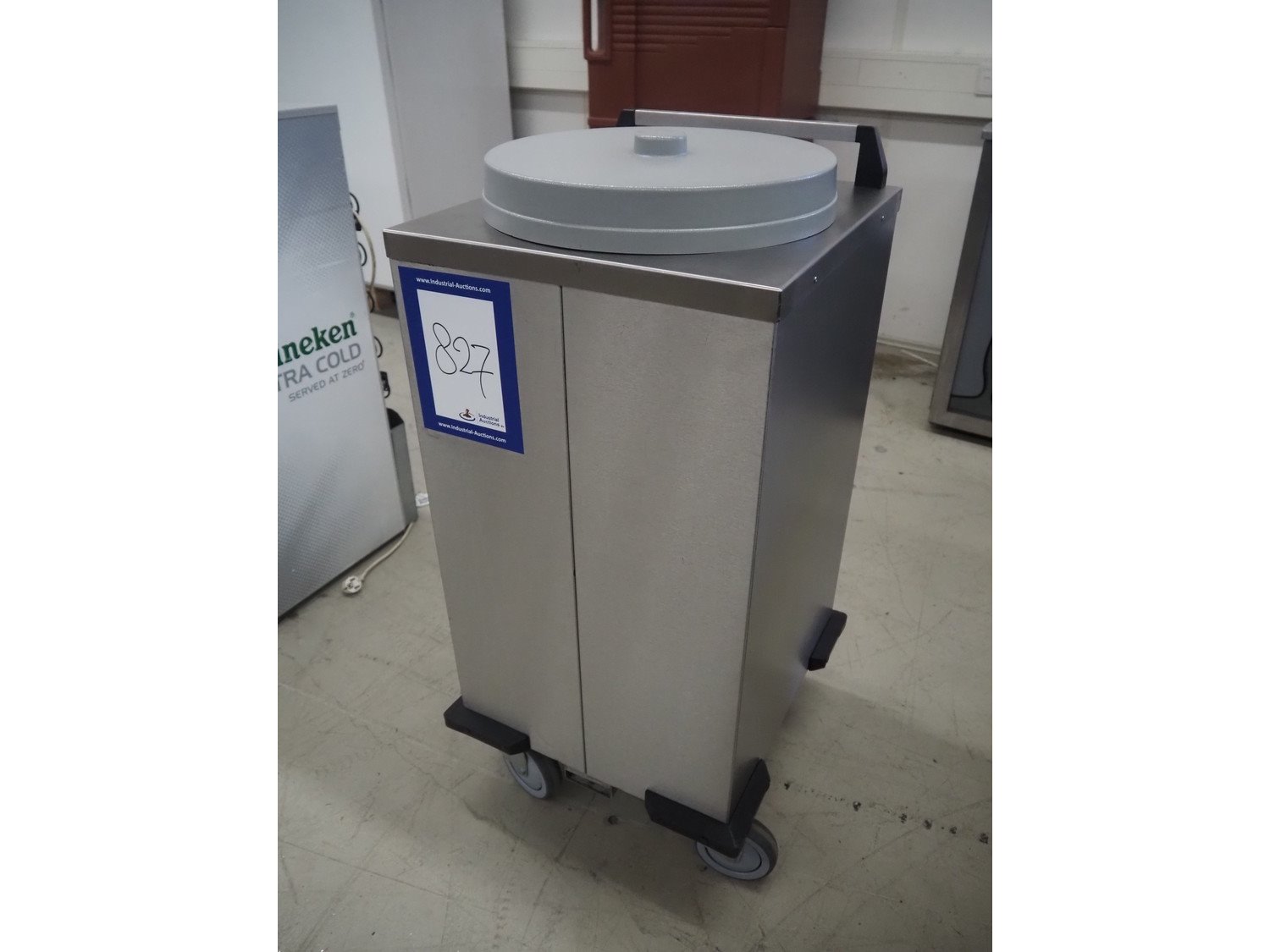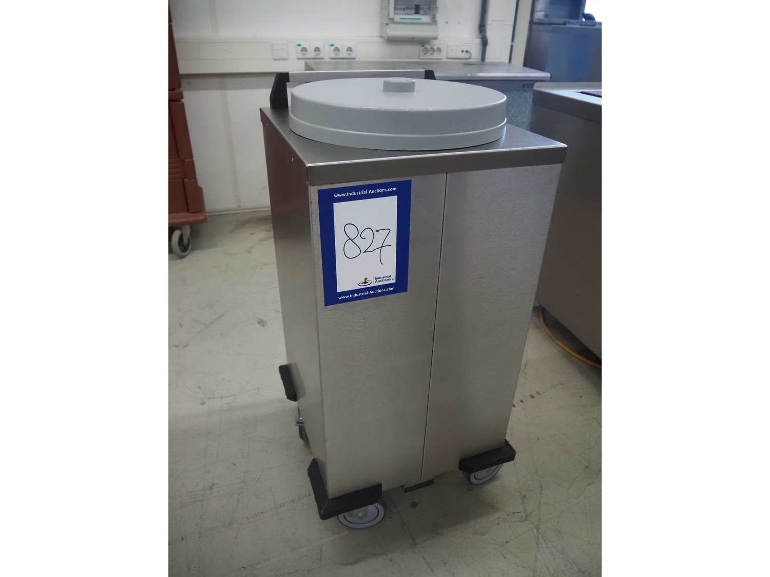 Mobile Containing mobile plate dispenser, model: THN-MS 310, serial number: 12440, year of construction: 2007, 230 V, 1 Ph, 50 Hz, 600 W, clearance: Ø 310 mm, total dimensions: 500 mm x 470 mm x 980 mm.