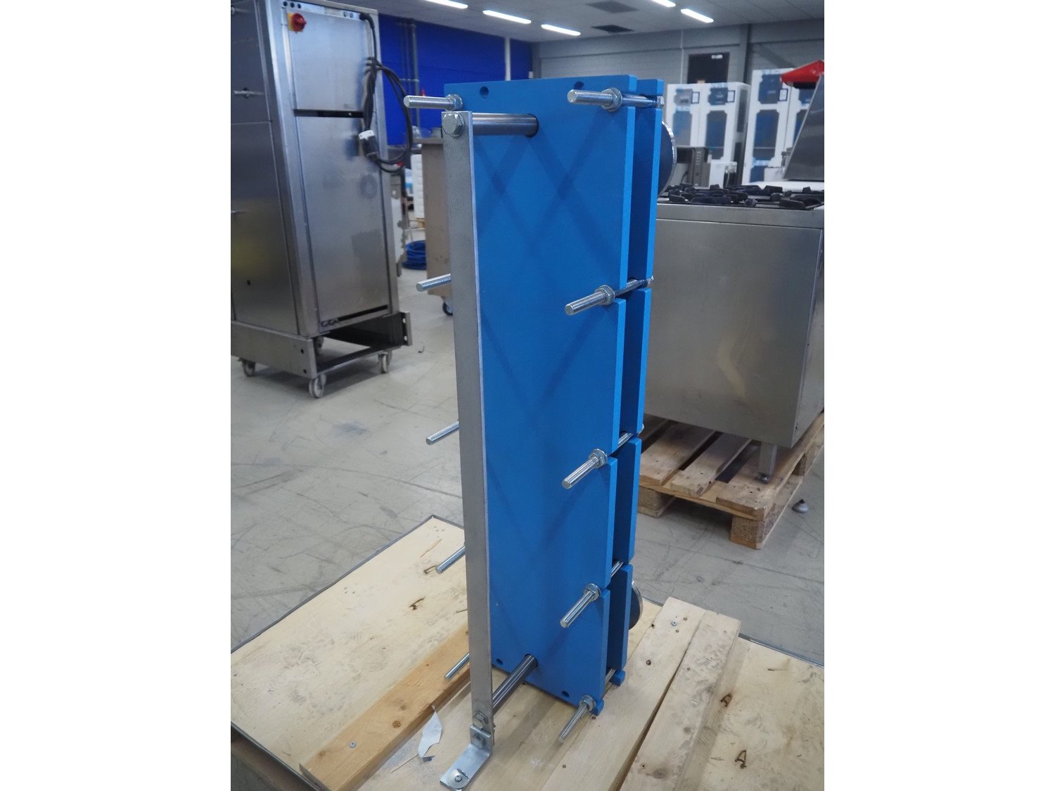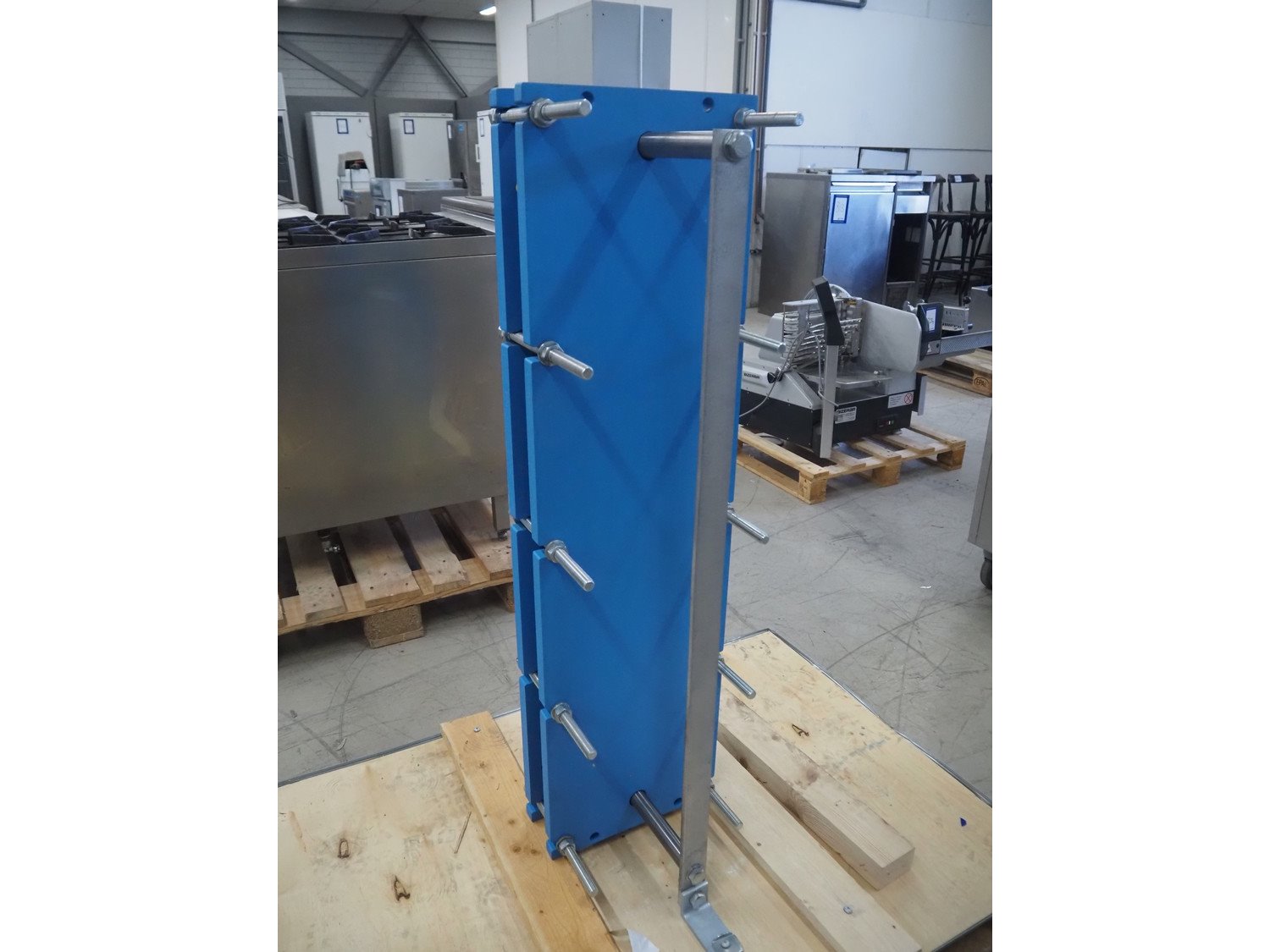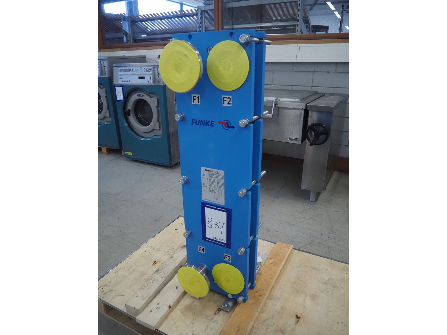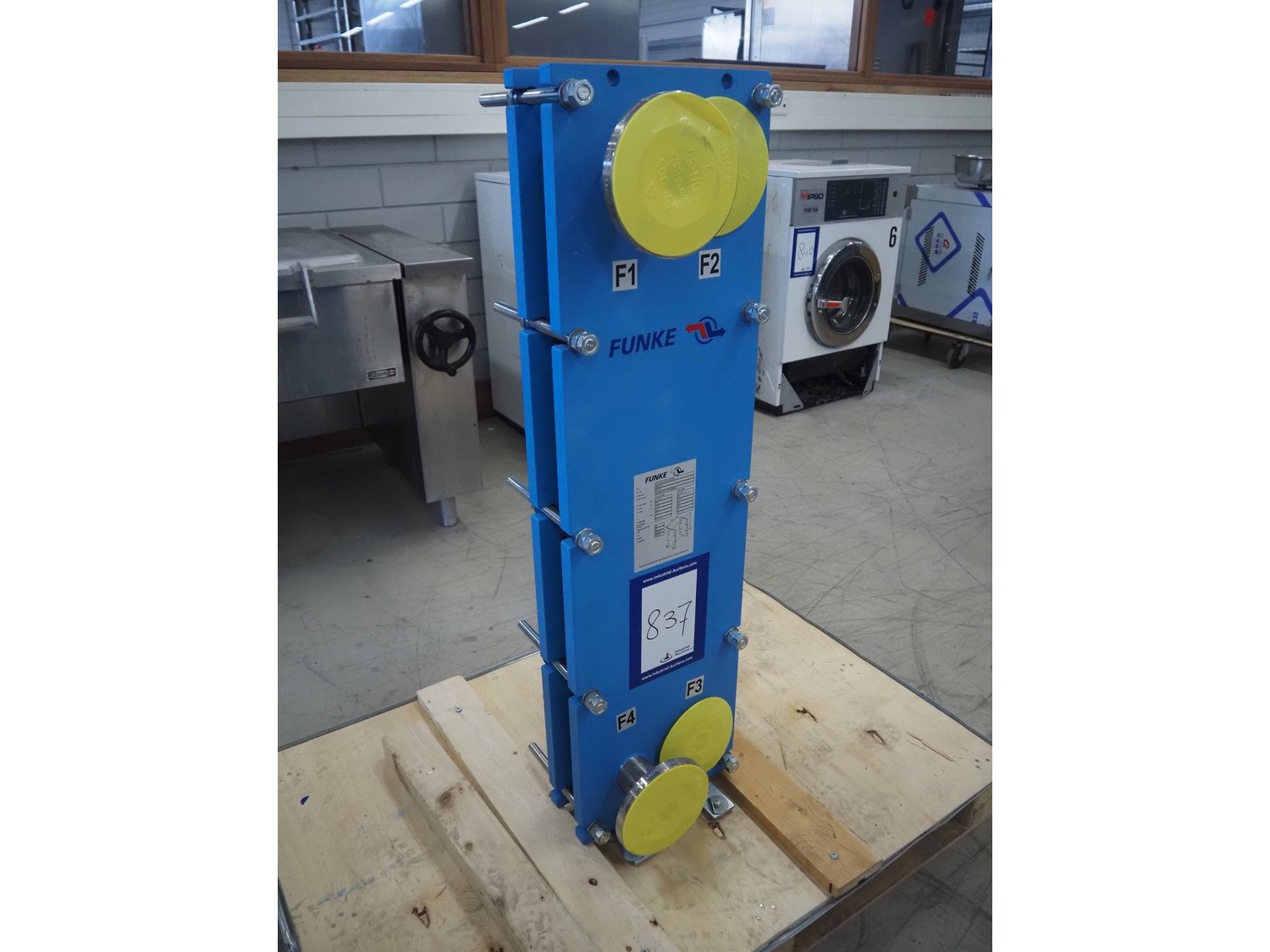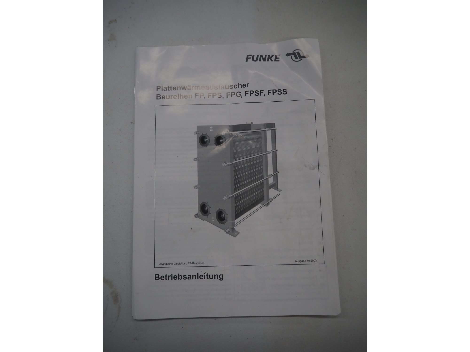 Funke plate heat exchanger, type: FP 22-23-1-NH-0 10.0 bar, serial number: 761177, year of construction: 06.2014, PS min/max: 0/10.0 bar, TS min 0.0 °C, TS max 110.0 °C, volume: 4.8 liter, dimensions: 330 mm x 350 mm x 1150 mm.