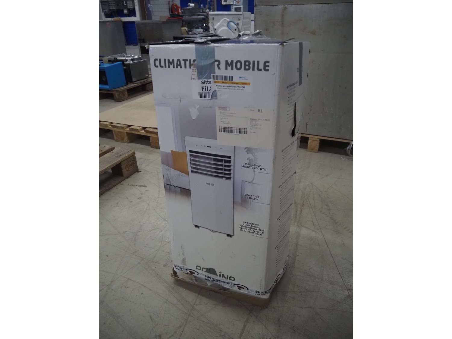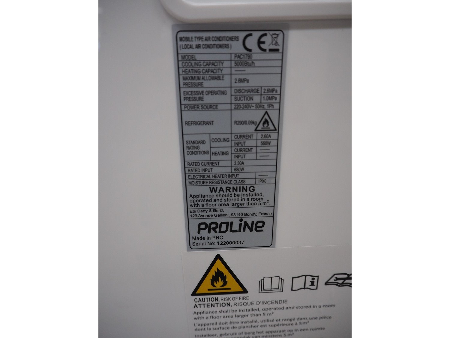 Proline air conditioning unit, model: PAC1790, serial number: 122000037, 220-240 V, 1 Ph, 50 Hz, 2.6 A, 560 W, refrigerant: R290, 0.09 kg, dimensions: 400 mm x 400 mm x 800 mm.
