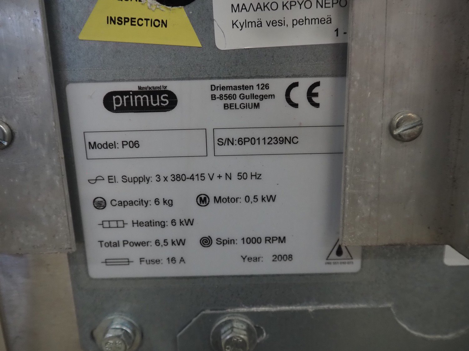 Primus washing machine, model: P06, serial number: 6P011239NC, year of construction: 2008, 380-415 V, 3 Ph, 50 Hz, 16 A, capacity: 6 kg, dimensions: 640 mm x 685 mm x 1260 mm.
