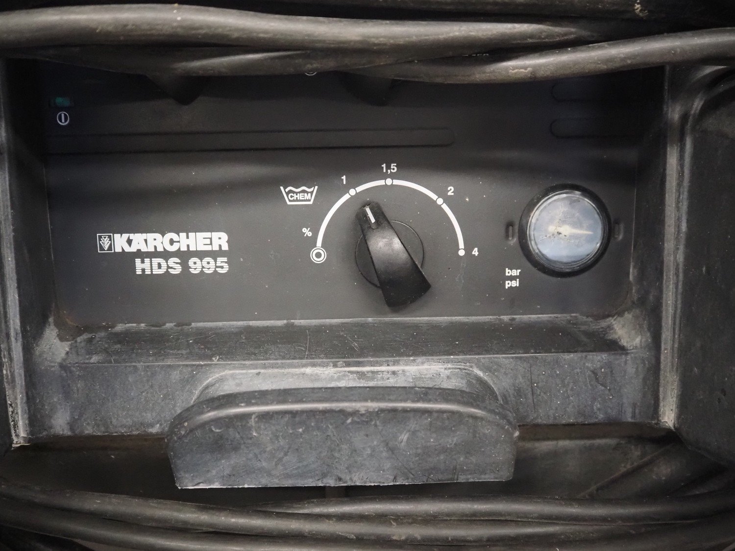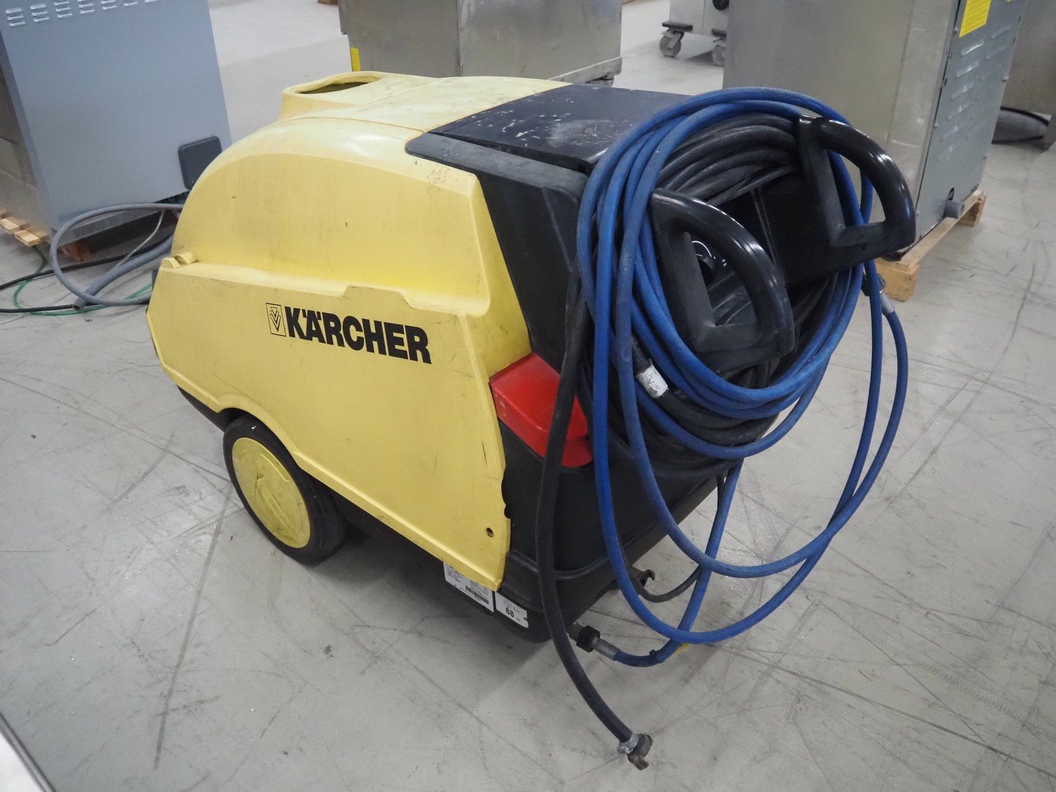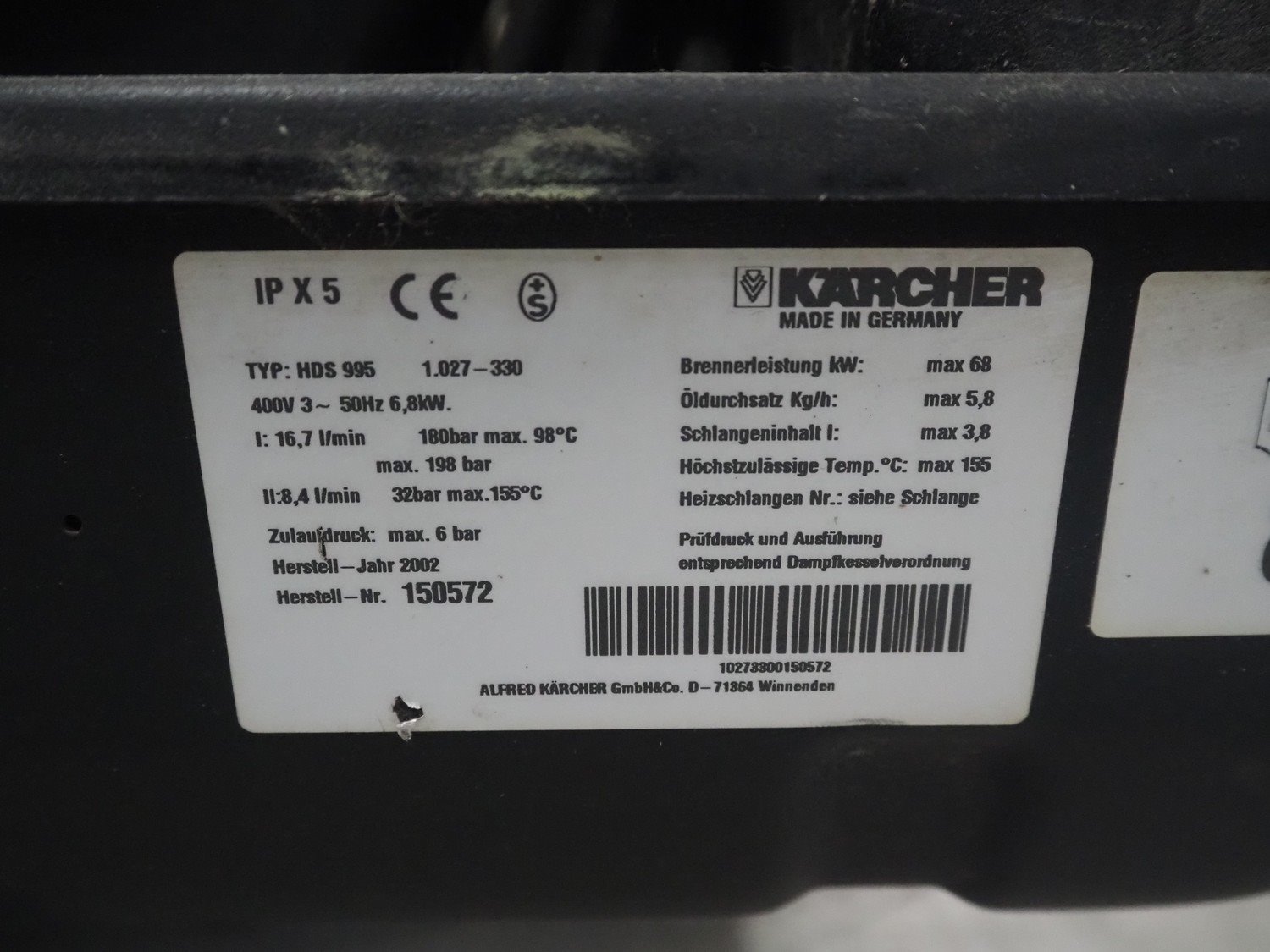 Kärcher mobile high pressure cleaner, type: HDS 995, number: 150572, year of construction: 2002, 400 V, 3 Ph, 50 Hz, 6.8 kW, dimensions: 1400 mm x 600 mm x 900 mm.
