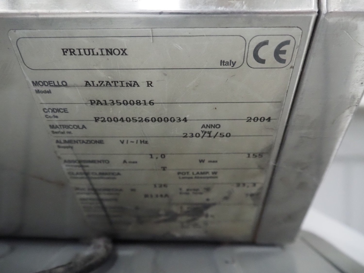 Friulinox saladette, model: Alzatina R, serial number: F200405260000034, year of construction: 2004, 230 V, 1 Ph, 50 Hz, 1.0 A, 155 W, refrigerant: R134a, 70 gram, dimensions: 1600 mm x 300 mm x 300 mm.