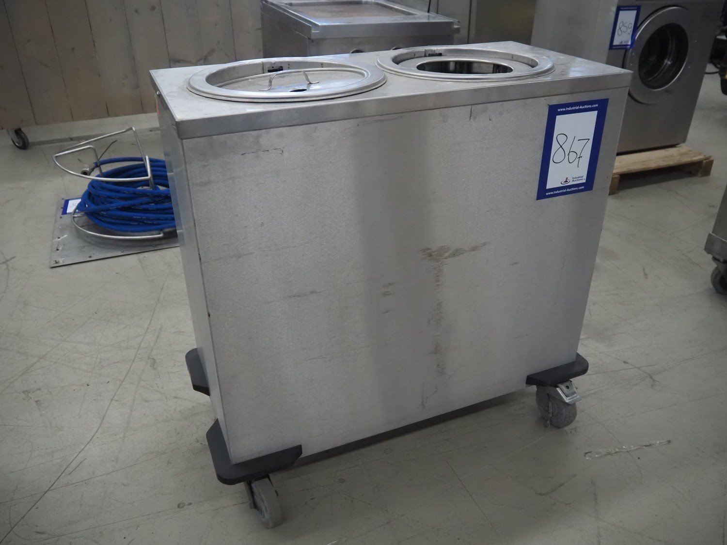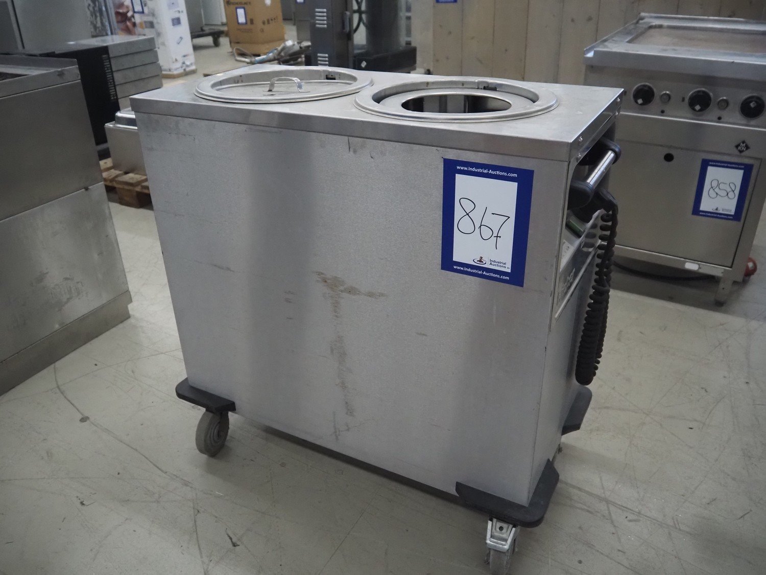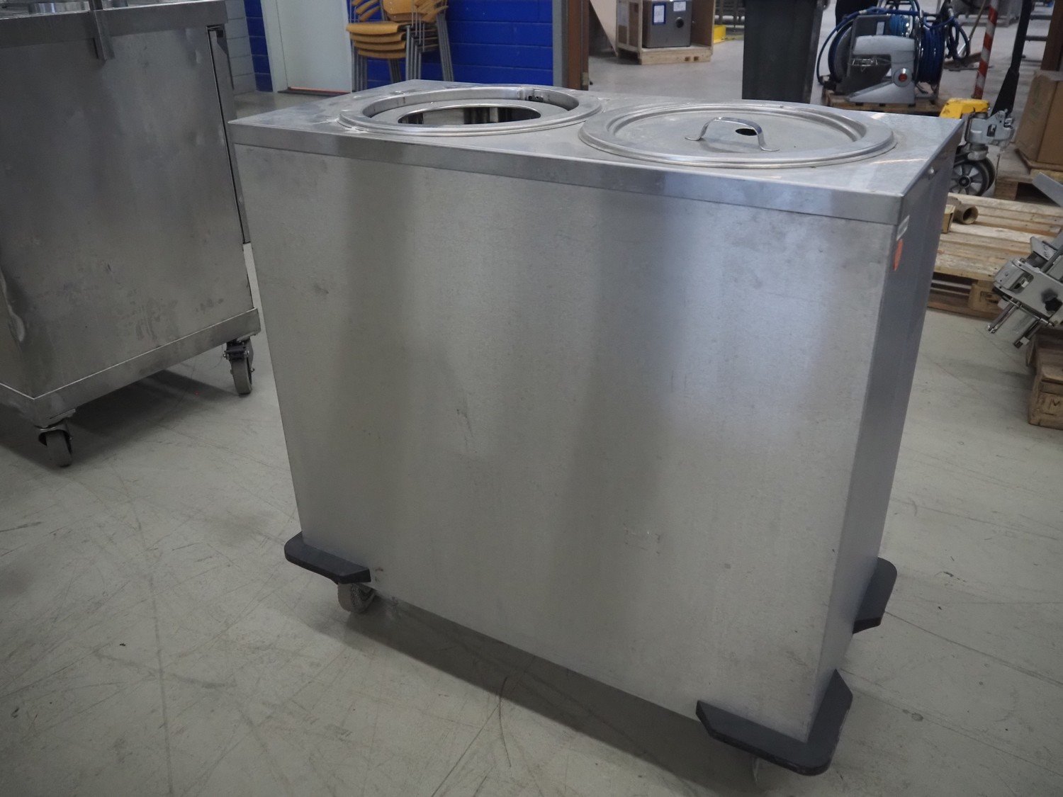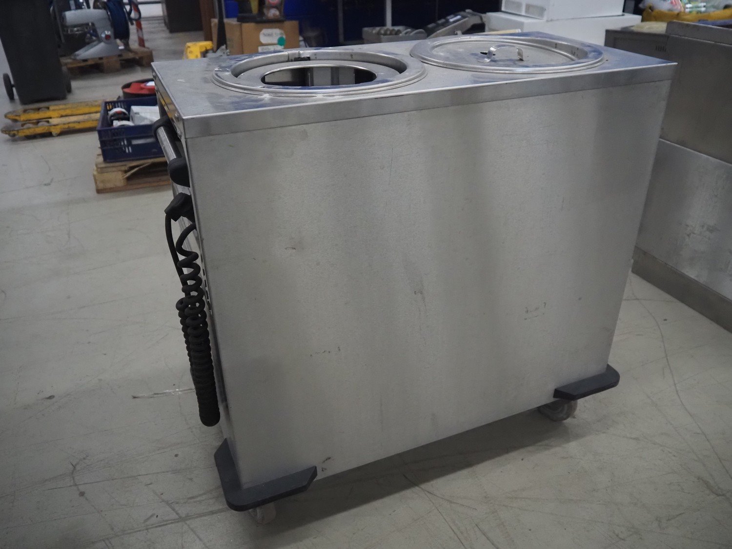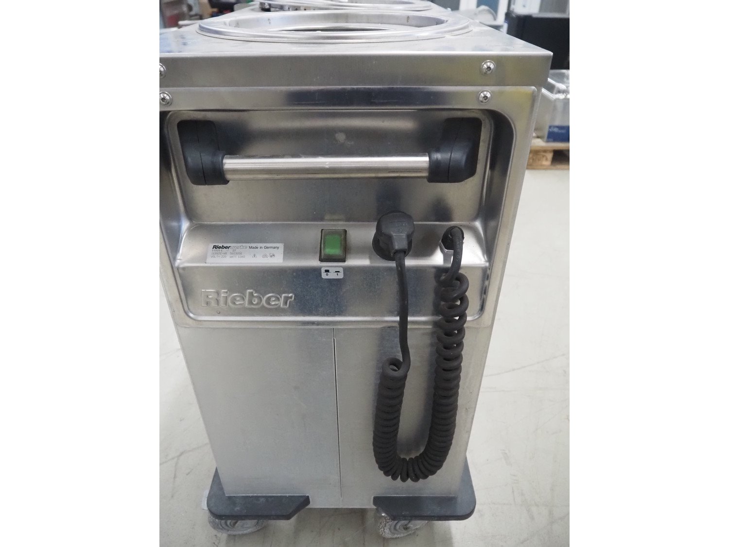Rieberwerke mobile plate dispenser, type: RRH-2, number: 5603056, 220 V, 1340 Watt, plate diameter: 300 mm, total dimensions: 940 mm x 480 mm x 910 mm.