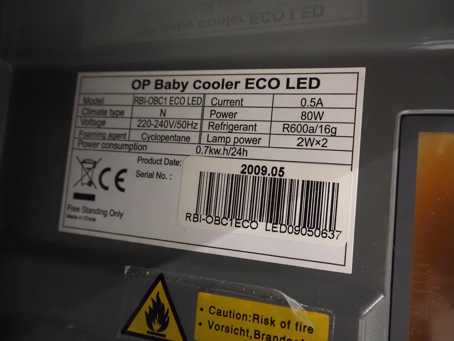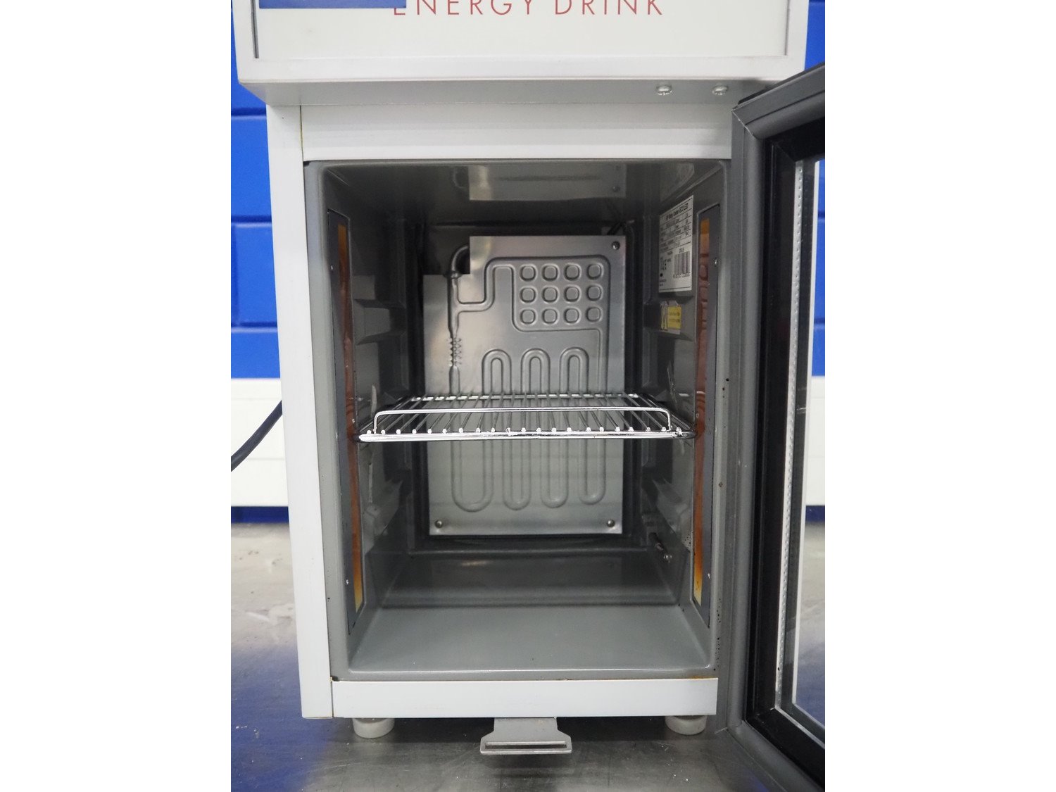 Red Bull refrigerator, model: RBI-OBC1 ECO LED, serial number: RBI-OBC1ECO LED09050637, year of construction: 05.2009, 220/240 V, 50 Hz, 0.5 A, 80 W, refrigerant: R600a, 16 g, 1 floor, floor dimensions: 200 mm x 220 mm, total dimensions: 360 mm x 300 mm x 580 mm.