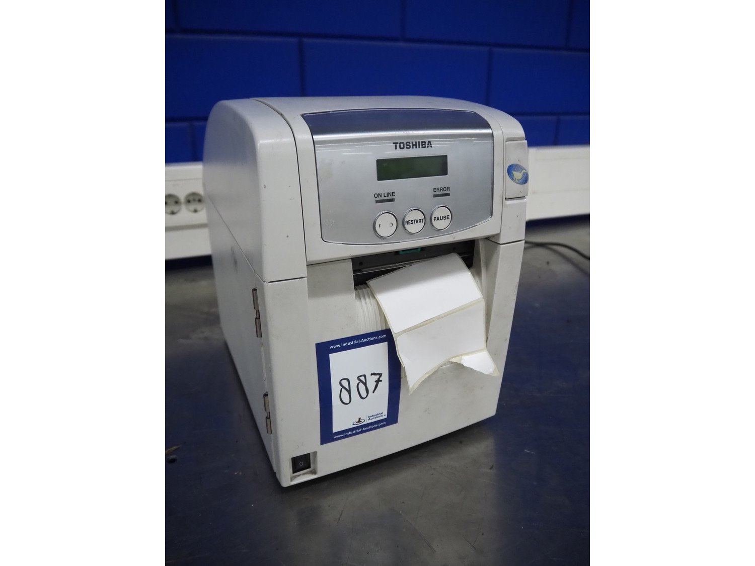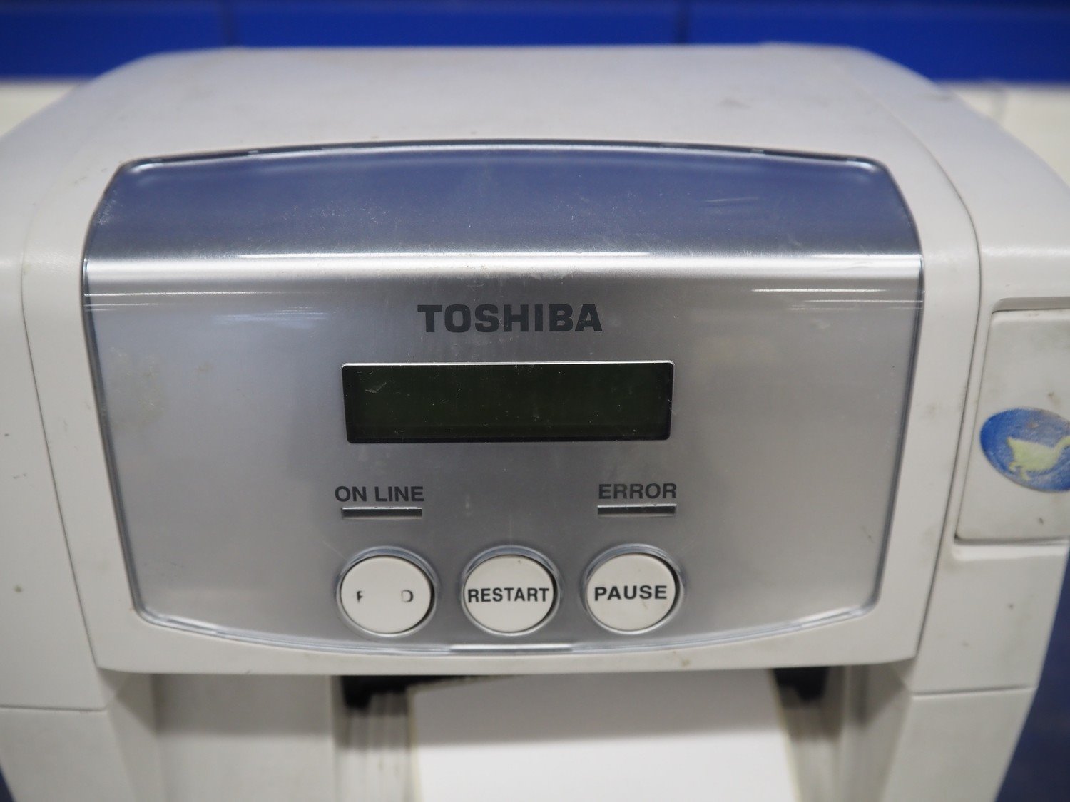 Toshiba label printer, model: B-SA4TP, serial number: 2305P120585, 100-240 V, 50-60 Hz, 2.1-1.1 A, dimensions: 350 mm x 250 mm x 1200 mm.