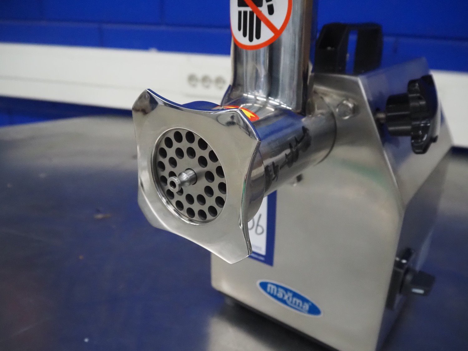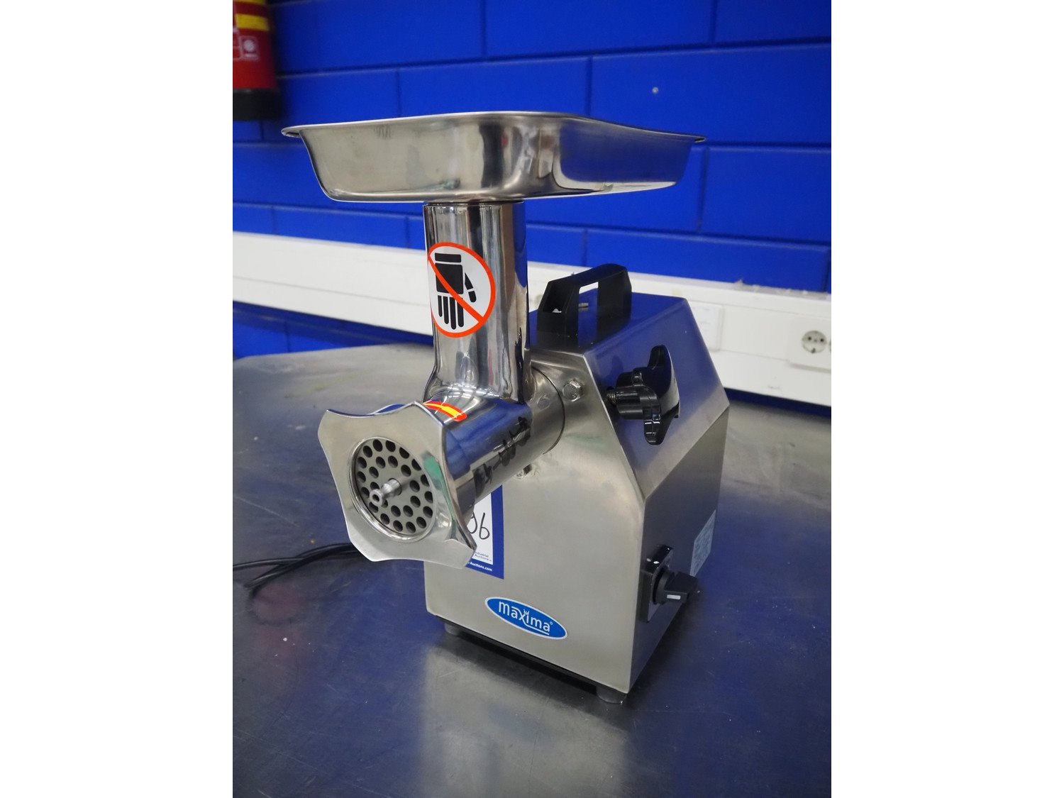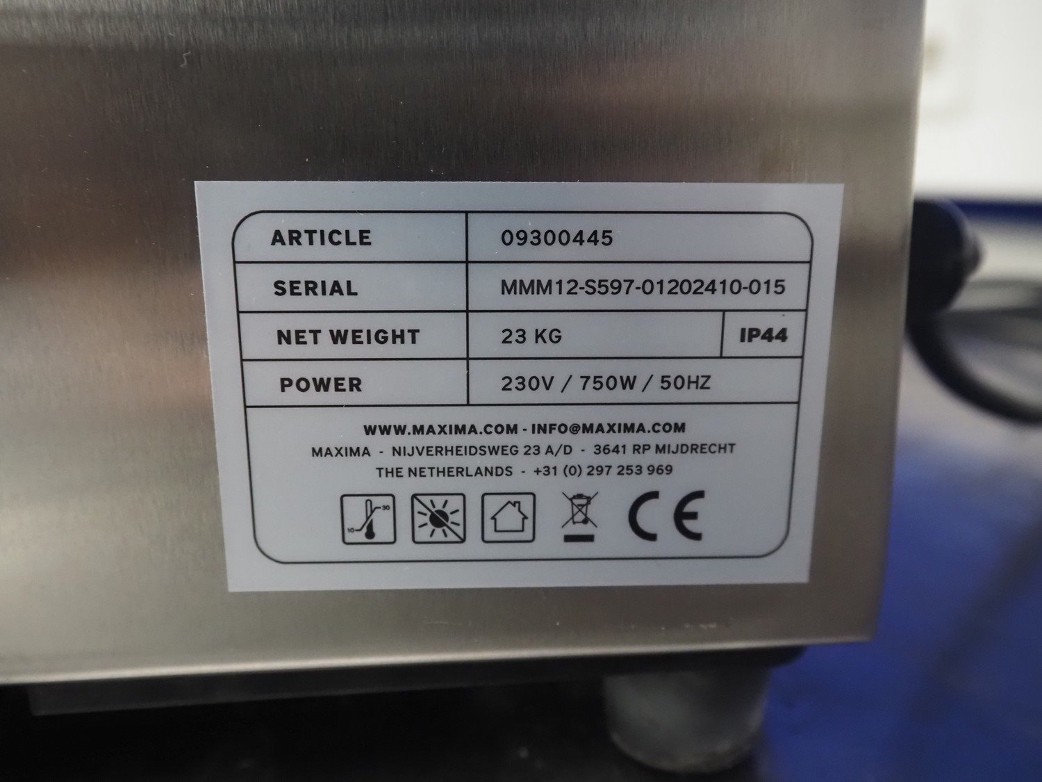 Maxima table model grinder, model: 09300445, serial number: MMM12-S597-01202410-015, 230 V, 1 Ph, 50 Hz, 750 W, weight: 23 kg, plate diameter: 70 mm, total dimensions: 440 mm x 250 mm x 460 mm.