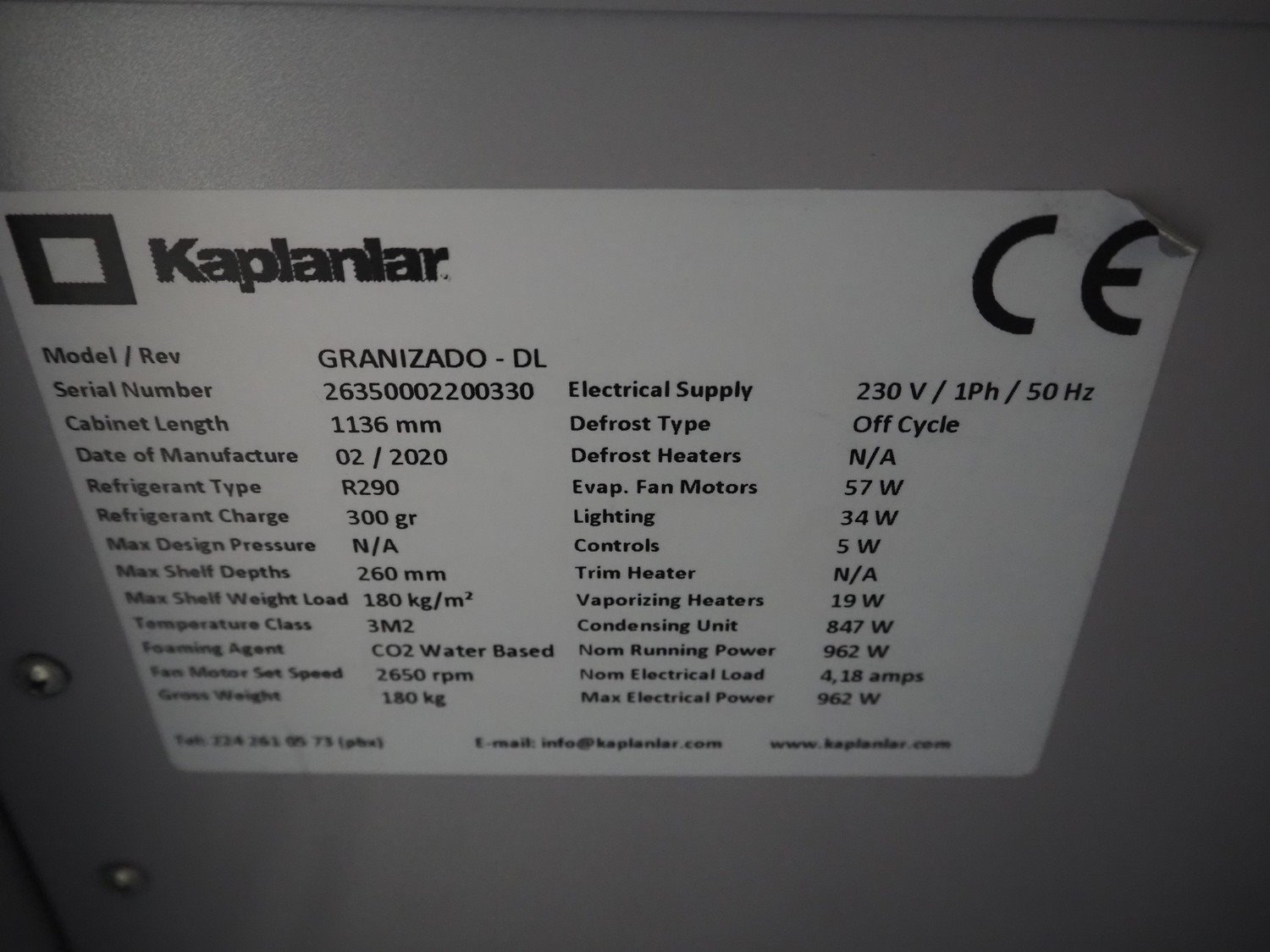 Kaplanlar refrigerated showcase, model: Granizado - DL, serial number: 26350002200330, year of construction: 02/2020, 230 V, 1 Ph, 50 Hz, 4.18 A, 962 W, refrigerant: R290, 300 gram, 4 floors, floor dimensions: 1130 mm x 260 mm, total dimensions: 1200 mm x 580 mm x 2200 mm.