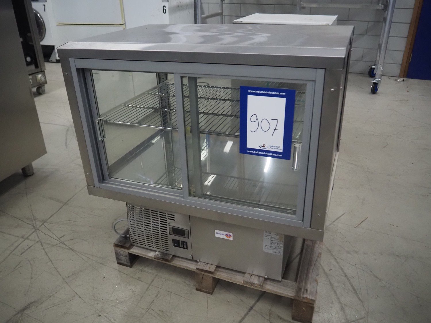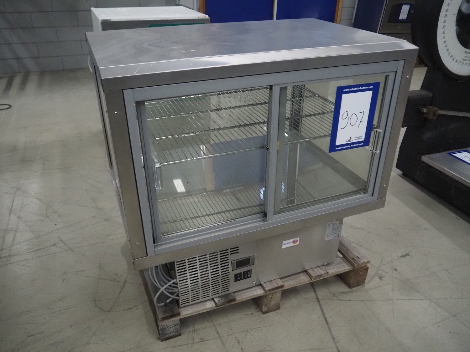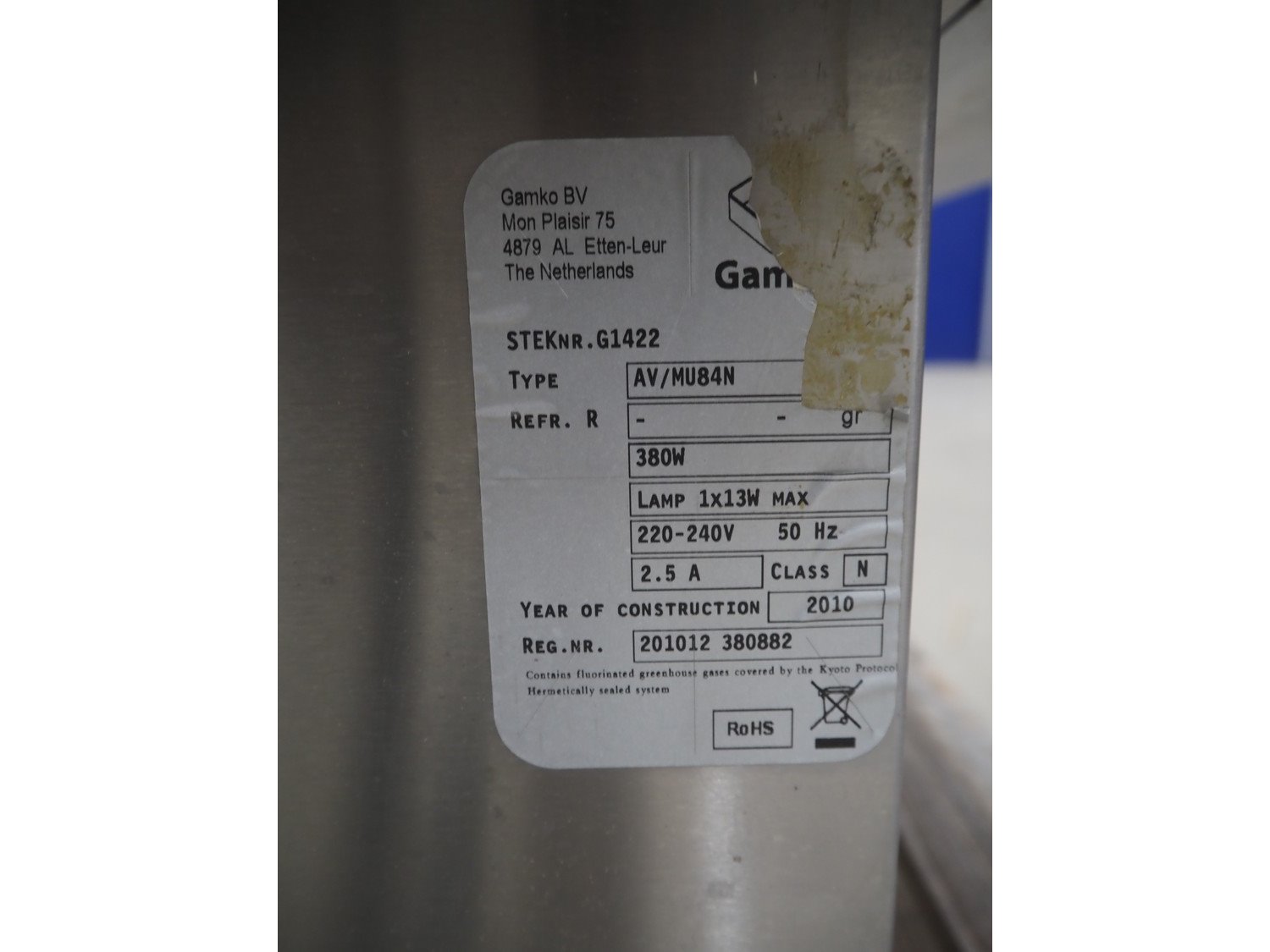 Gamko refrigerated display, type: AV/MU84N, year of construction: 2010, 220-240 V, 50 Hz, 2.5 A, 380 W, dimensions: 850 mm x 600 mm x 750 mm.