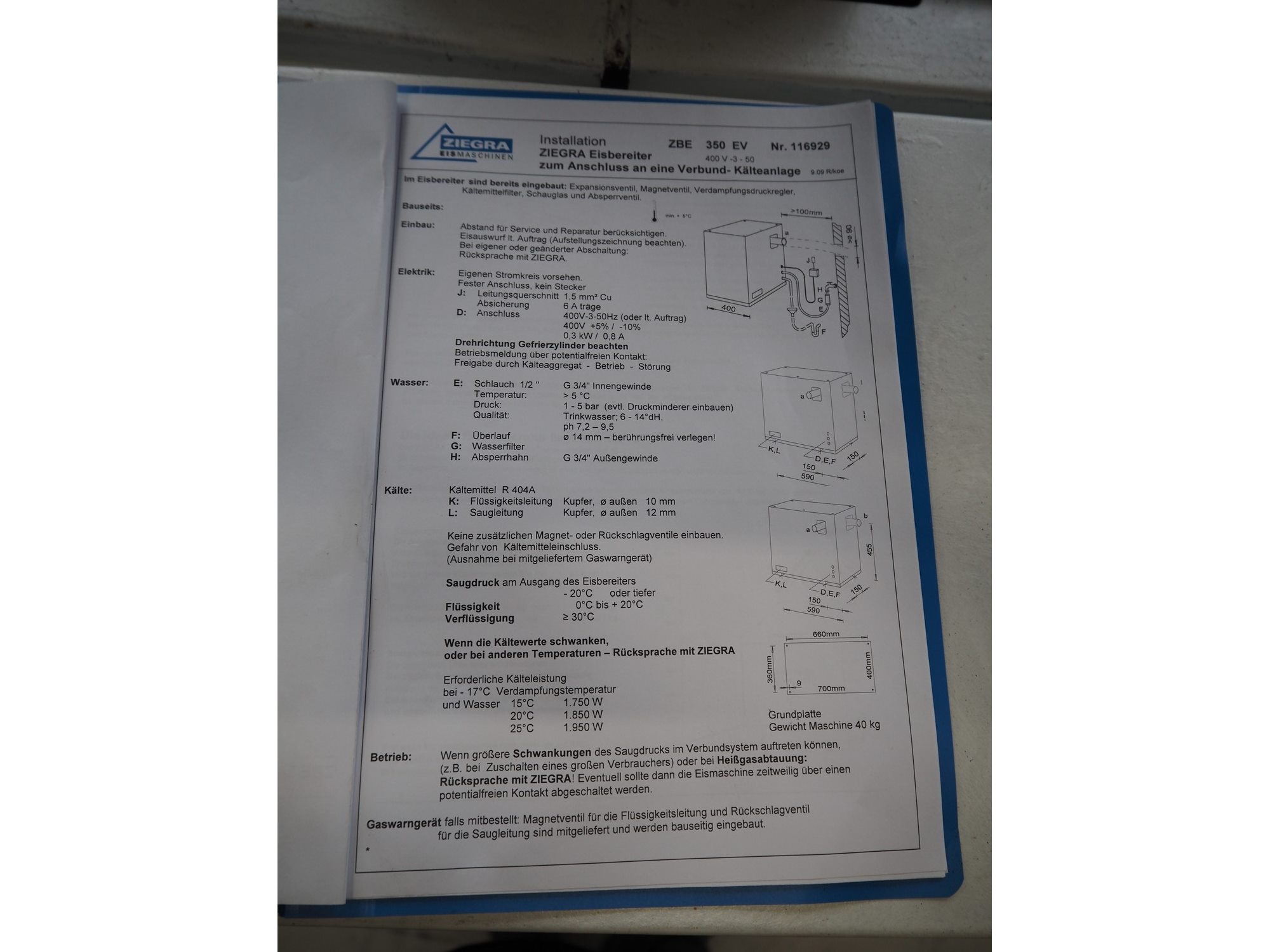 Ziegra-Eismaschinen ice machine, type: ZBE 550 EV, serial number: 116929, 400 V, 3 Ph, 50 Hz, 6 A, refrigerant: R 404A, dimensions: 800 mm x 660 mm x 1550 mm.