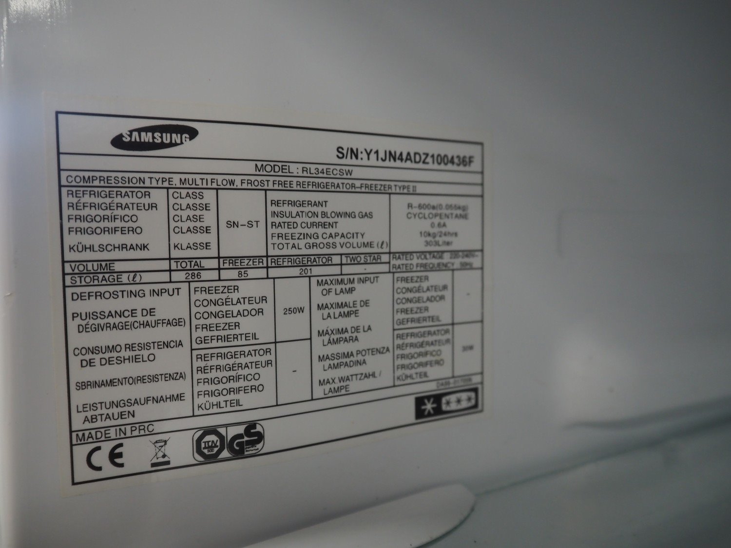 Samsung refrigerator with freezer, model: RL34ECSW, serial number: Y1JN4ADZ100436F, 220-240 V, 50 Hz, dimensions: 600 mm x 685 mm x 1775 mm. Display and frost free are not working, drawers are broken.
