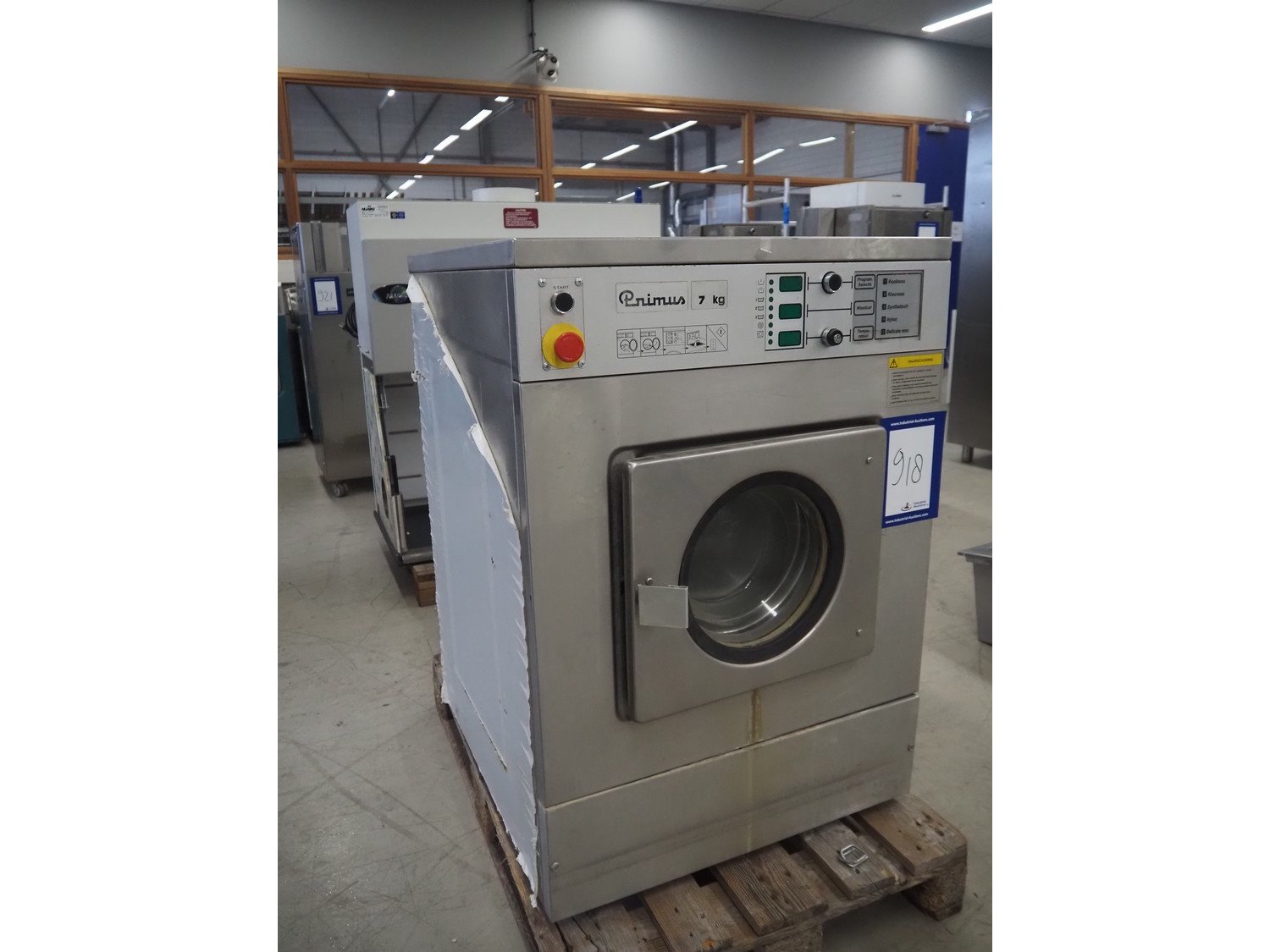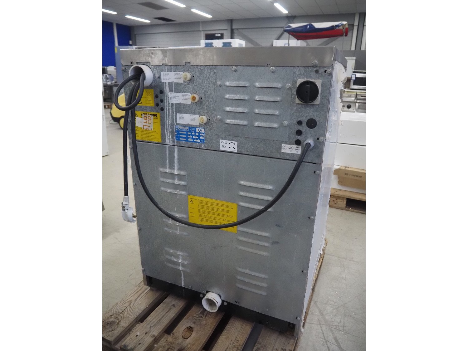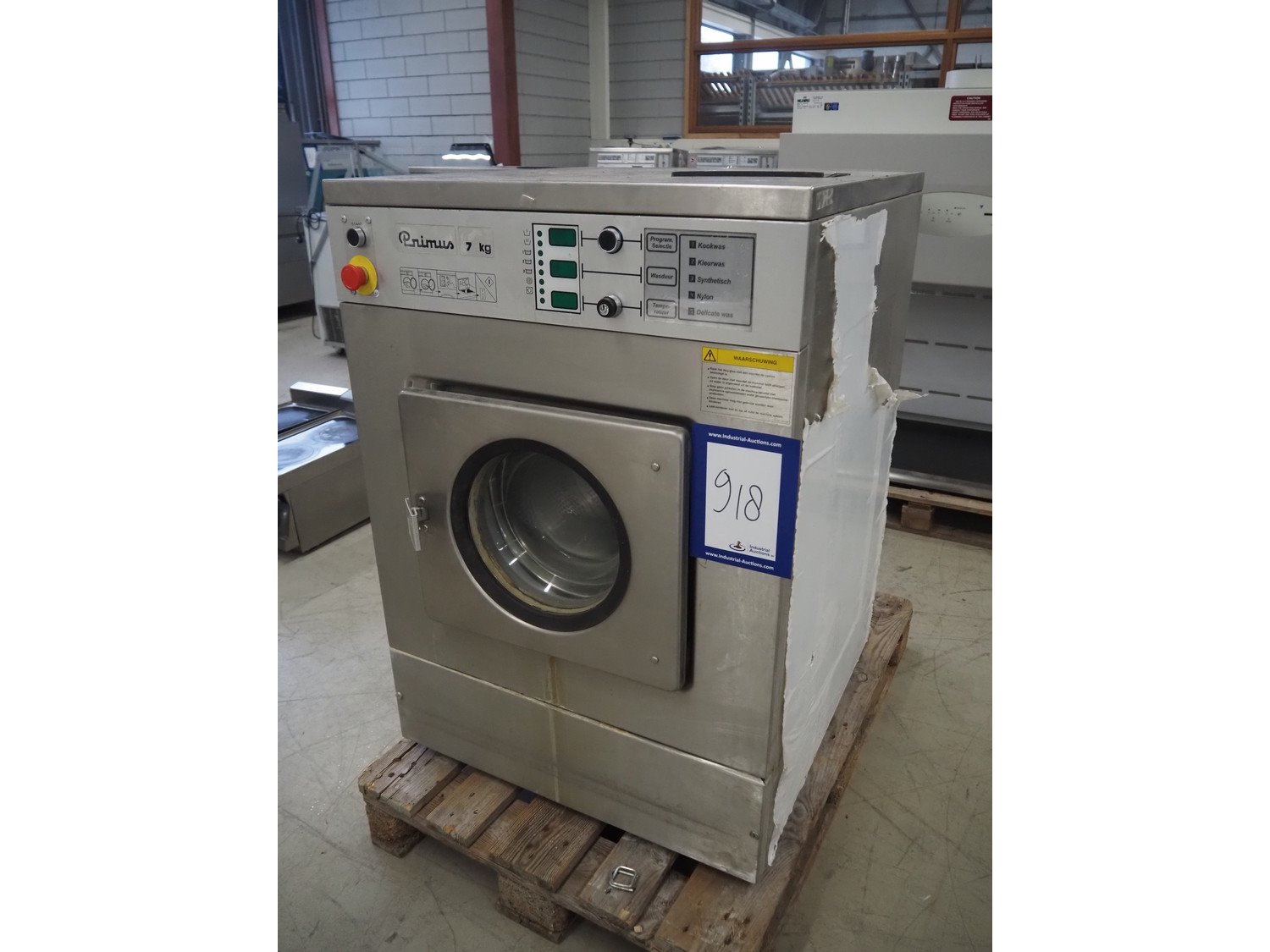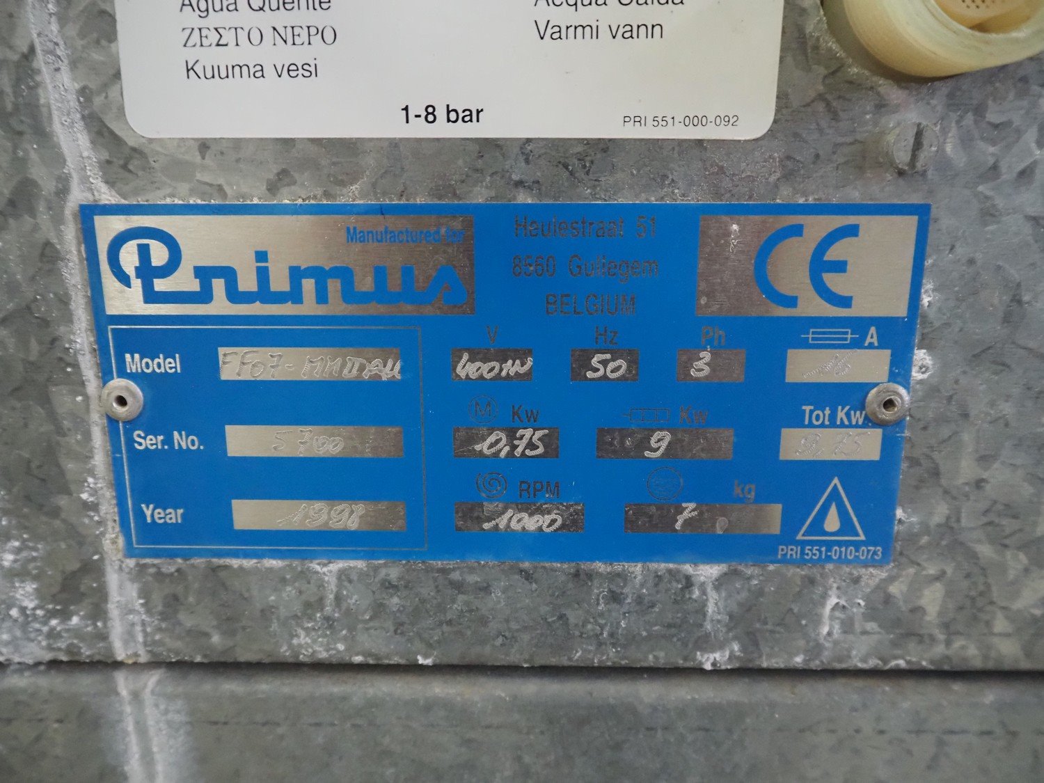 Primus washing machine, model: FF07-MNOALL, serial number: 5700, year of construction: 1998, 400 V, 3 Ph, 50 Hz, 16 A, 9.75 kW, capacity: 7 kg, dimensions: 750 mm x 870 mm x 1080 mm.