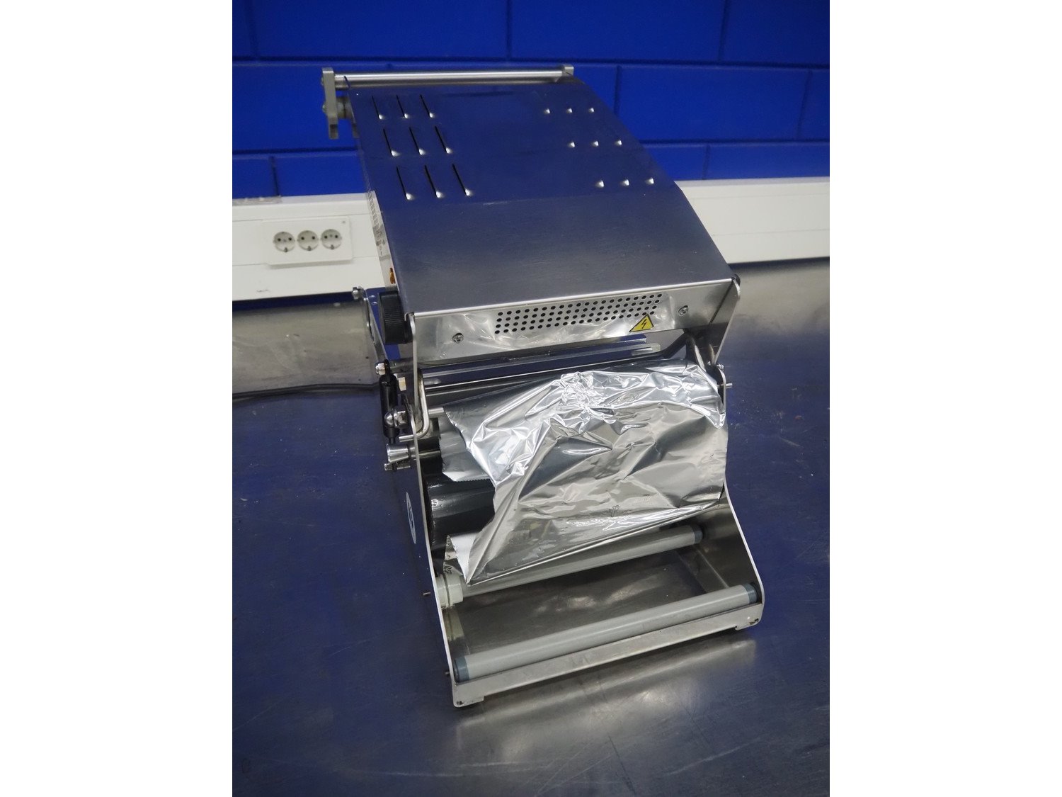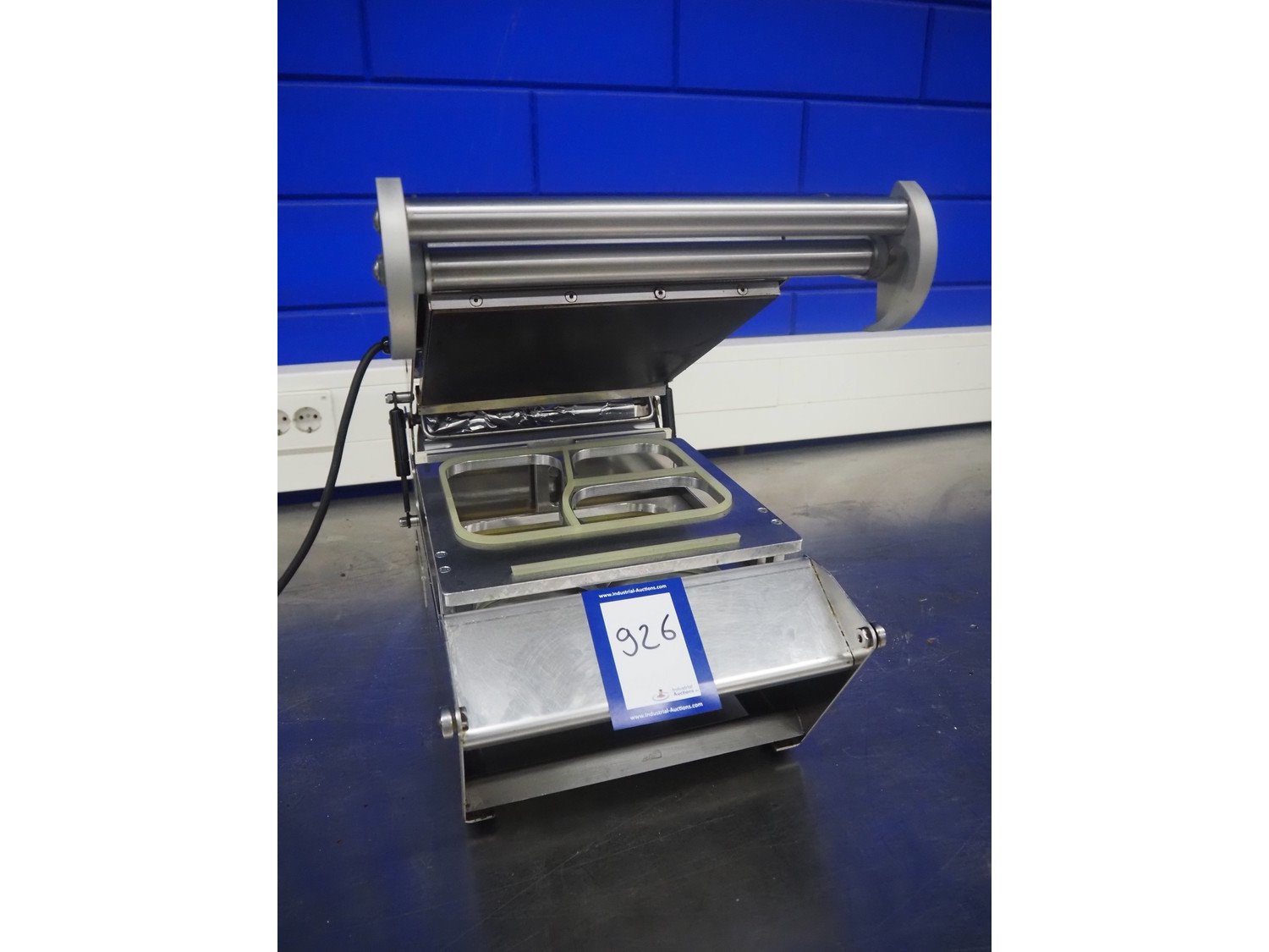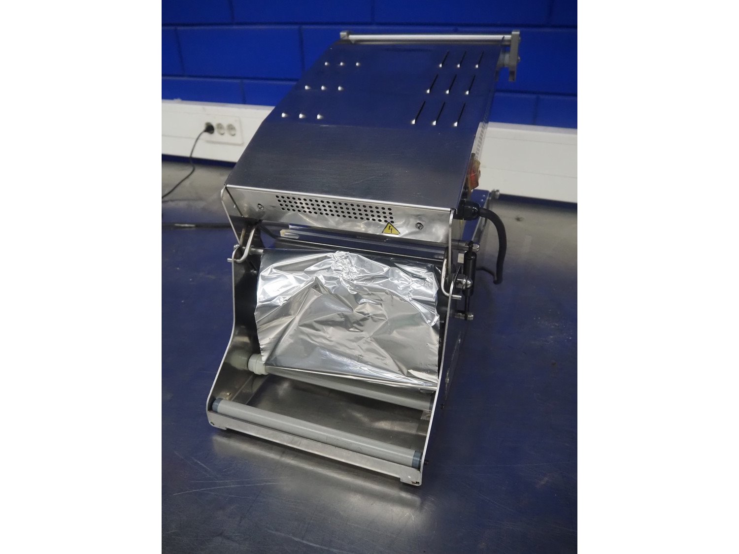 Inde Plastik traysealer, article number: IP 245, serial number: 2421, year of construction: 2010, 230 V, 50 Hz, 1000 W, dimensions dye: (2x) 105 mm x 105 mm and (1x) 225 mm x 125 mm, film width: 245 mm, total dimensions: 700 mm x 340 mm x 320 mm.