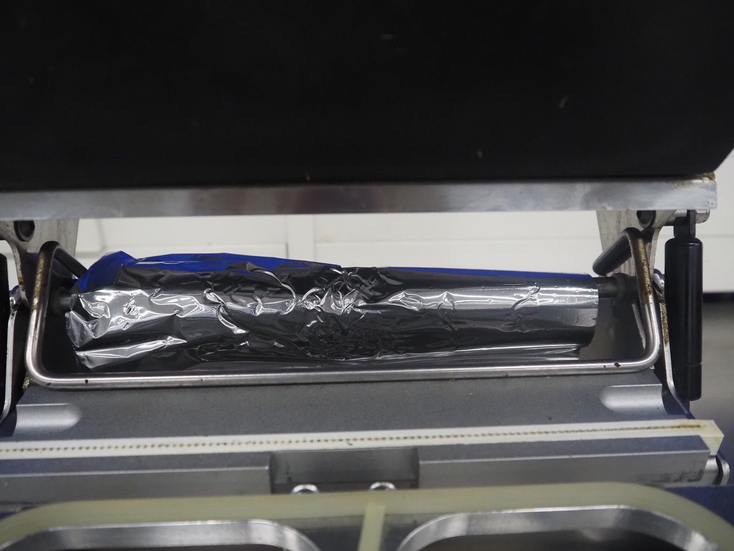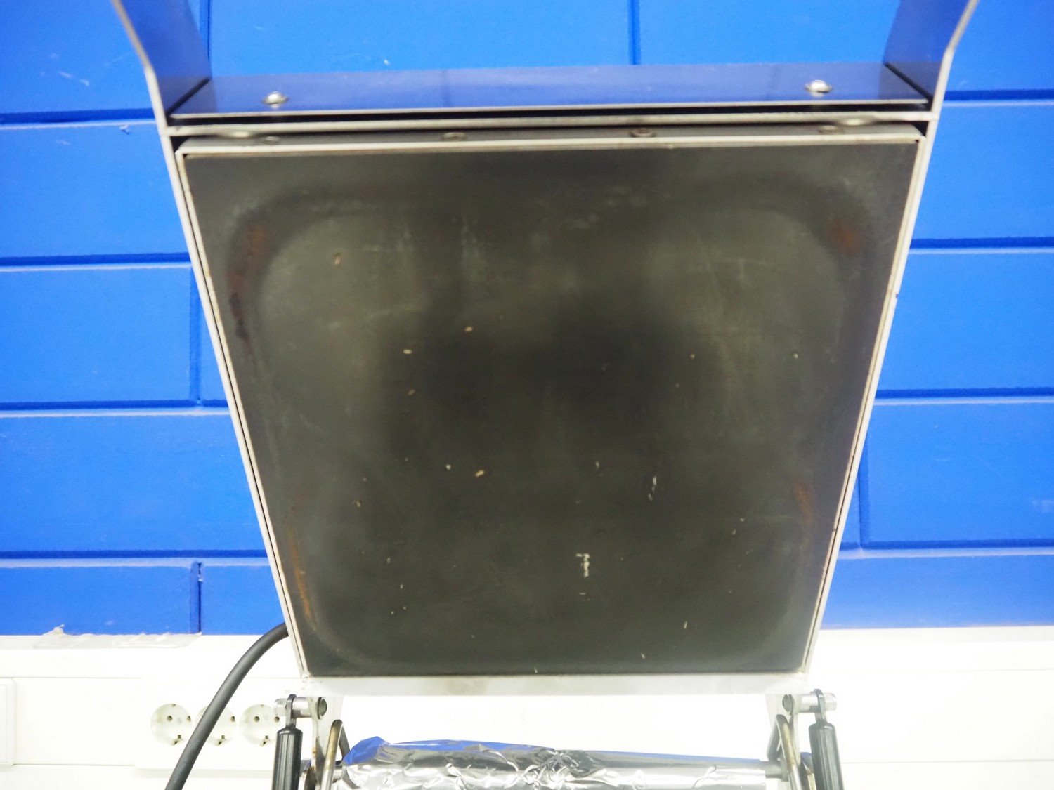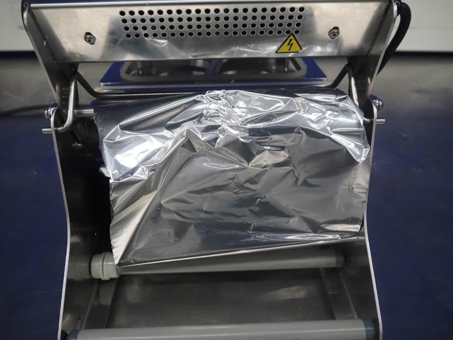 Inde Plastik traysealer, article number: IP 245, serial number: 2421, year of construction: 2010, 230 V, 50 Hz, 1000 W, dimensions dye: (2x) 105 mm x 105 mm and (1x) 225 mm x 125 mm, film width: 245 mm, total dimensions: 700 mm x 340 mm x 320 mm.