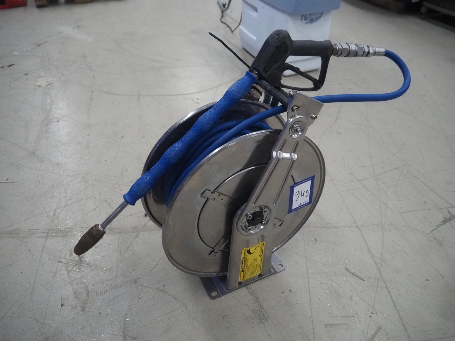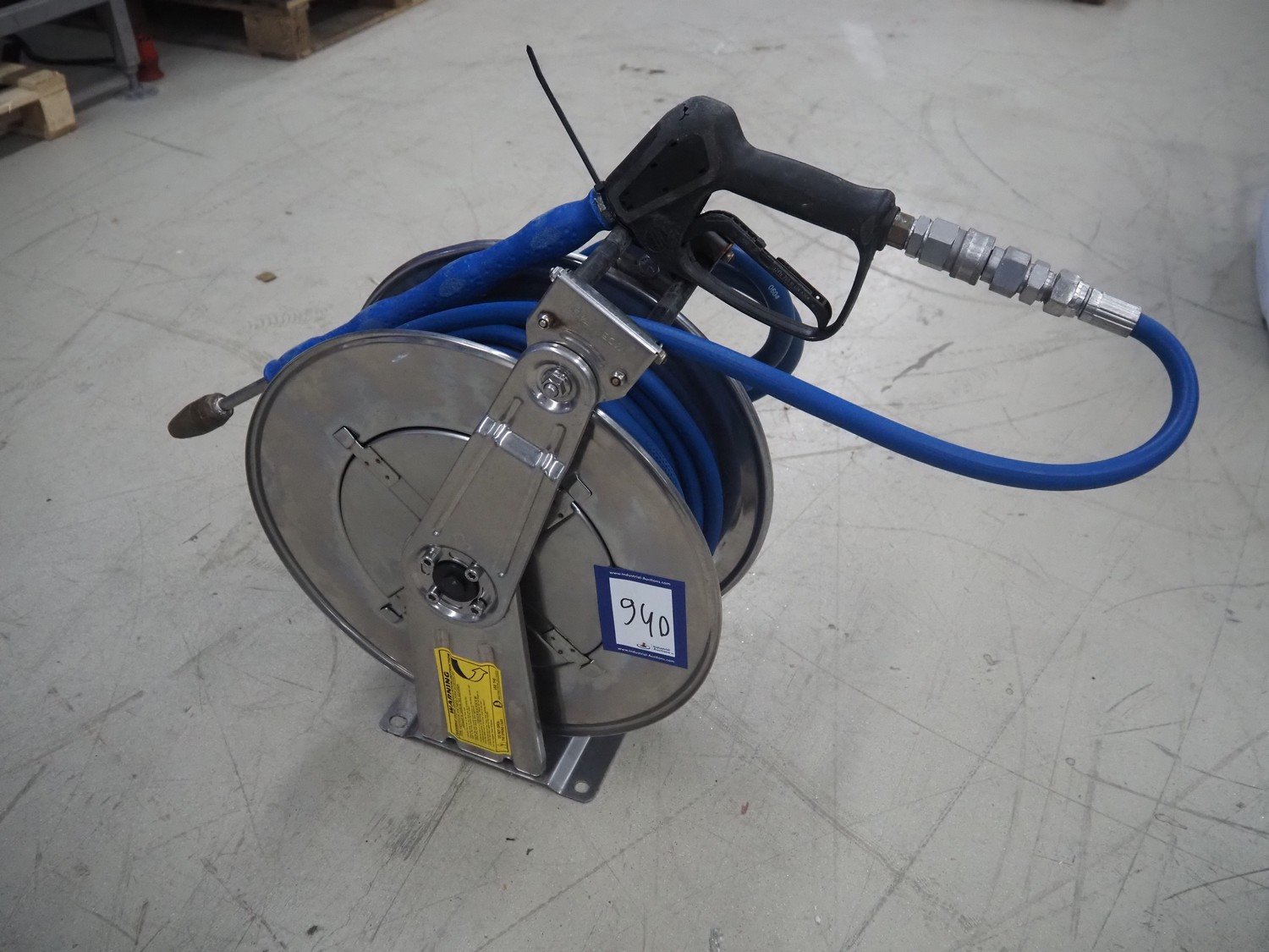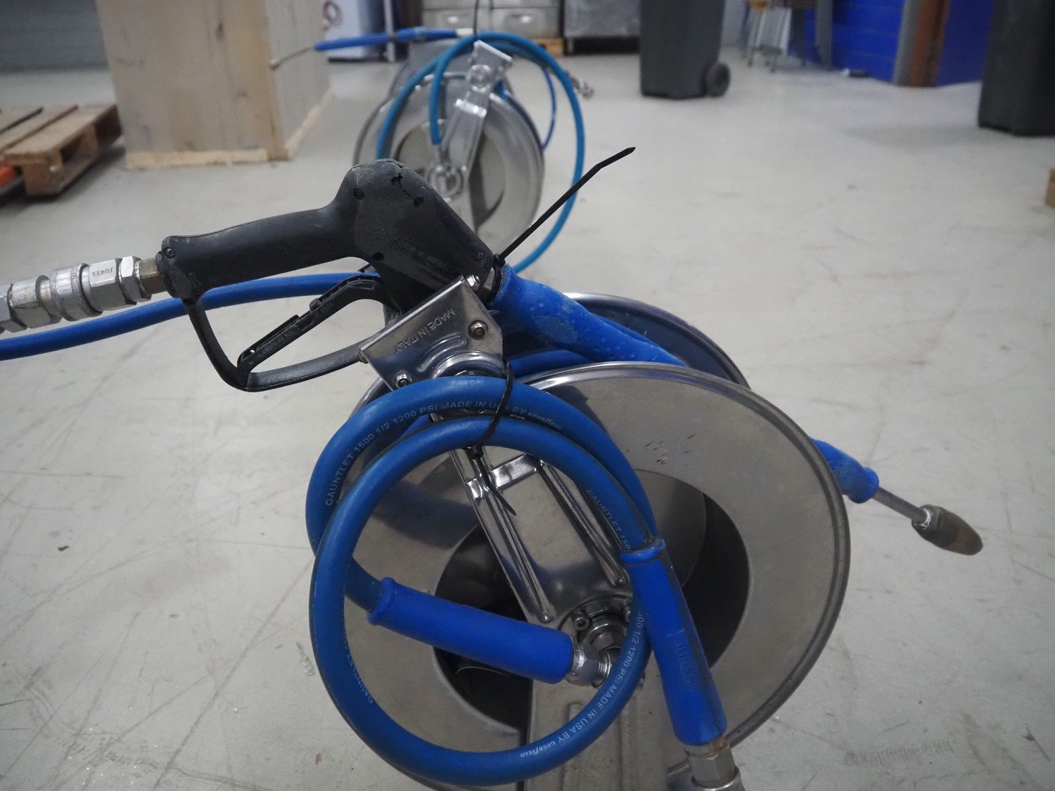 S/s hose reel with spray pistol, dimensions: 440 mm x 340 mm x 440 mm.