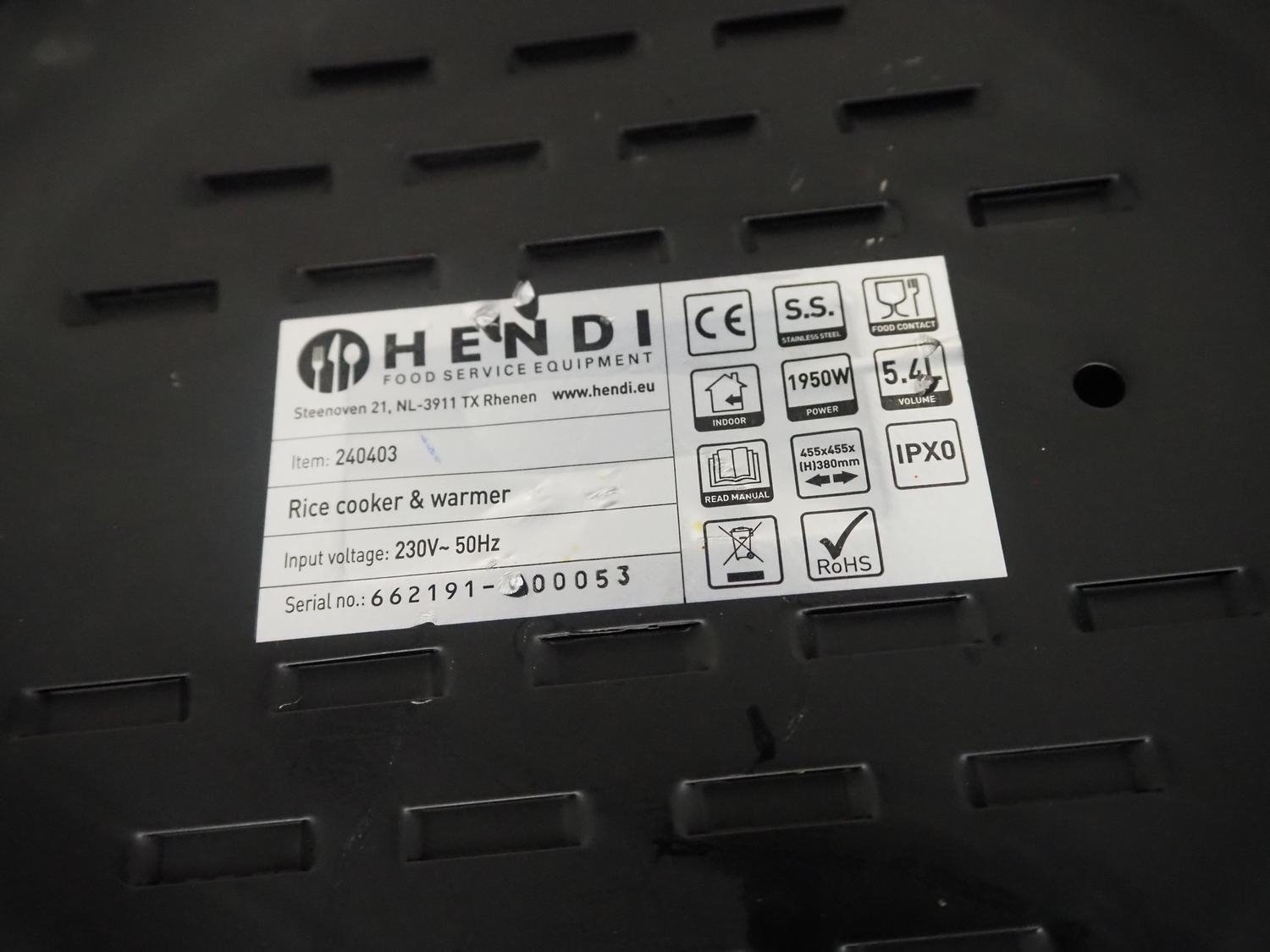 Hendi rice cooker and warmer, serial number: 662191-00053, 230 V, 50 Hz, dimensions: 480 mm x 400 mm x 350 mm.