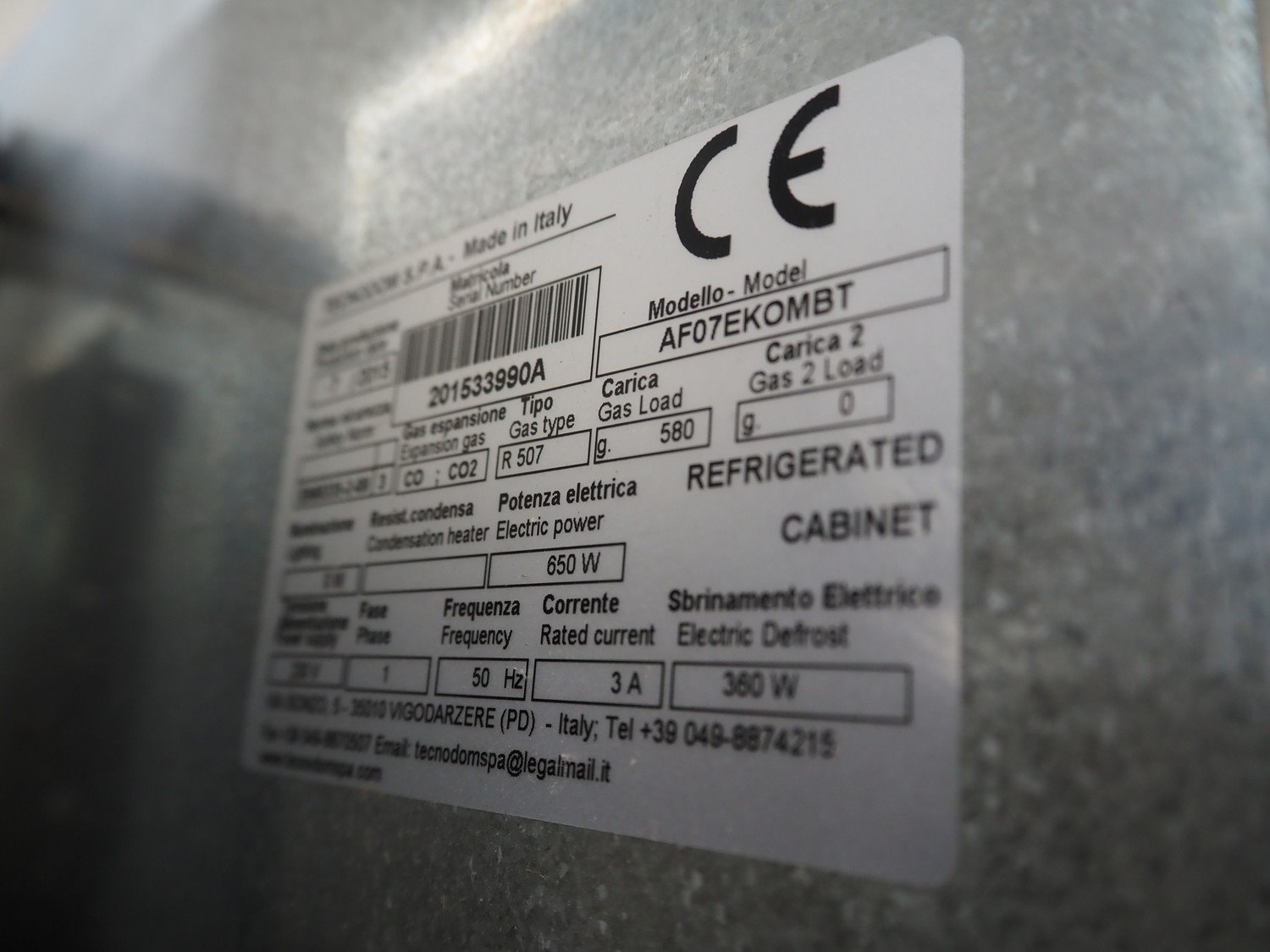 Tecnodom S.P.A. freezer, model: AF07EKOMBT, serial number: 20153390A, 230 V, 1 Ph, 50 Hz, 3 A, 360 W, dimensions: 800 mm x 710 mm x 2030 mm.