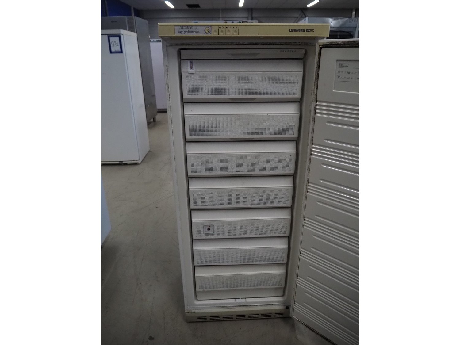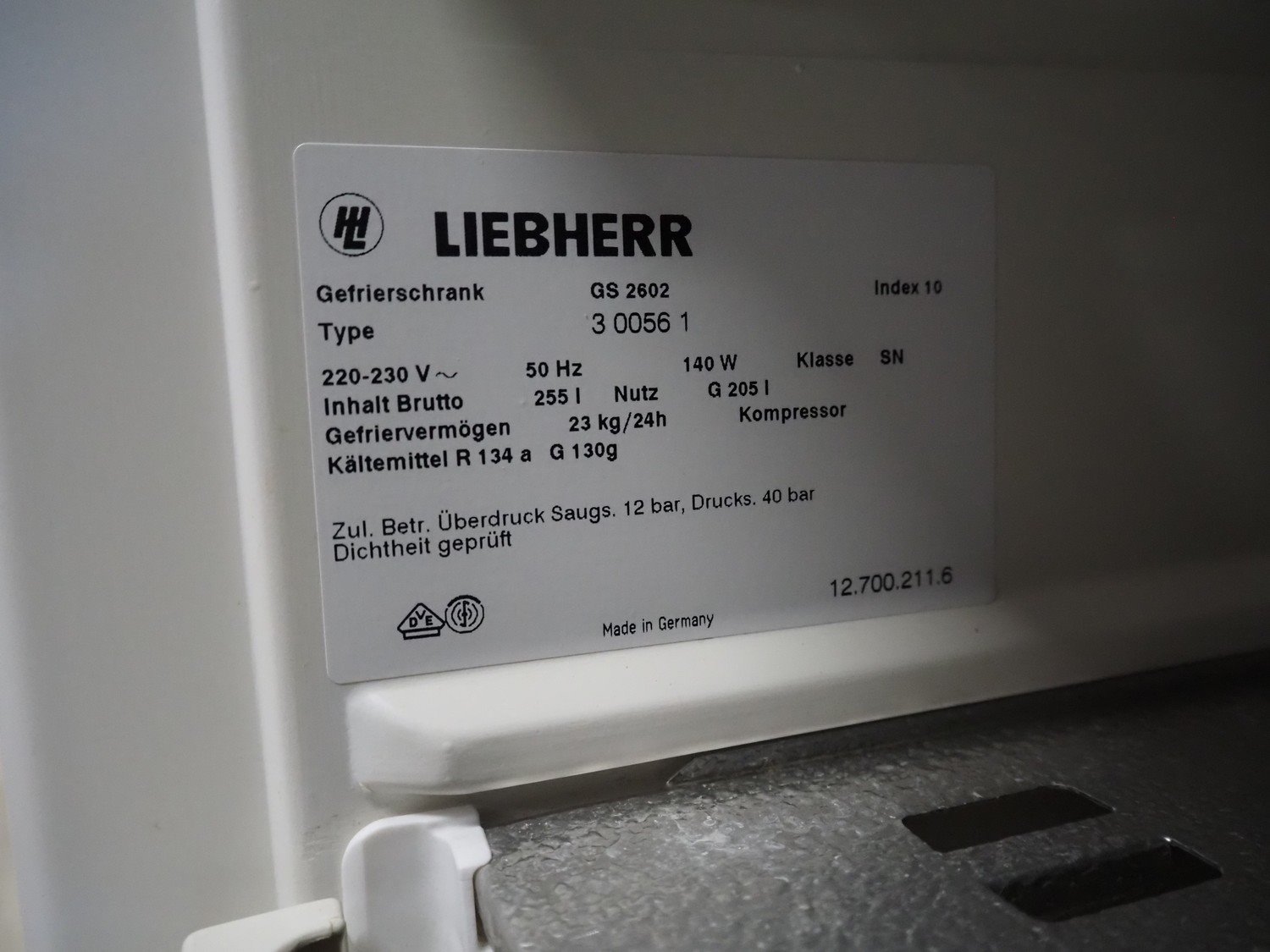 Liebherr freezer, model: GSP 3126, type: 3 6130 4, serial number: 19 149 405 3, 220-230 V, 50 Hz, 100 W, volume: 307 liter, refrigerant: R600a / 85 gram, dimensions: 680 mm x 660 mm x 1640 mm.