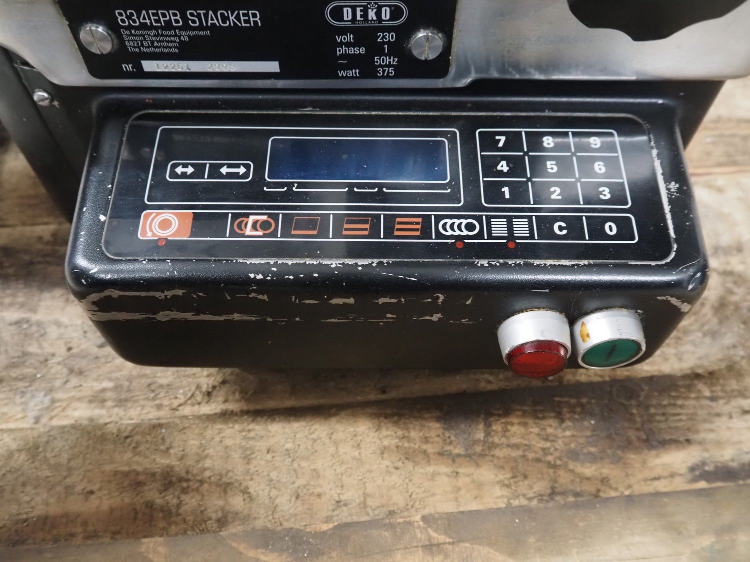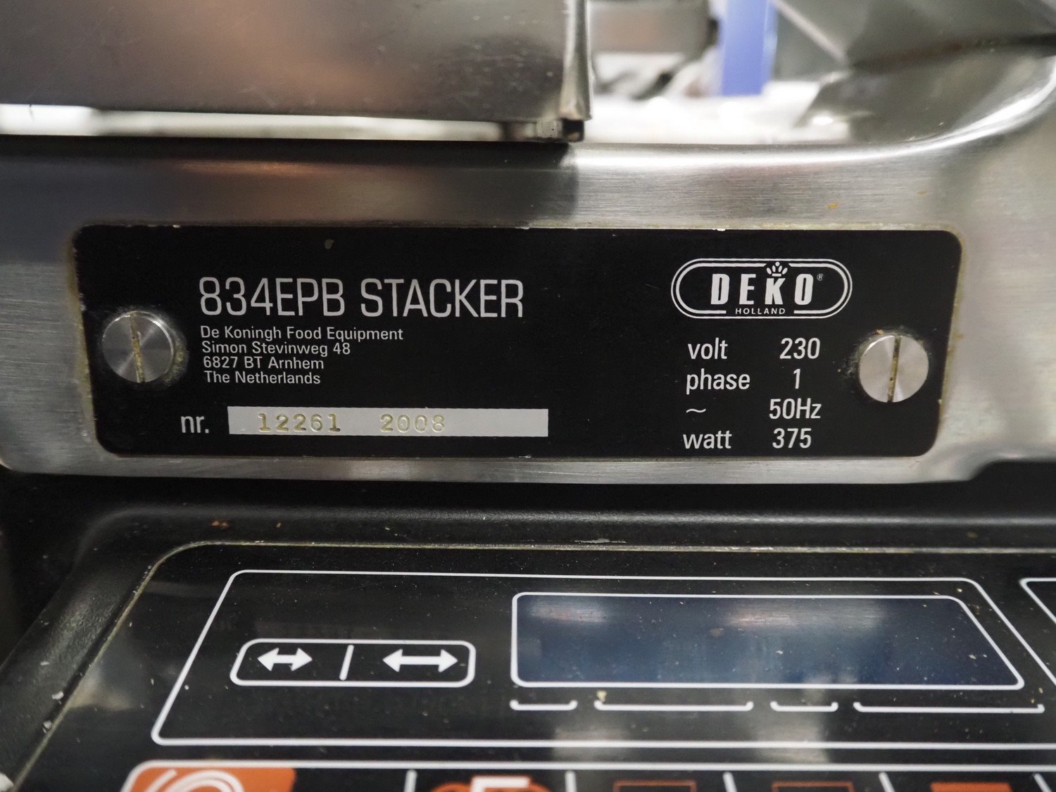 DEKO automatic slicer, model: 834EPB STACKER, number: 12261, year of construction: 2008, 230 V, 1 Ph, 50 Hz, 375 W, dimensions: 900 mm x 600 mm x 520 mm.