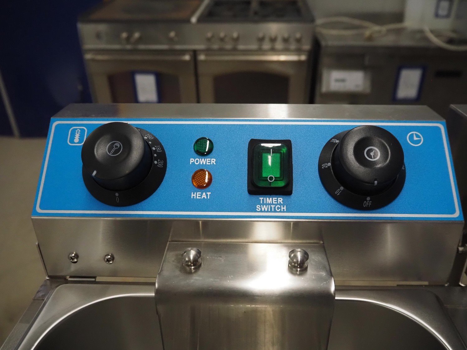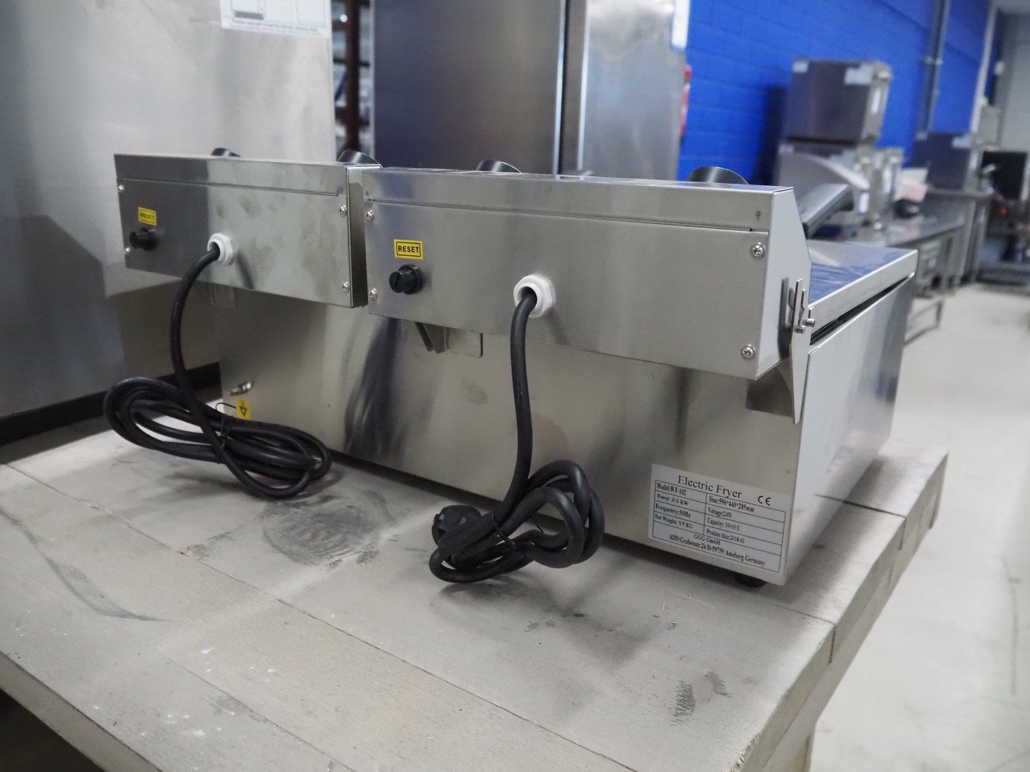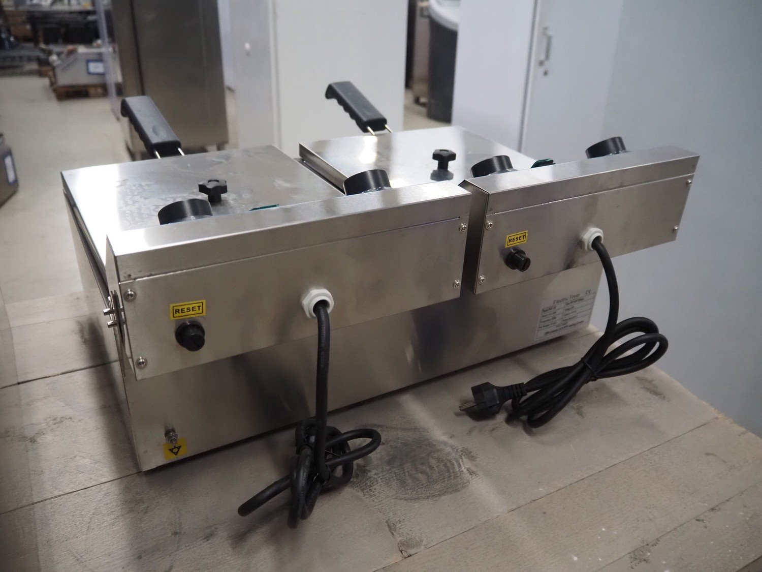 GGG double fryer, model: WF-102, year of construction: 03-2018, 230 V, 50 Hz, 3 + 3 kW, electrically heated, volume: (2x) 10 liter, dimensions: 650 mm x 600 mm x 300 mm. Never used.
