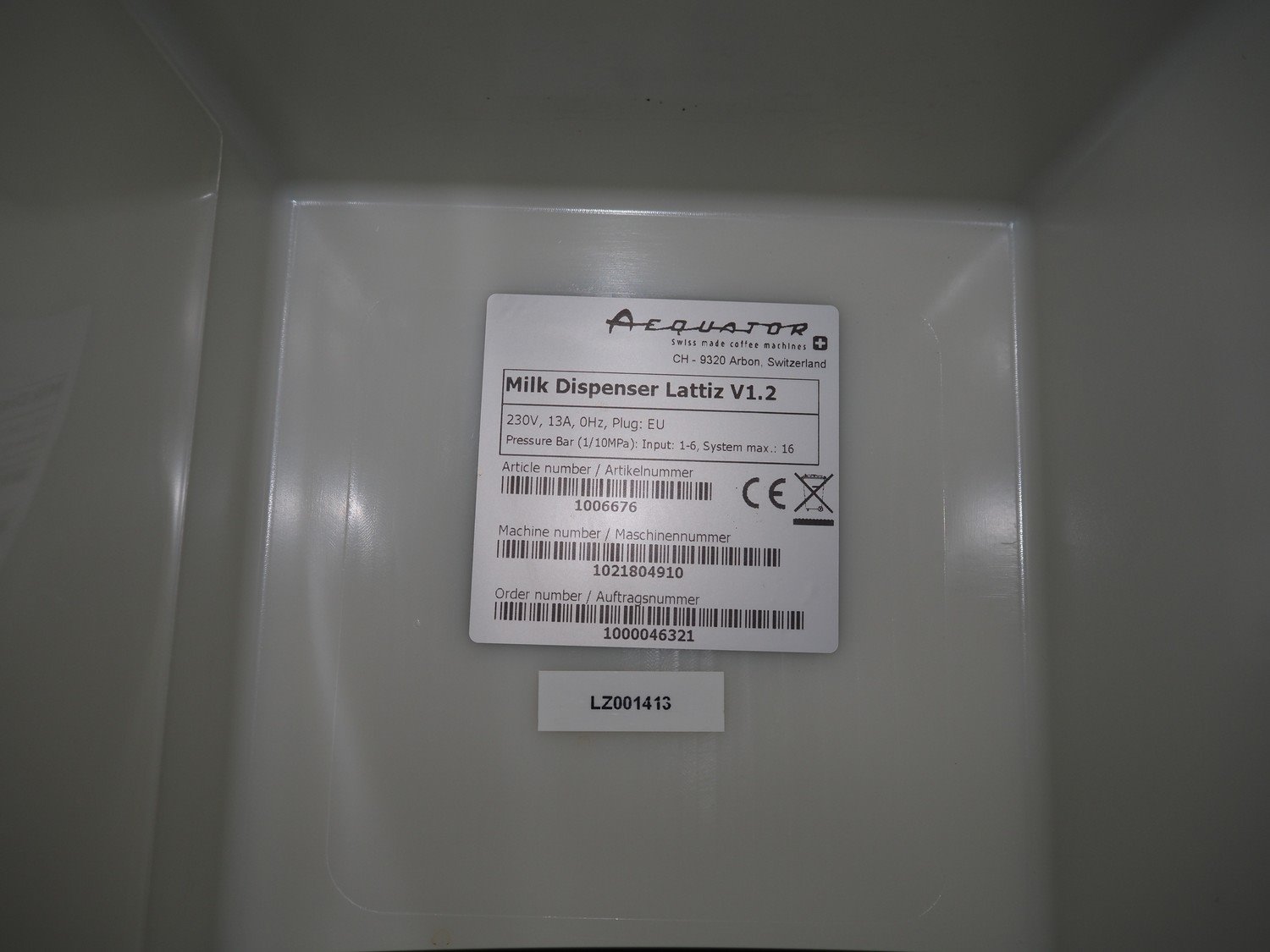 Aequator milk frother, model: Lattiz V1.2, machine number: 1021804910, 230 V, 13 A, dimensions: 510 mm x 200 mm x 590 mm.