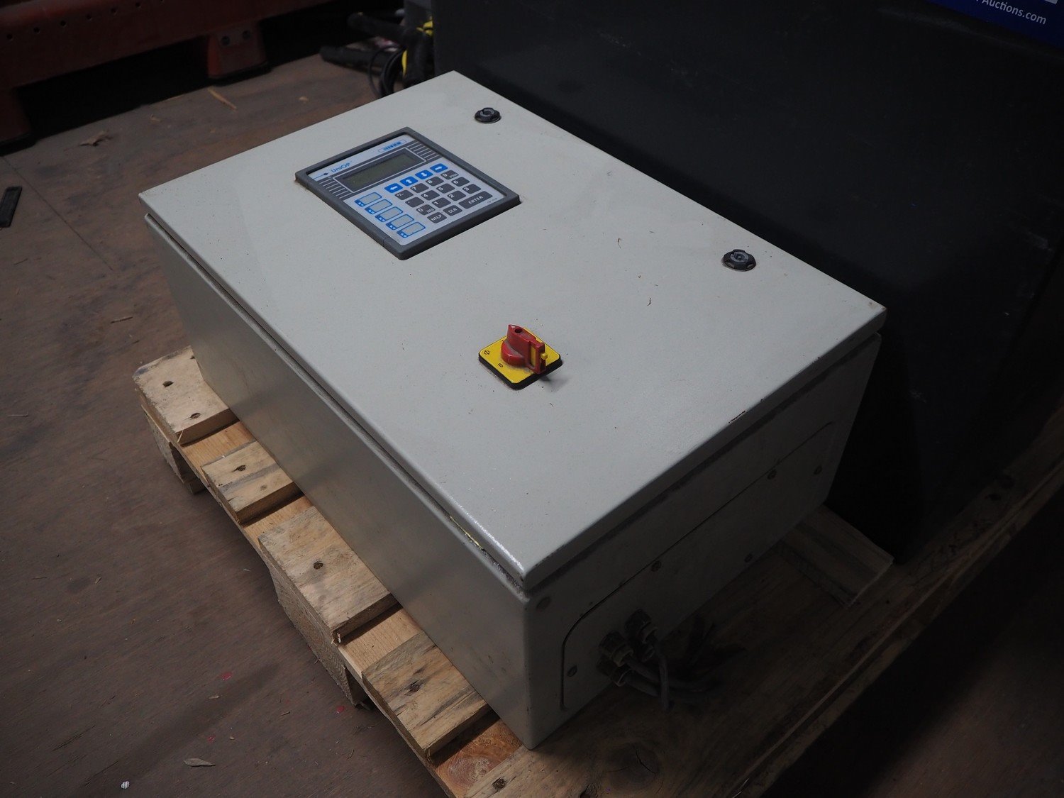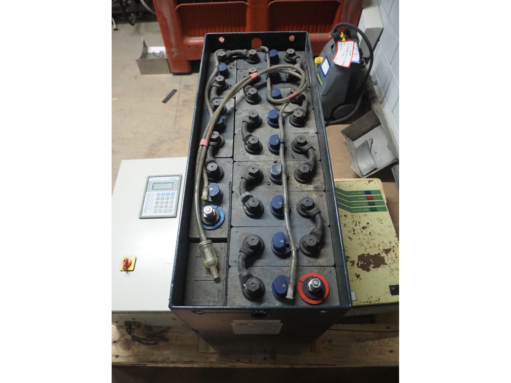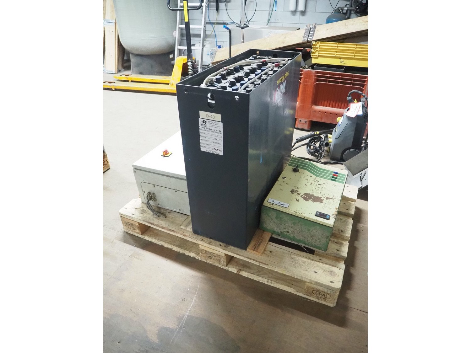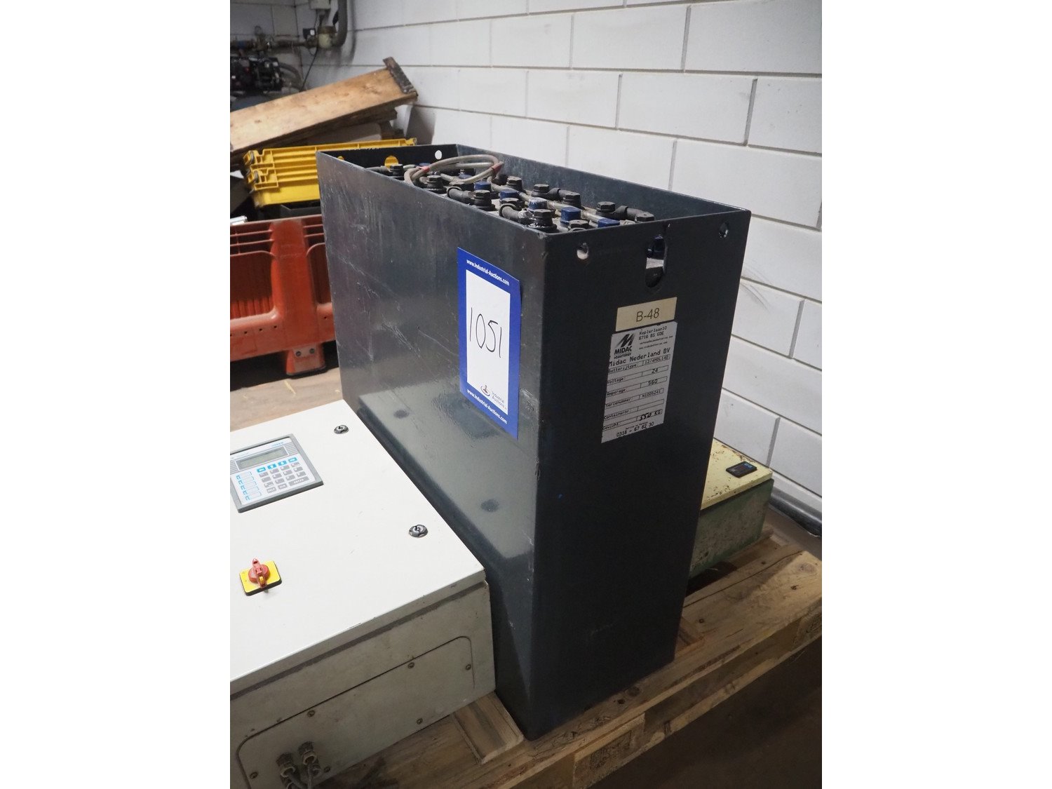 Pallet with Midac battery for electrical pallet lifter and 2 switch cabinets, type: 12/4MDL140, serial number: N1005241, 24 V, 560 A.