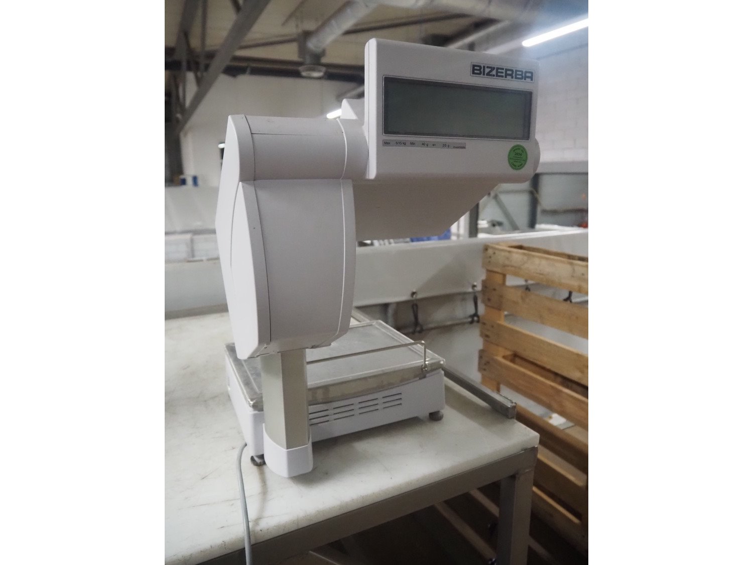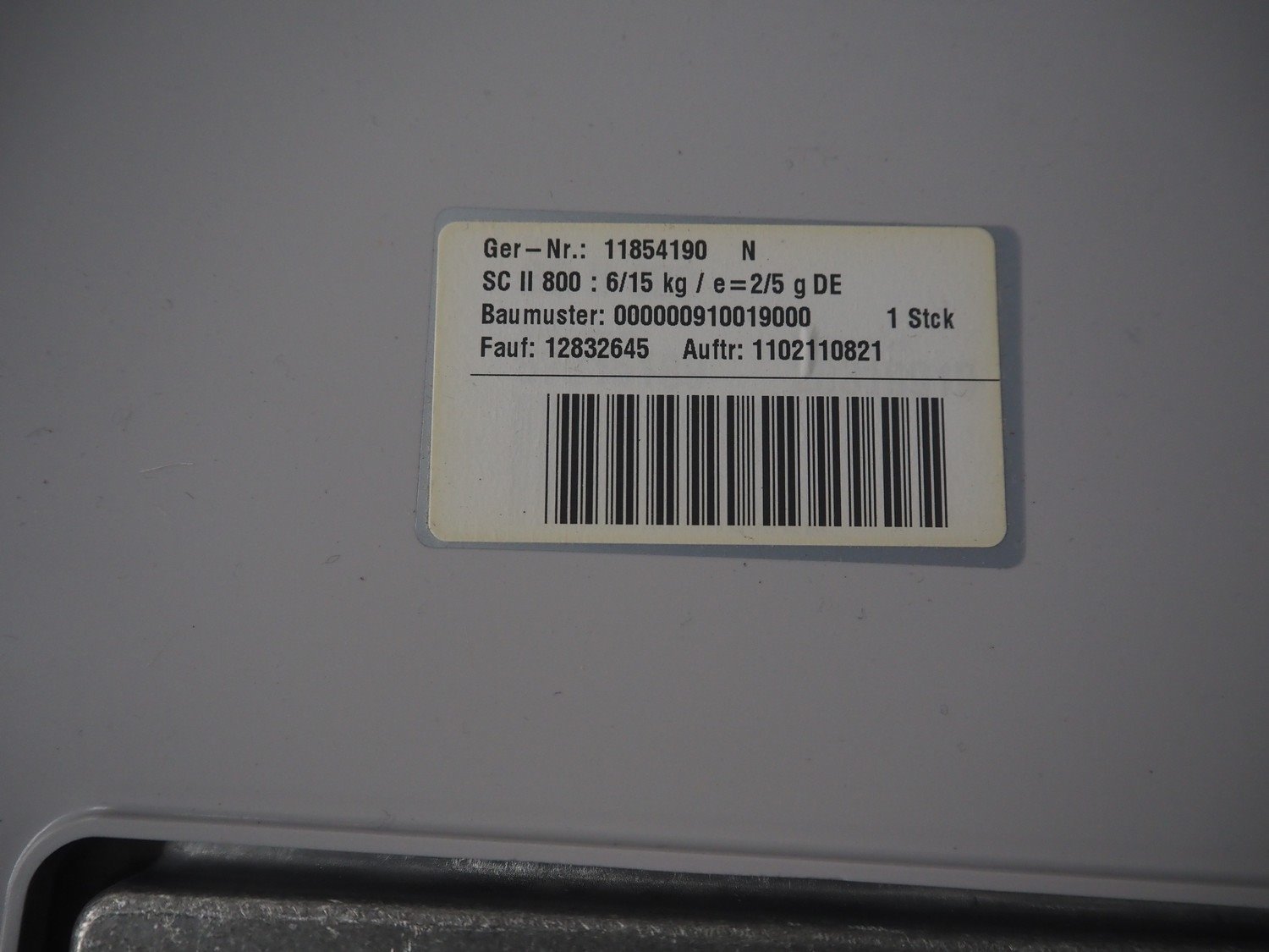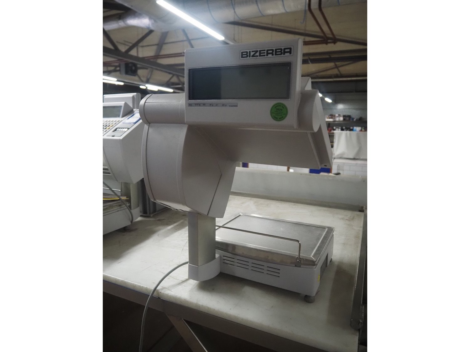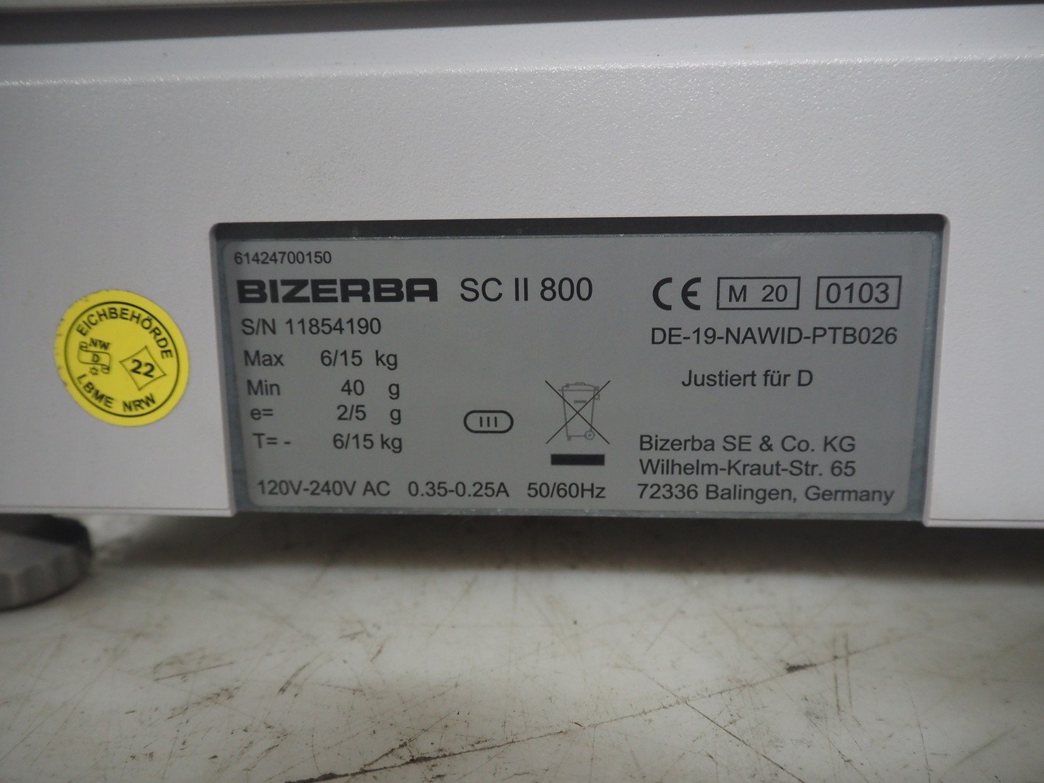 Bizerba weighing scale with label printer, type: SC II 800, serial number: 11854190, 120/240 V, 50/60 Hz, 0.35-0.25 A, minimum weight: 40 gram, maximum weight: 6/15 Kg, e= 2/5 gram, scale dimensions: 350 mm x 270 mm, total dimensions: 480 mm x 350 mm x 560 mm.