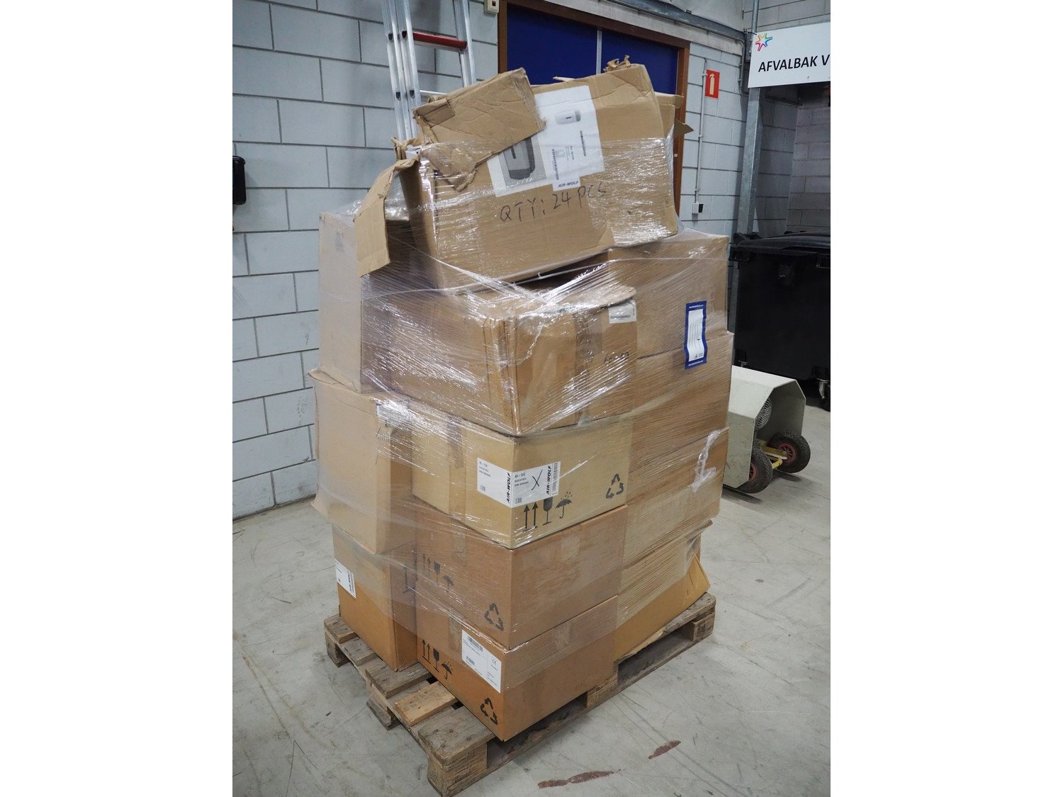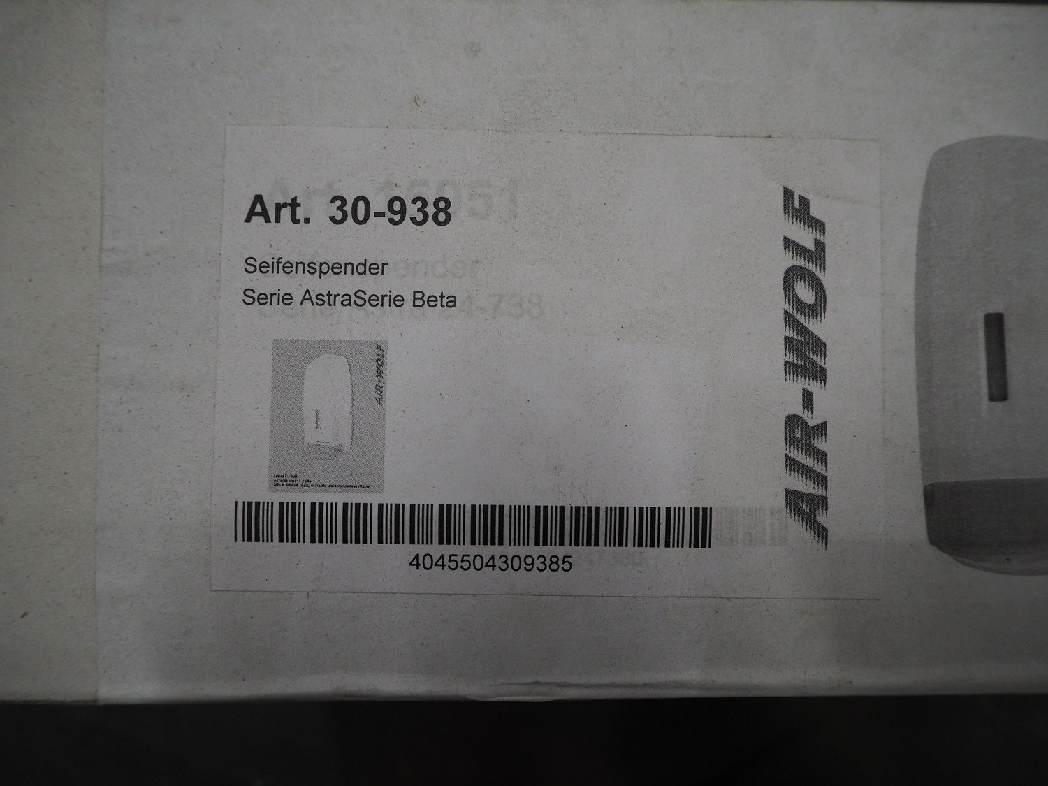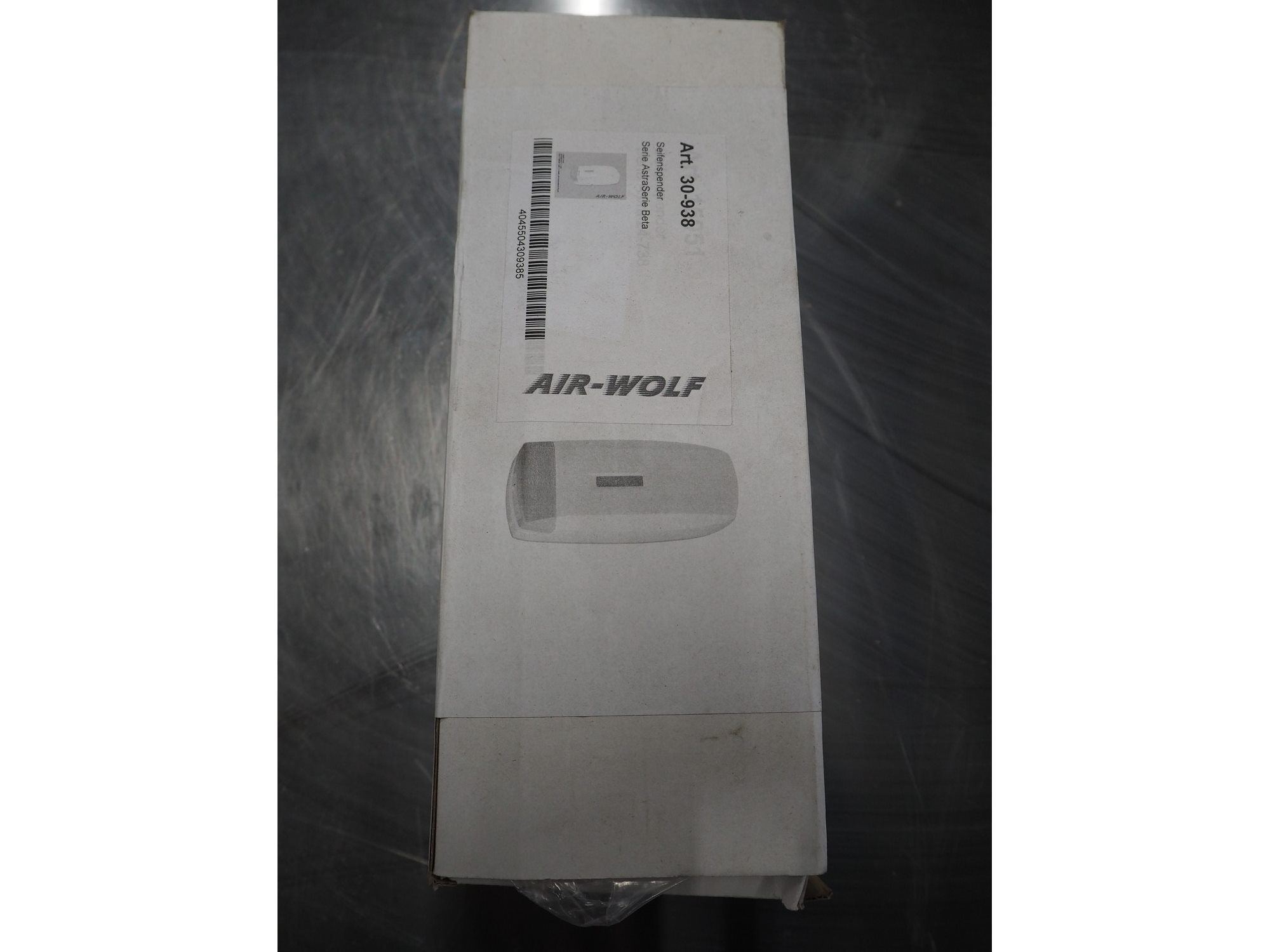 Pallet with 17 boxes with Air-Wolf soap dispensers, dimensions each dispenser: 290 mm x 110 mm x 110 mm, total dimensions: 1200 mm x 800 mm x 1850 mm.
