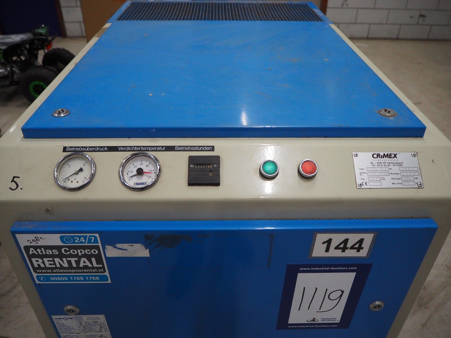 Crimex air compressor, type: CRS 185, number: 2981, year of construction: 2002, 18.5 kW, maximum pressure: 10 bar, capacity: 2620 liter per minute, dimensions: 1220 mm x 750 mm x 1230 mm.