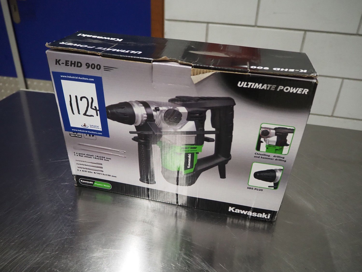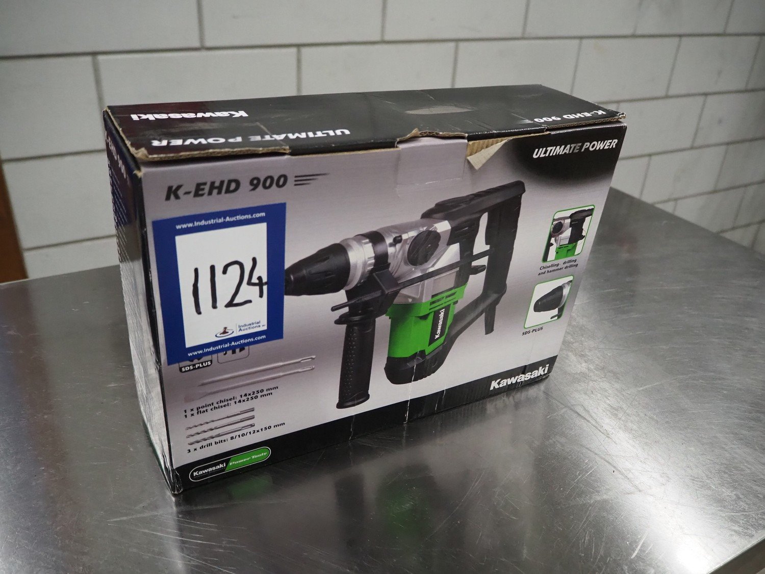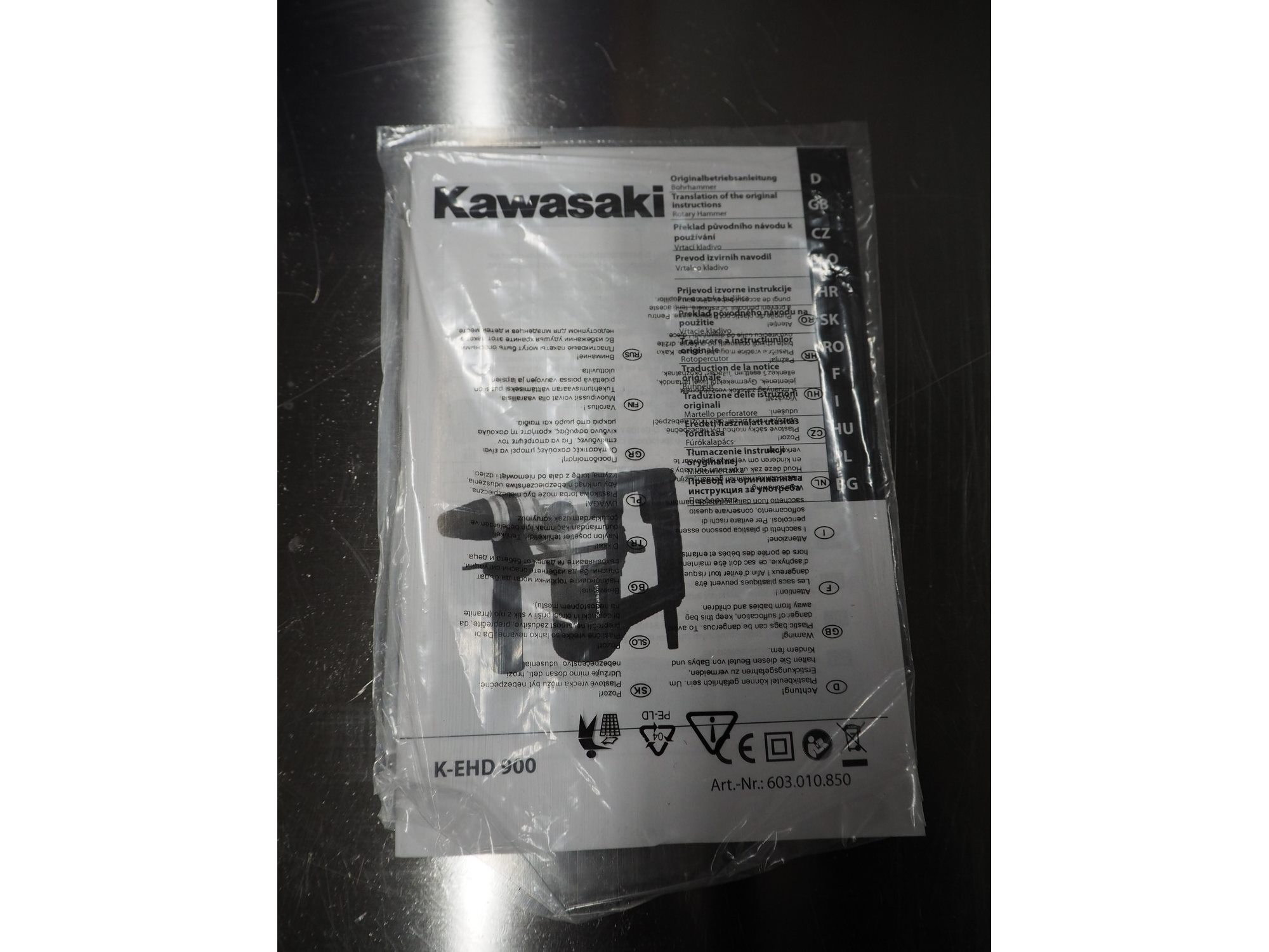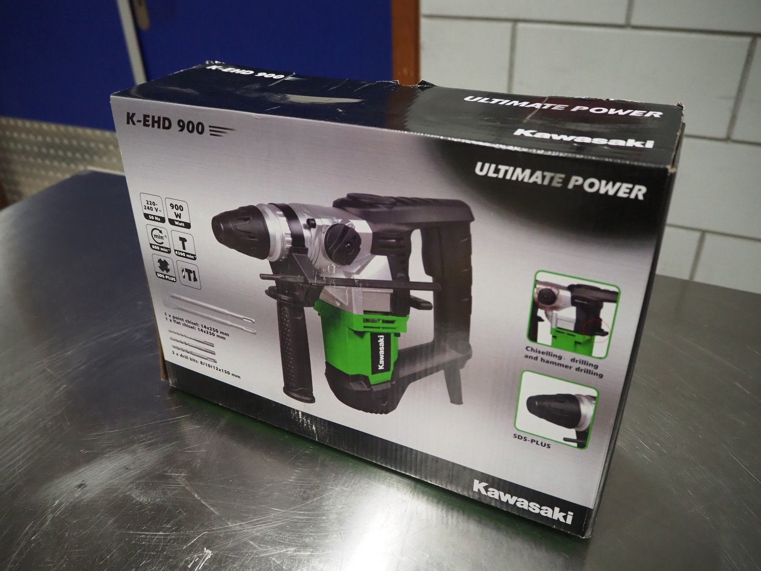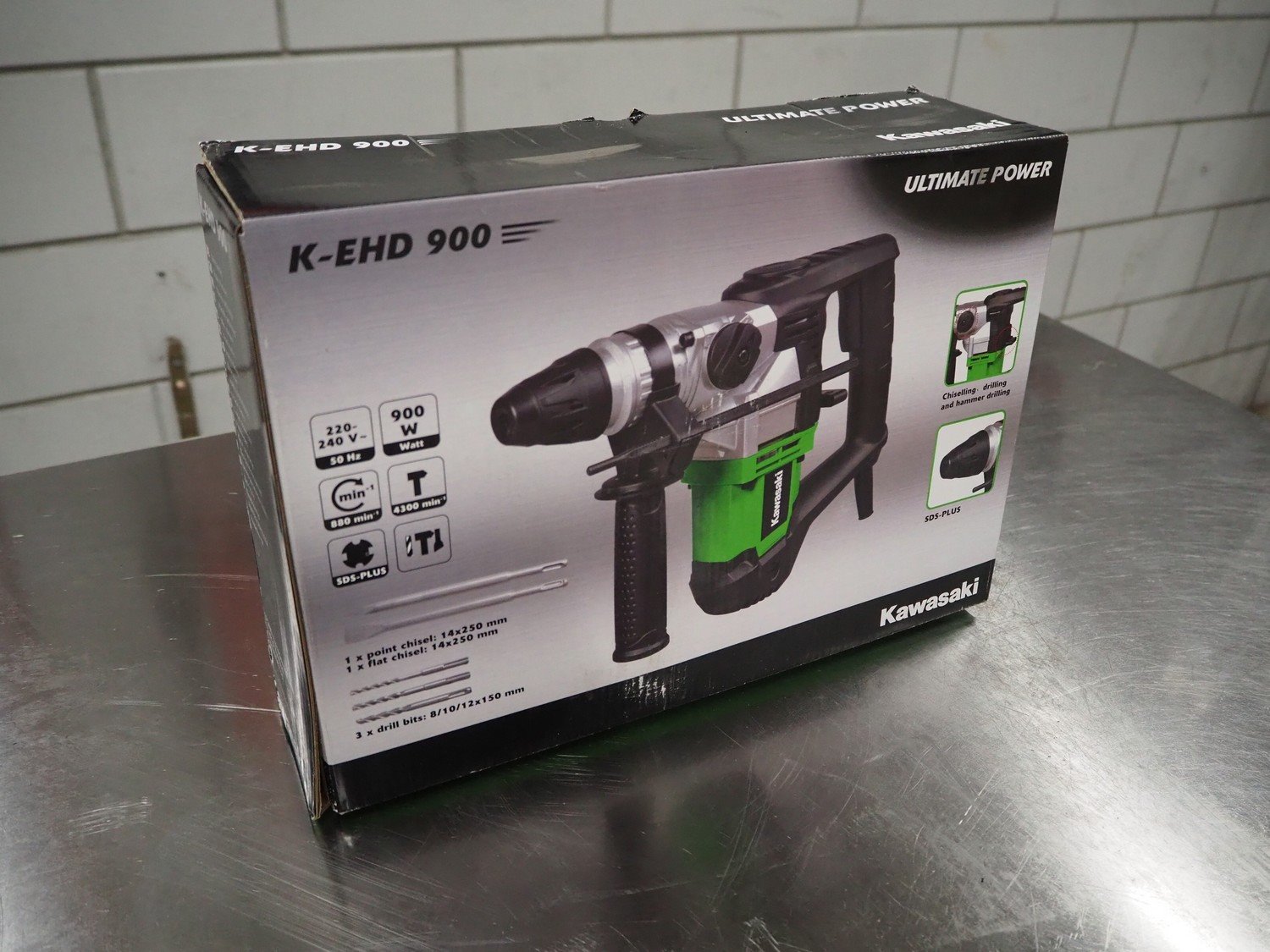 Kawasaki rotary hammer, model: K-EHD 900, serial number: 18-0857/00448, year of construction: 2018, 220-240 V, 50 Hz, 900 W, dimensions: 350 mm x 250 mm x 110 mm.