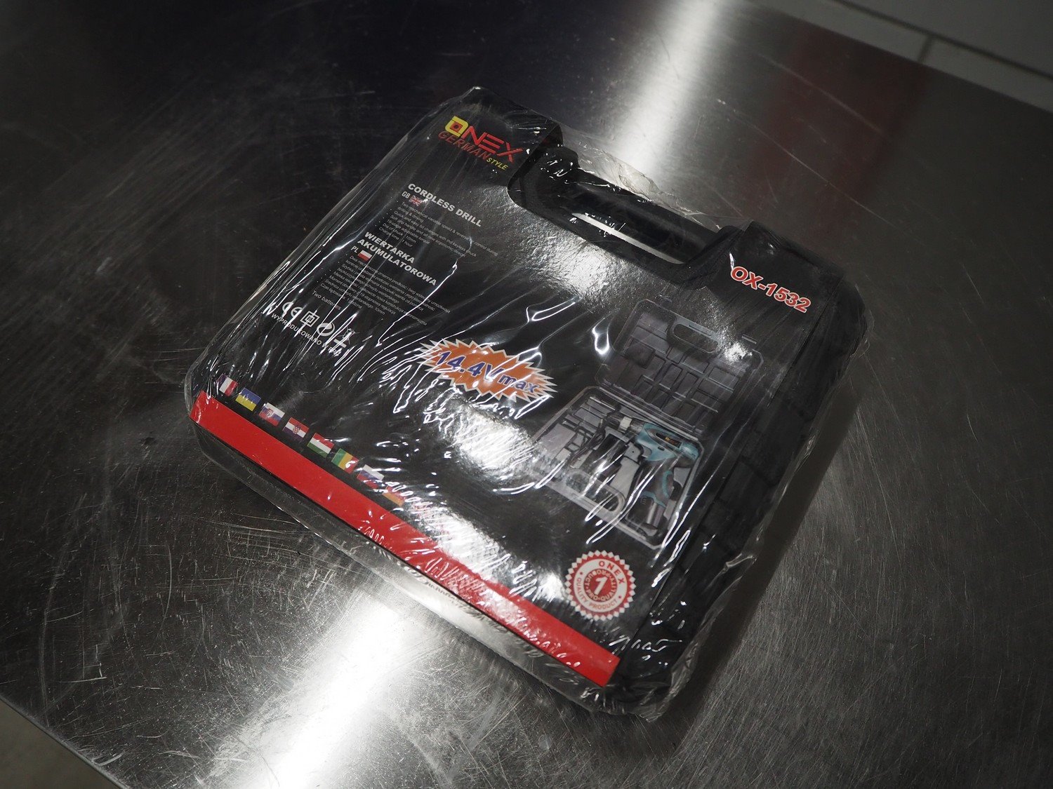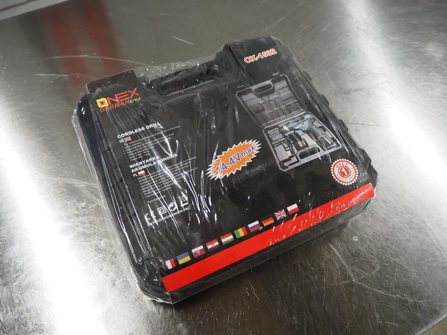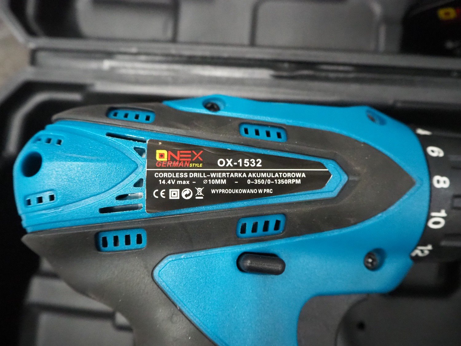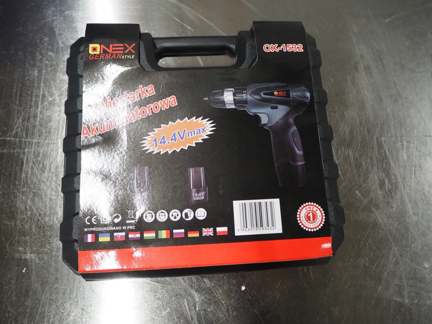 Onex cordless drill, model: OX-1532, 14.4 V, dimensions: 260 mm x 230 mm x 80 mm.