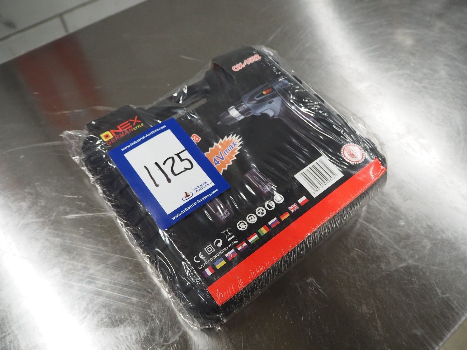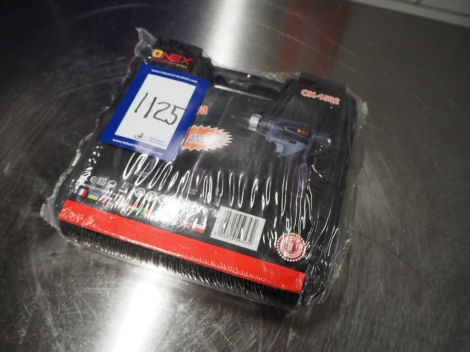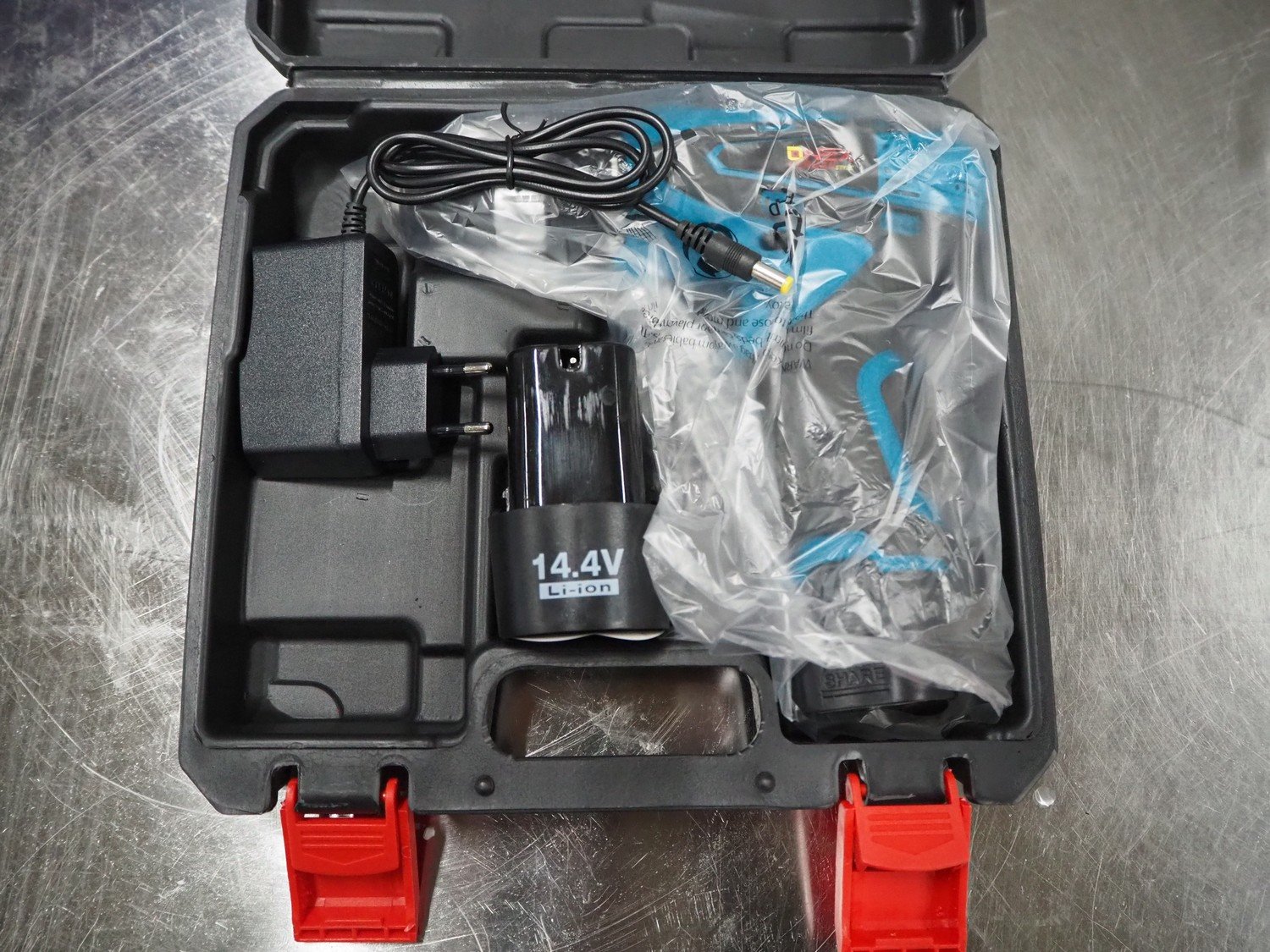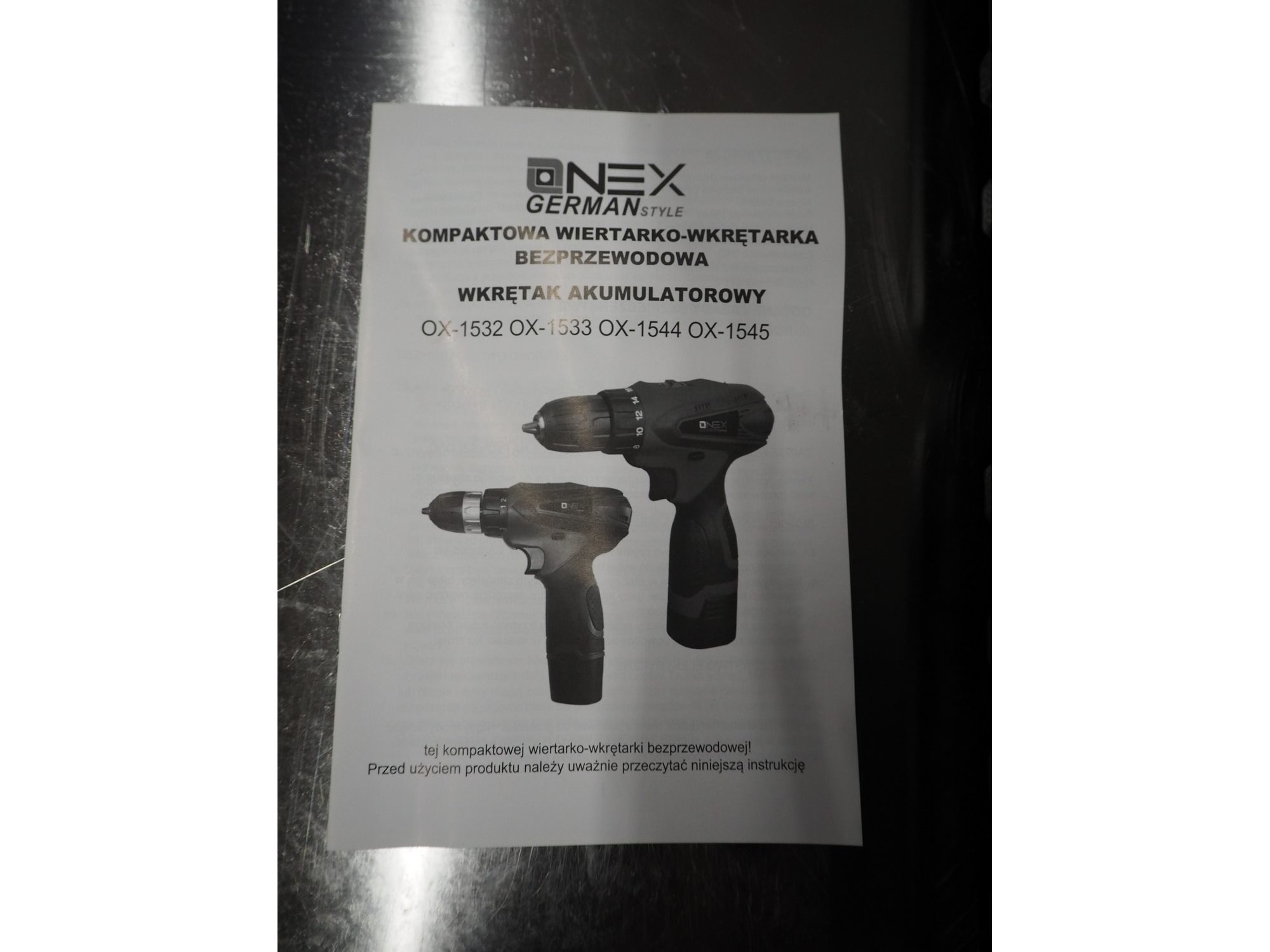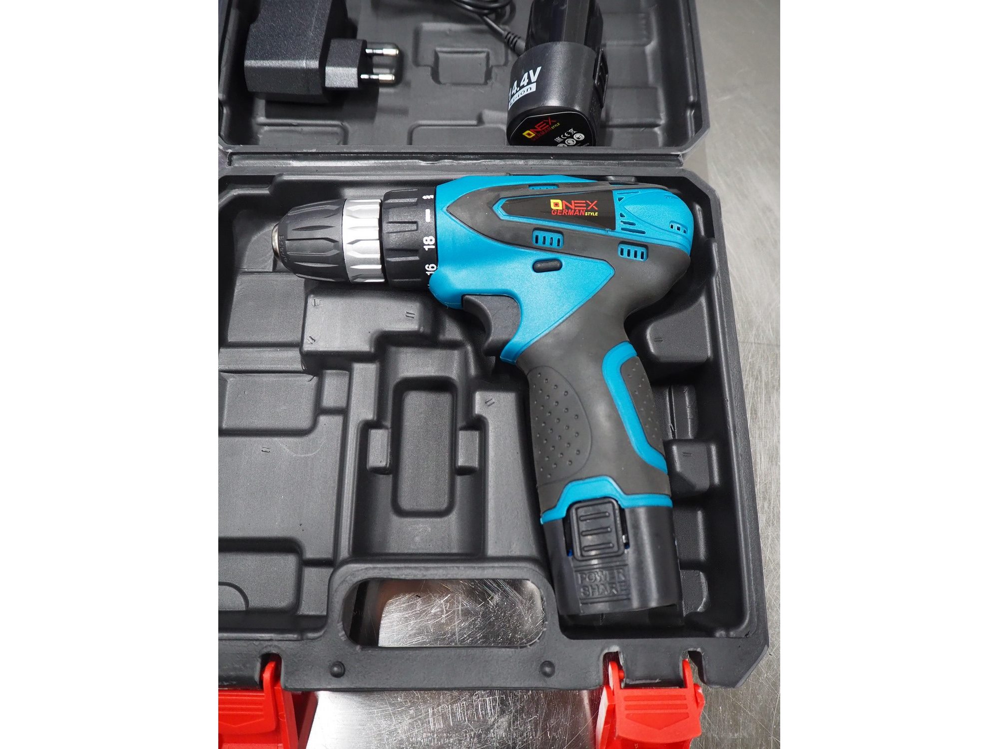 Onex cordless drill, model: OX-1532, 14.4 V, dimensions: 260 mm x 230 mm x 80 mm.