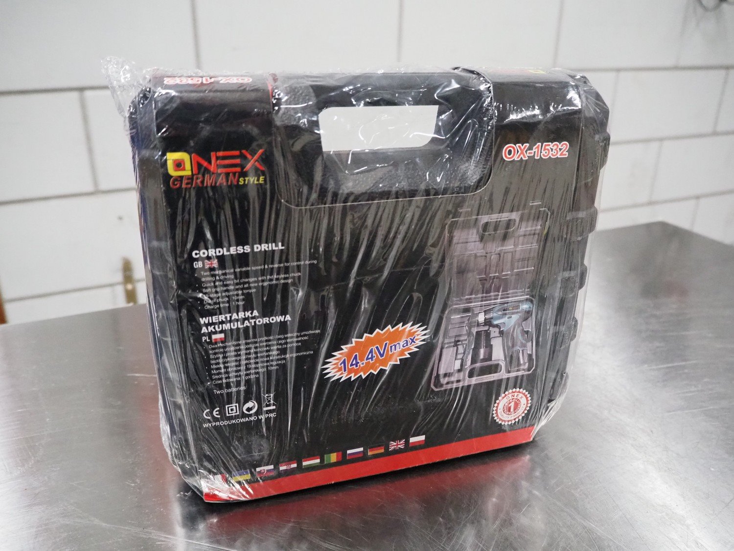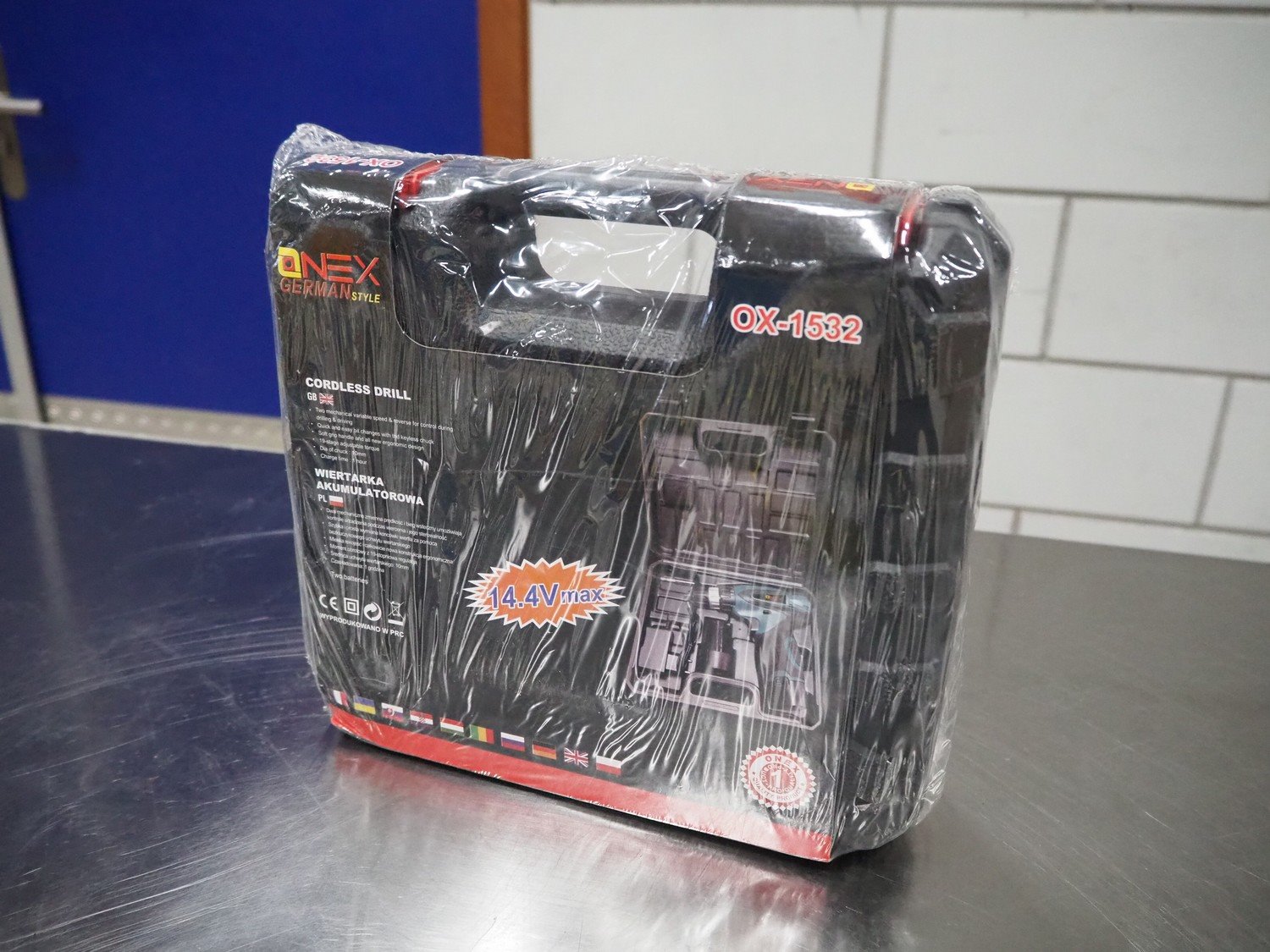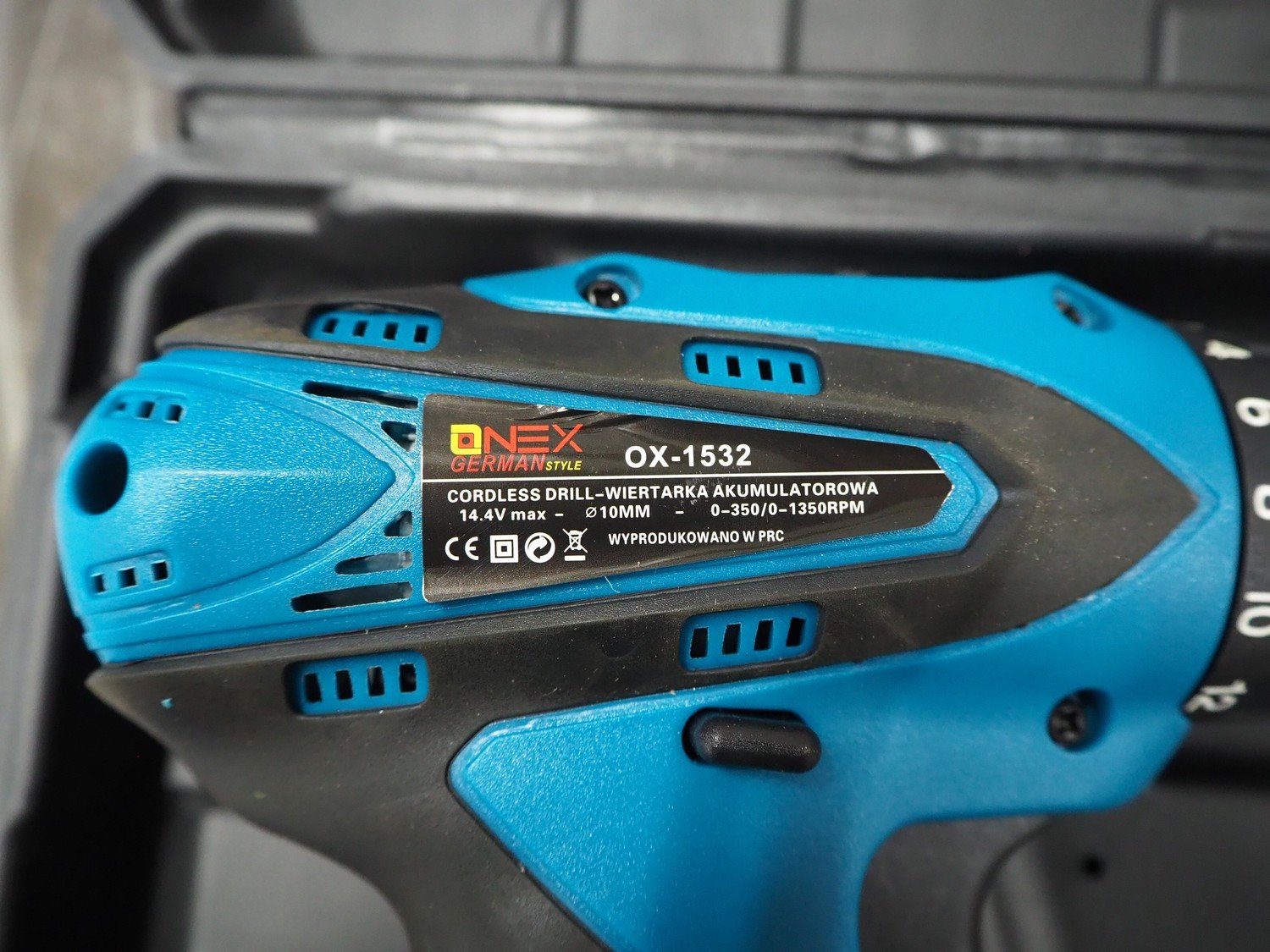 Onex cordless drill, model: OX-1532, 14.4 V, dimensions: 260 mm x 230 mm x 80 mm.