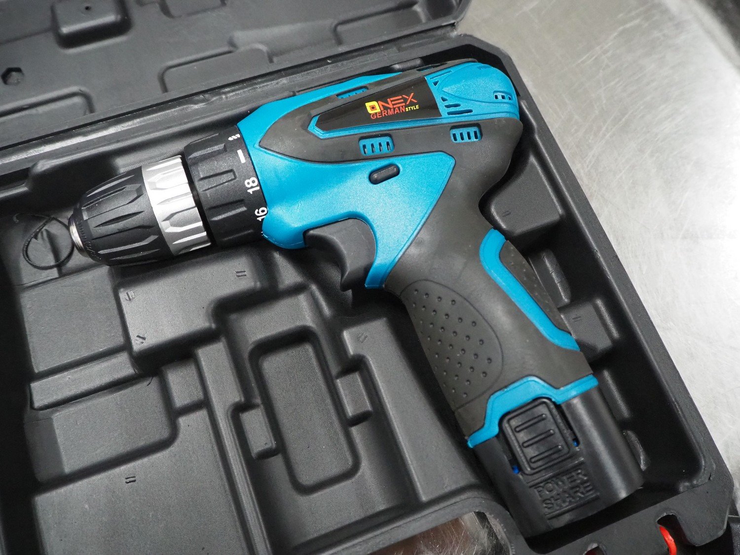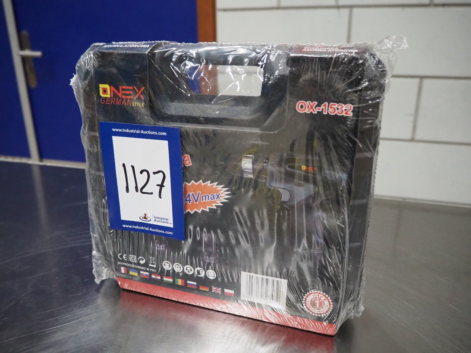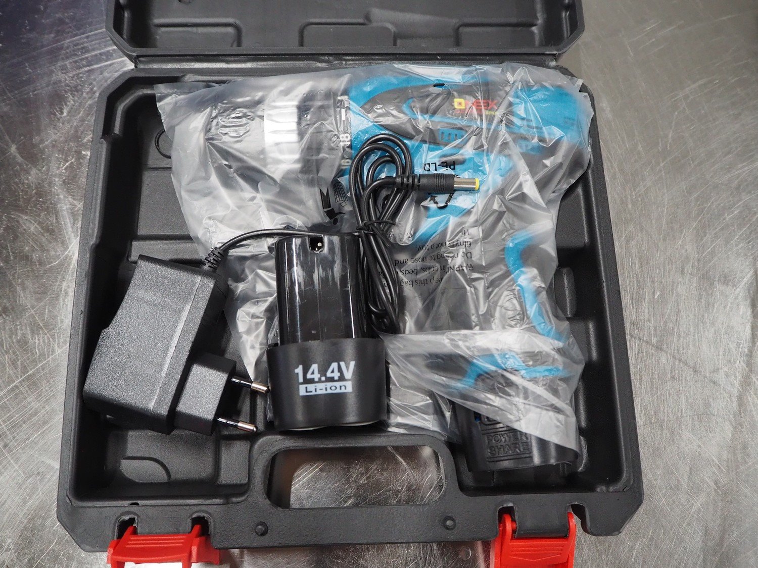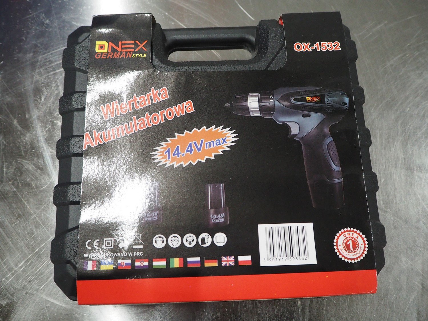 Onex cordless drill, model: OX-1532, 14.4 V, dimensions: 260 mm x 230 mm x 80 mm.