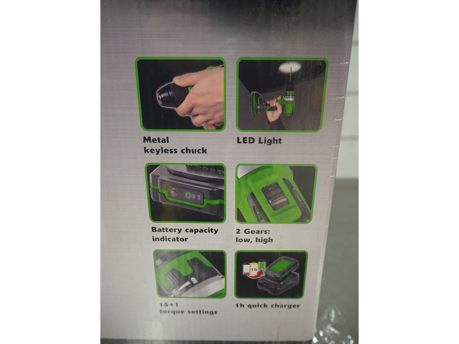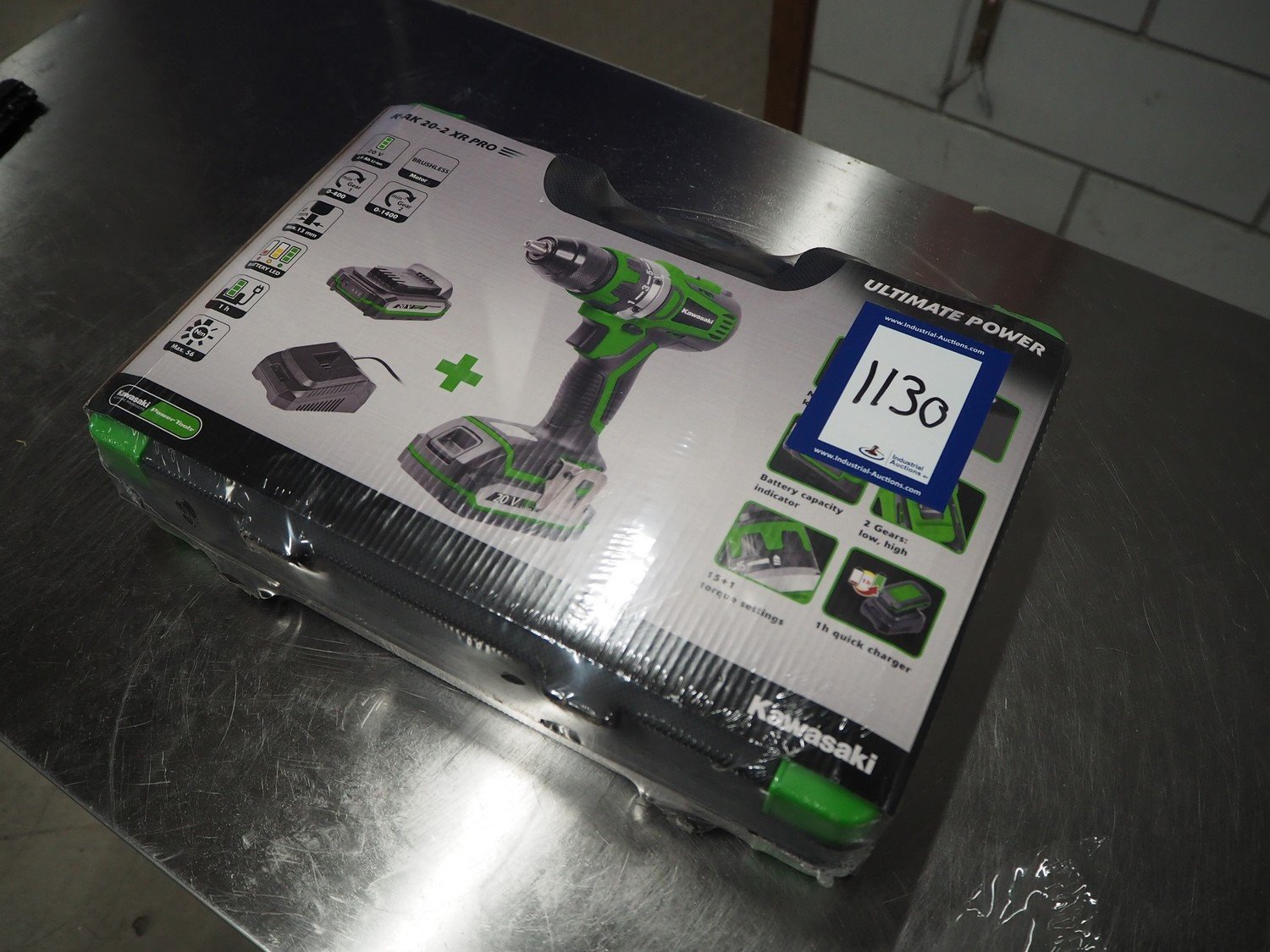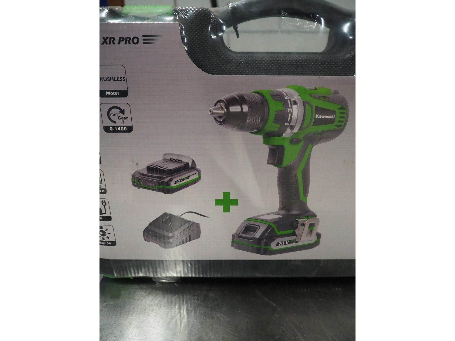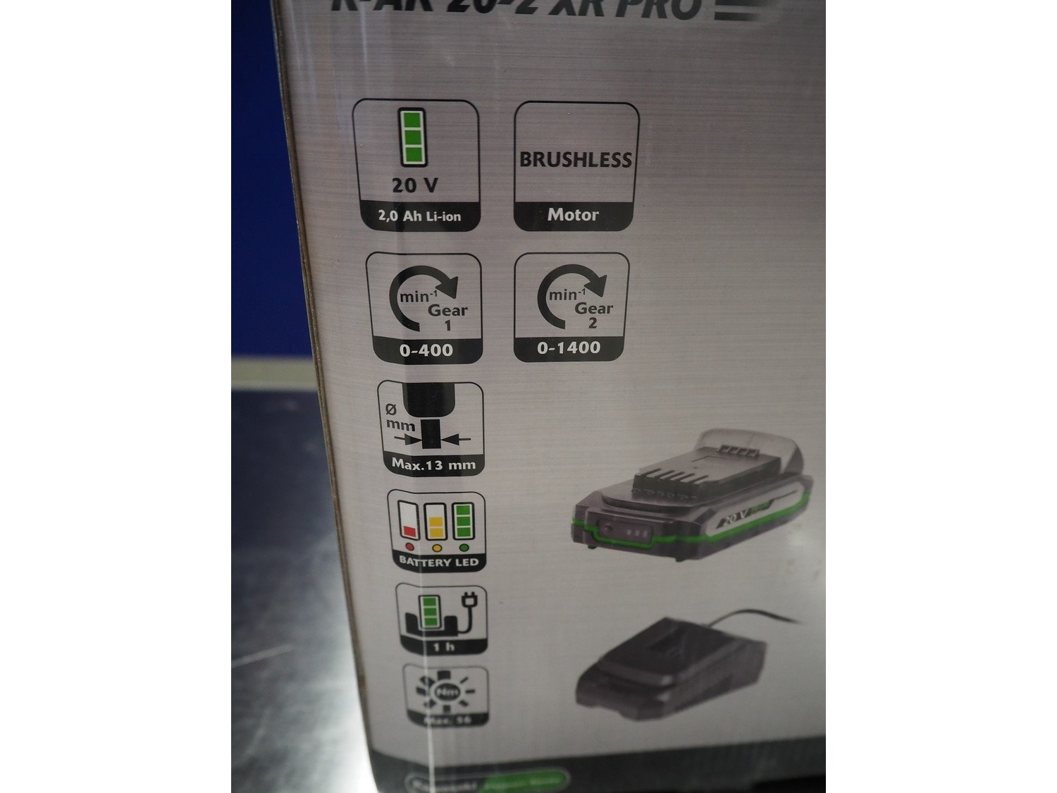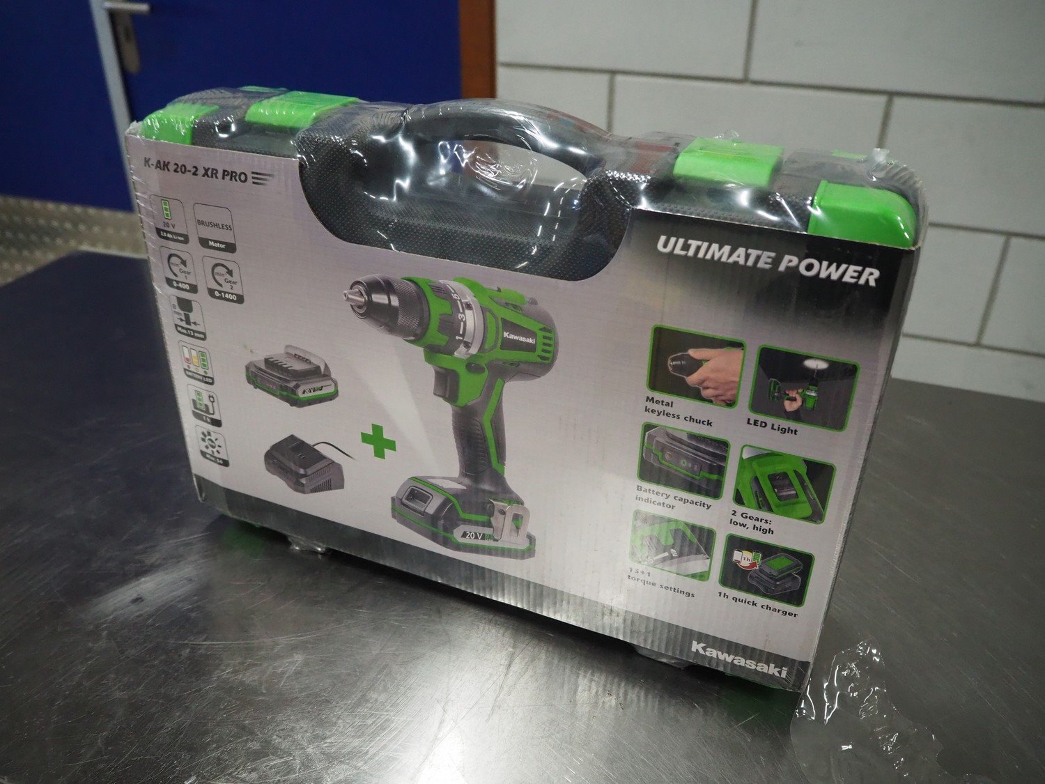 Kawasaki cordless drill, model: K-AK 20-2 XR PRO, dimensions: 410 mm x 280 mm x 100 mm.