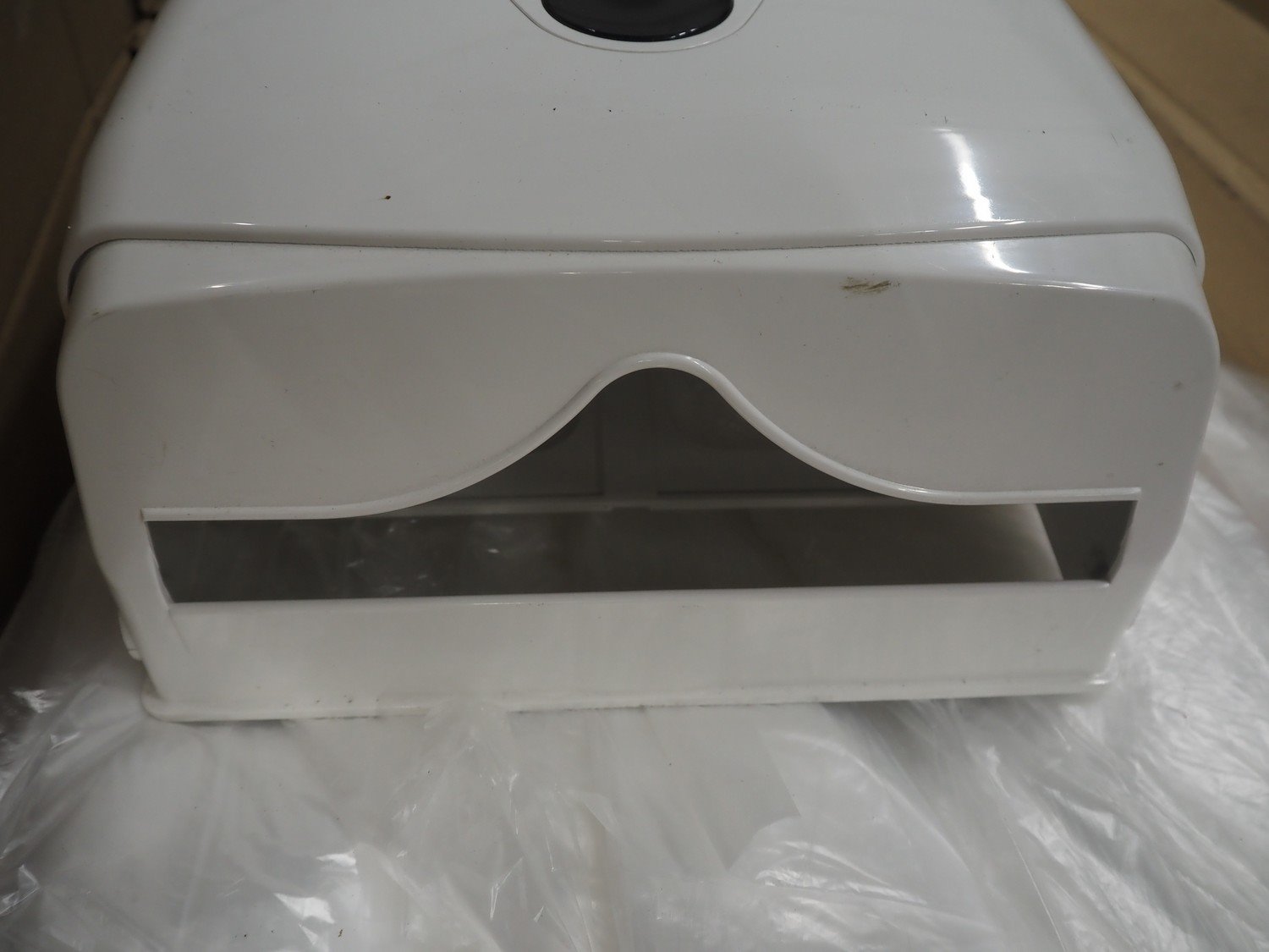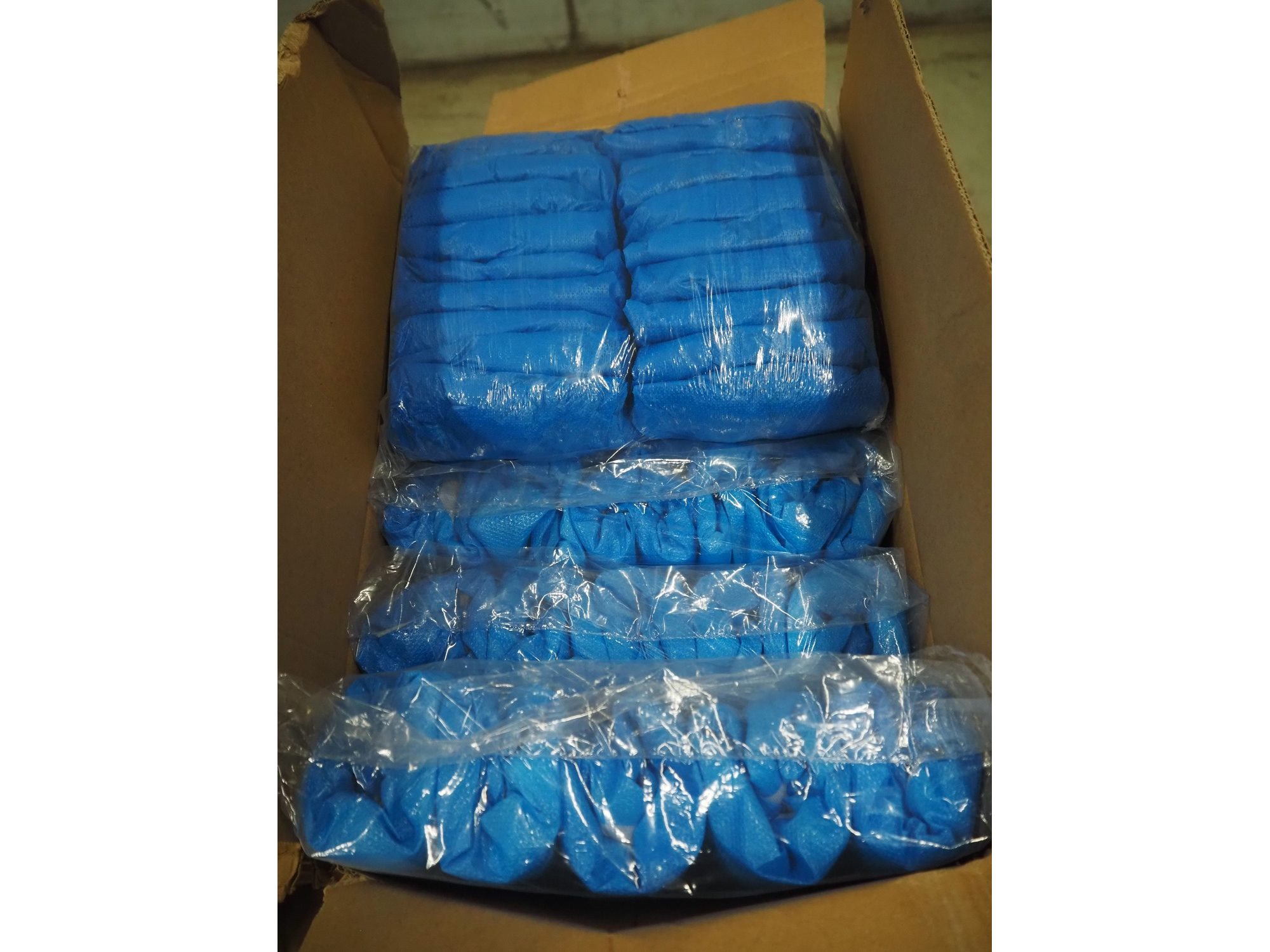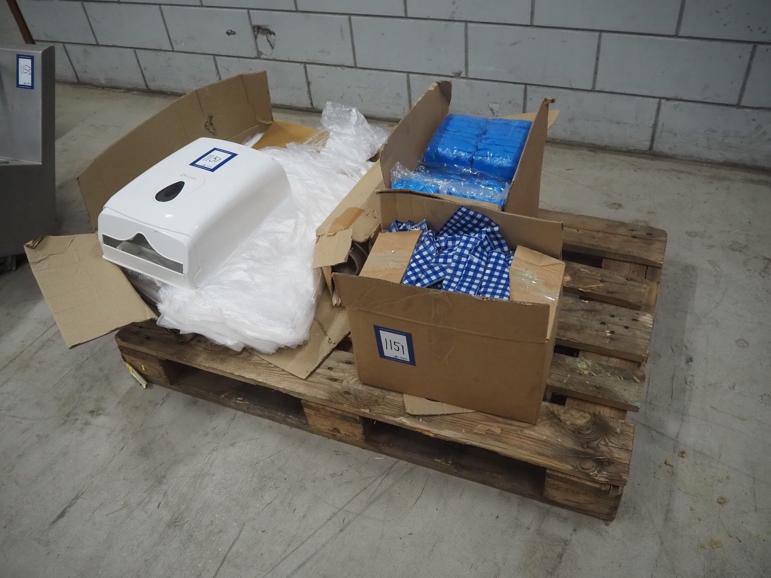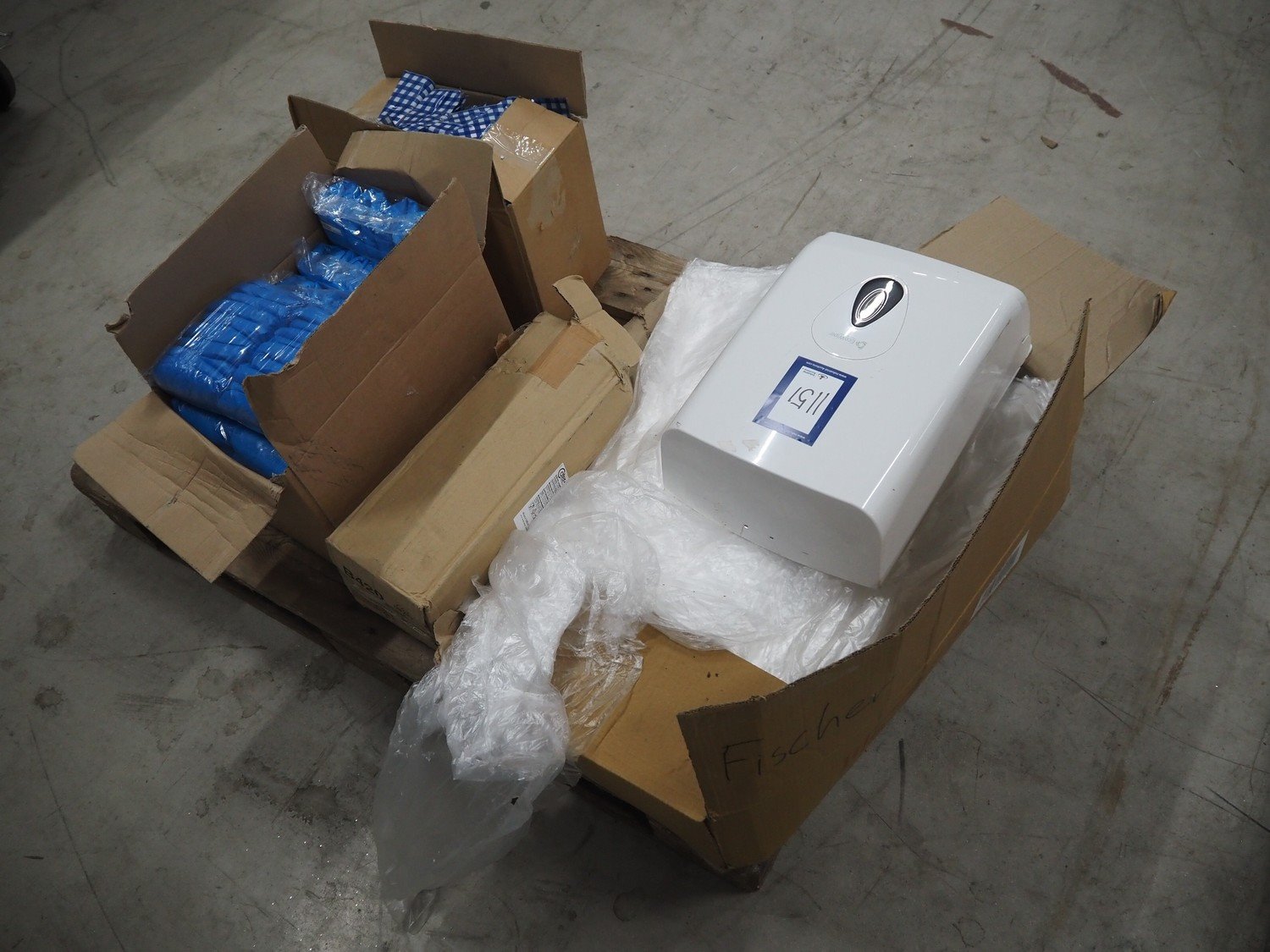 Pallet with hygiene equipment, among others: shoe covers, plastic bags and paper dispenser.
