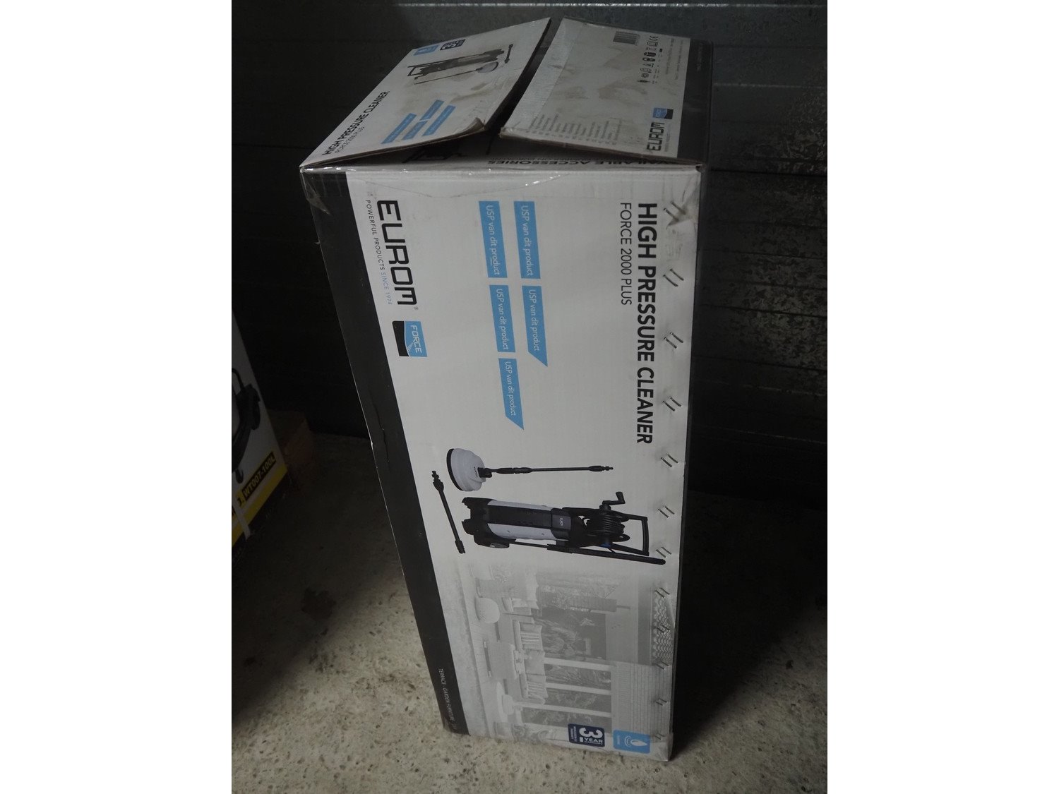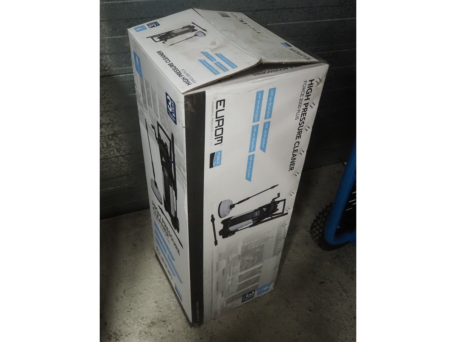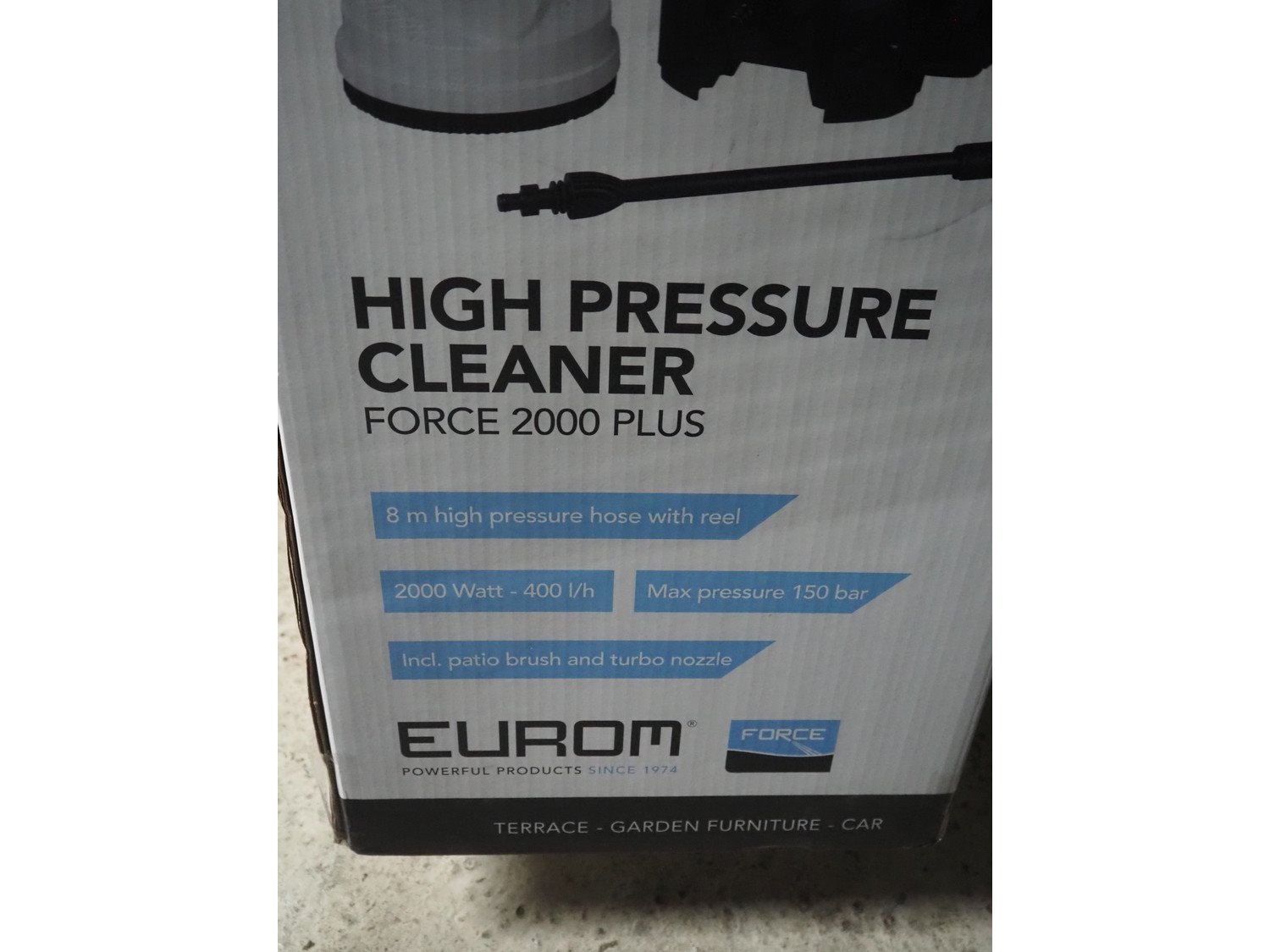 Eurom high pressure cleaner, model: Force 2000 Plus, number: 135381, 220/240 V, 1 Ph, 50 Hz, 2000 W, weight: 10 kg, dimensions: 870 mm x 340 mm x 330 mm.