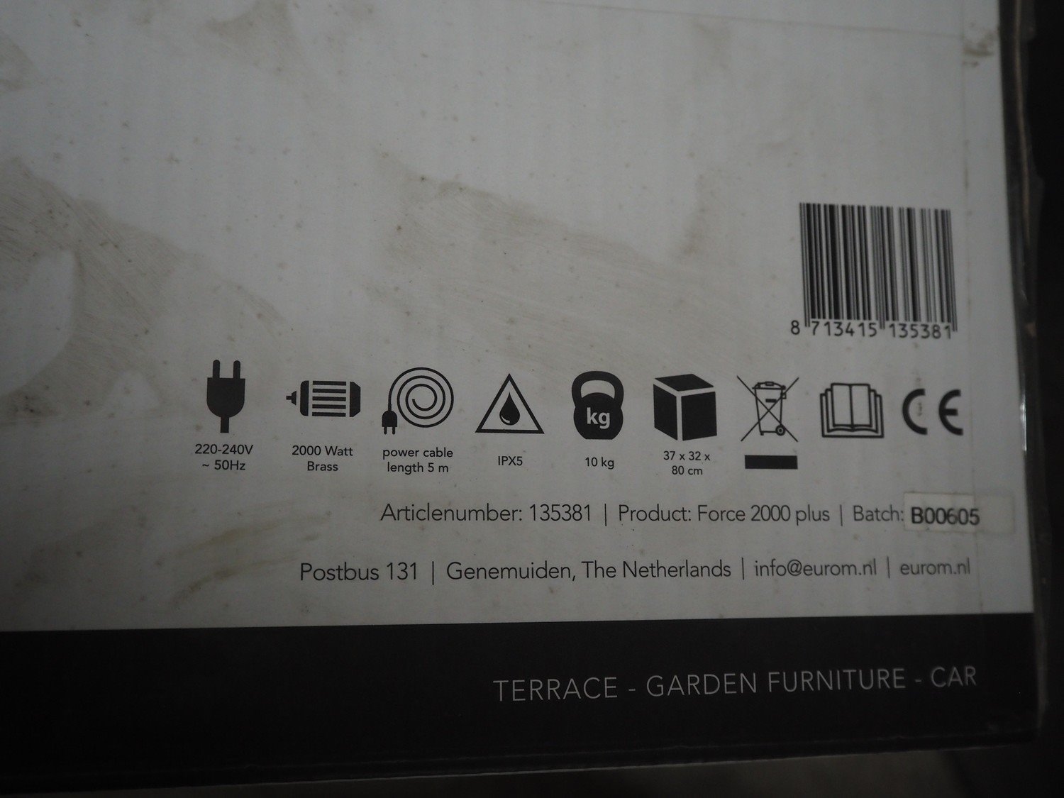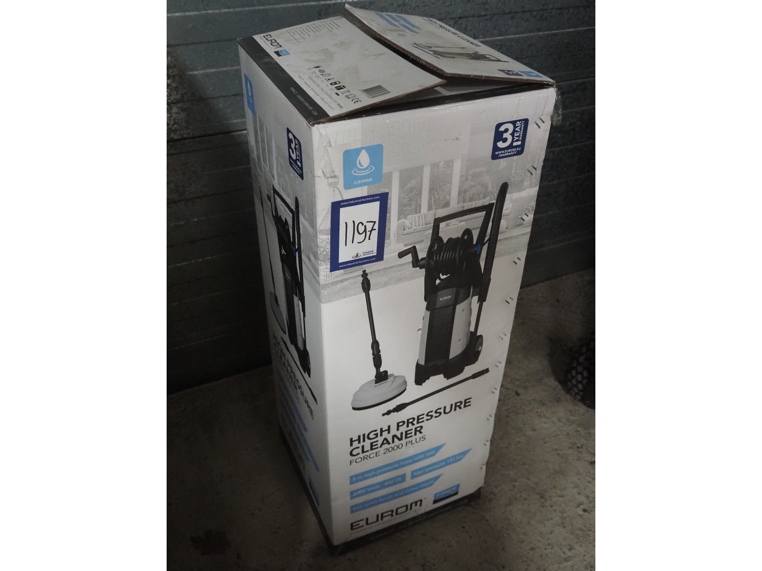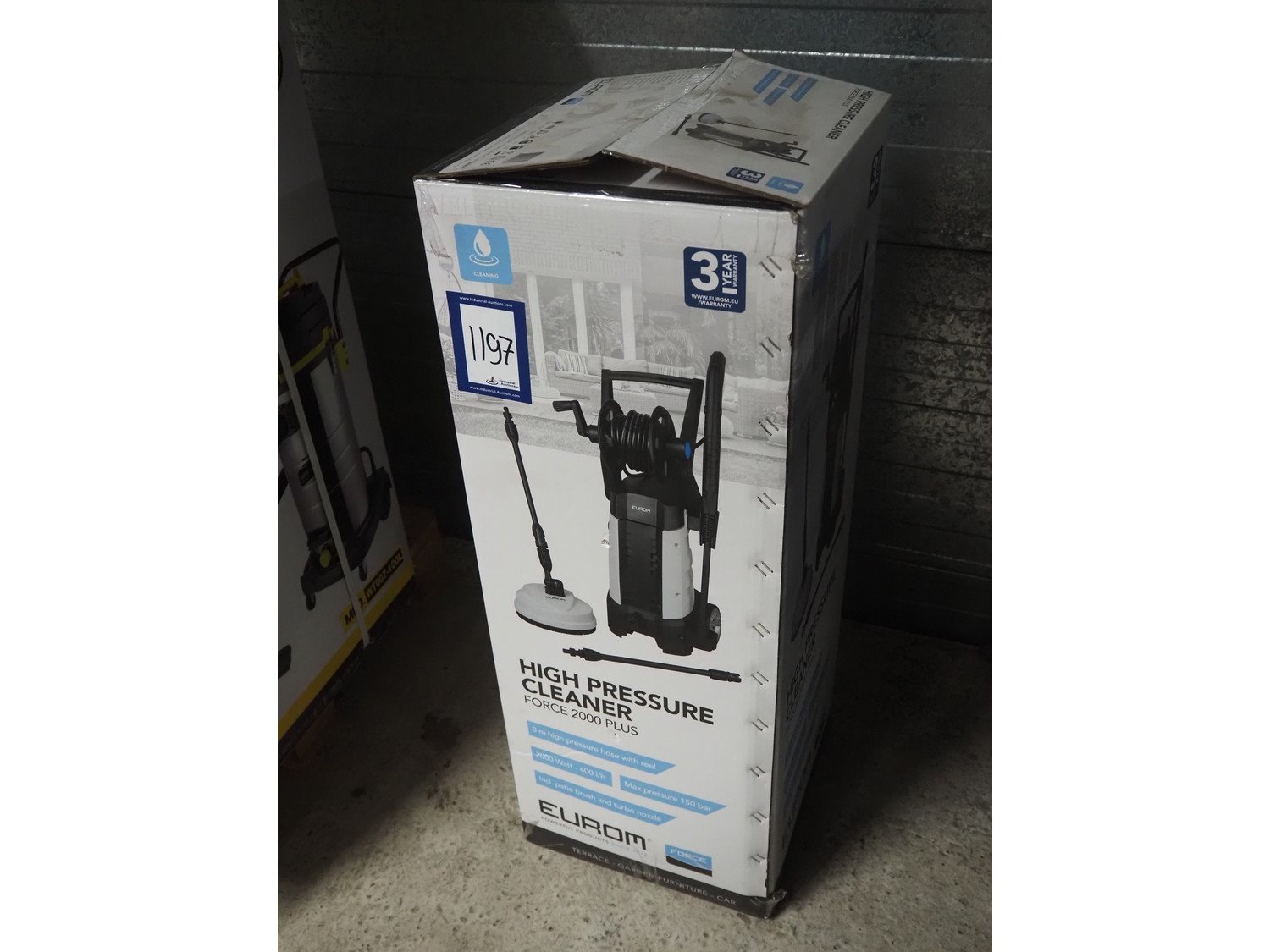 Eurom high pressure cleaner, model: Force 2000 Plus, number: 135381, 220/240 V, 1 Ph, 50 Hz, 2000 W, weight: 10 kg, dimensions: 870 mm x 340 mm x 330 mm.
