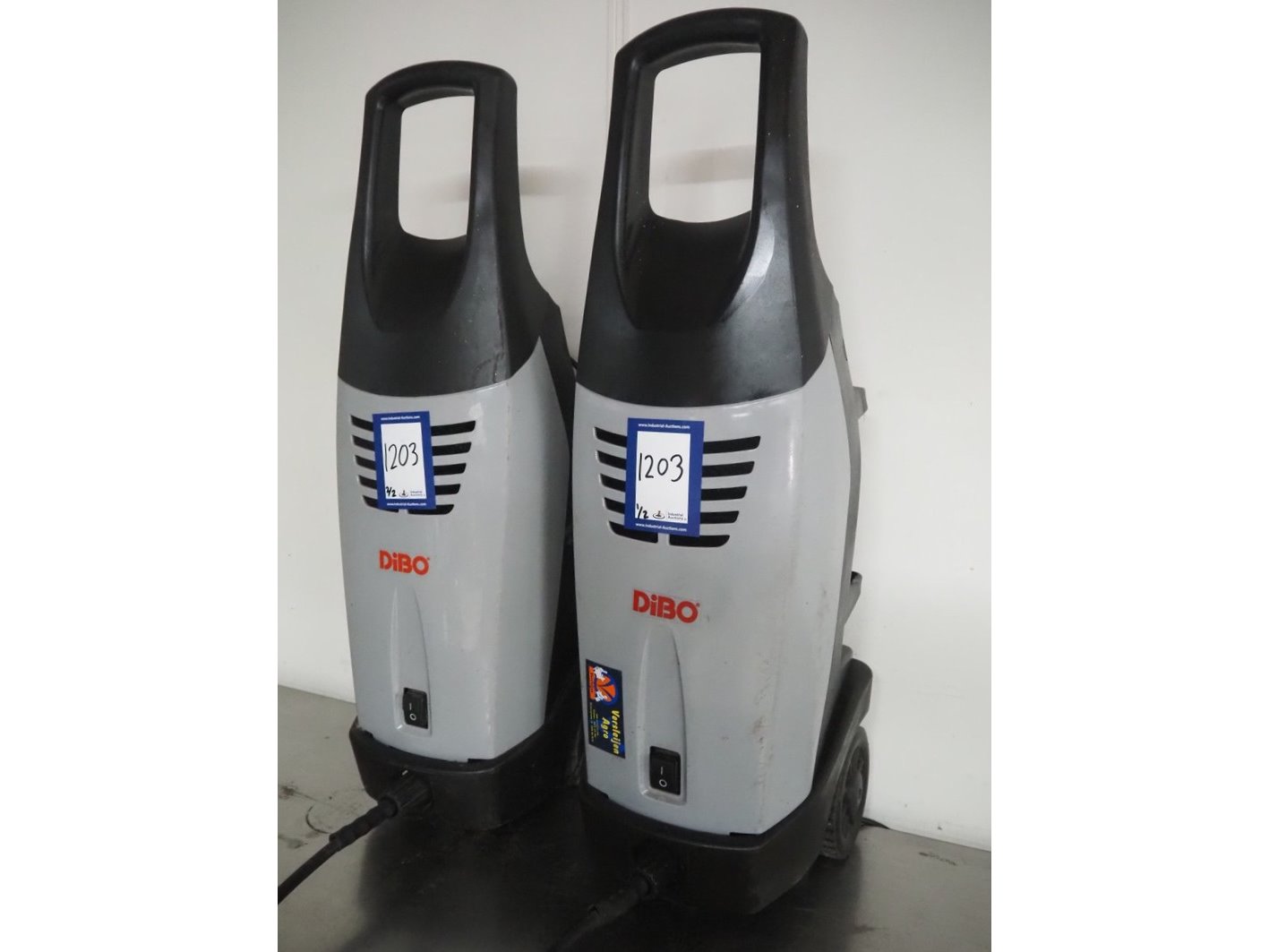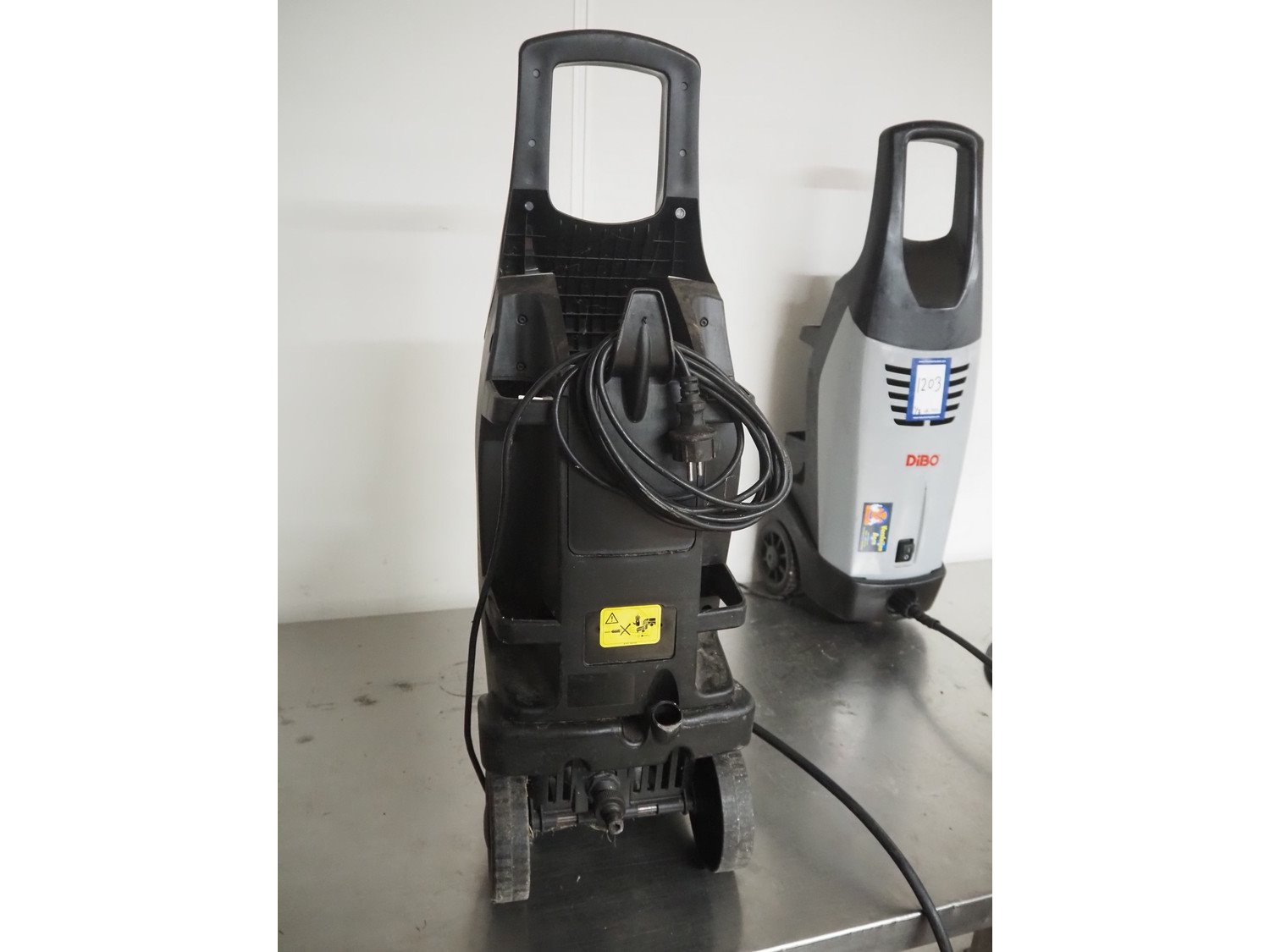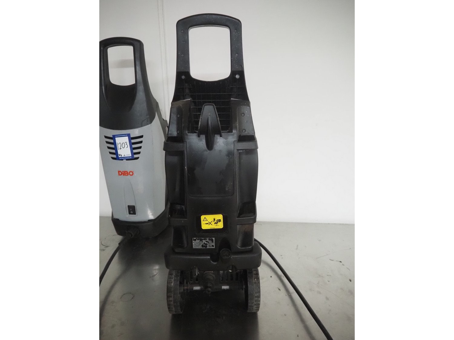 2 Dibo high pressure cleaners, type: H 1900, serial number: 090600092, year of construction: 2009, 230V, 50 Hz, 2.1 kW, 130 bar, 6.8 l/min, dimensions: (2x) 420 mm x 310 mm x 850 mm. Including 1 high pressure lance and 4 spare lance attachments, 1 wheel is broken.