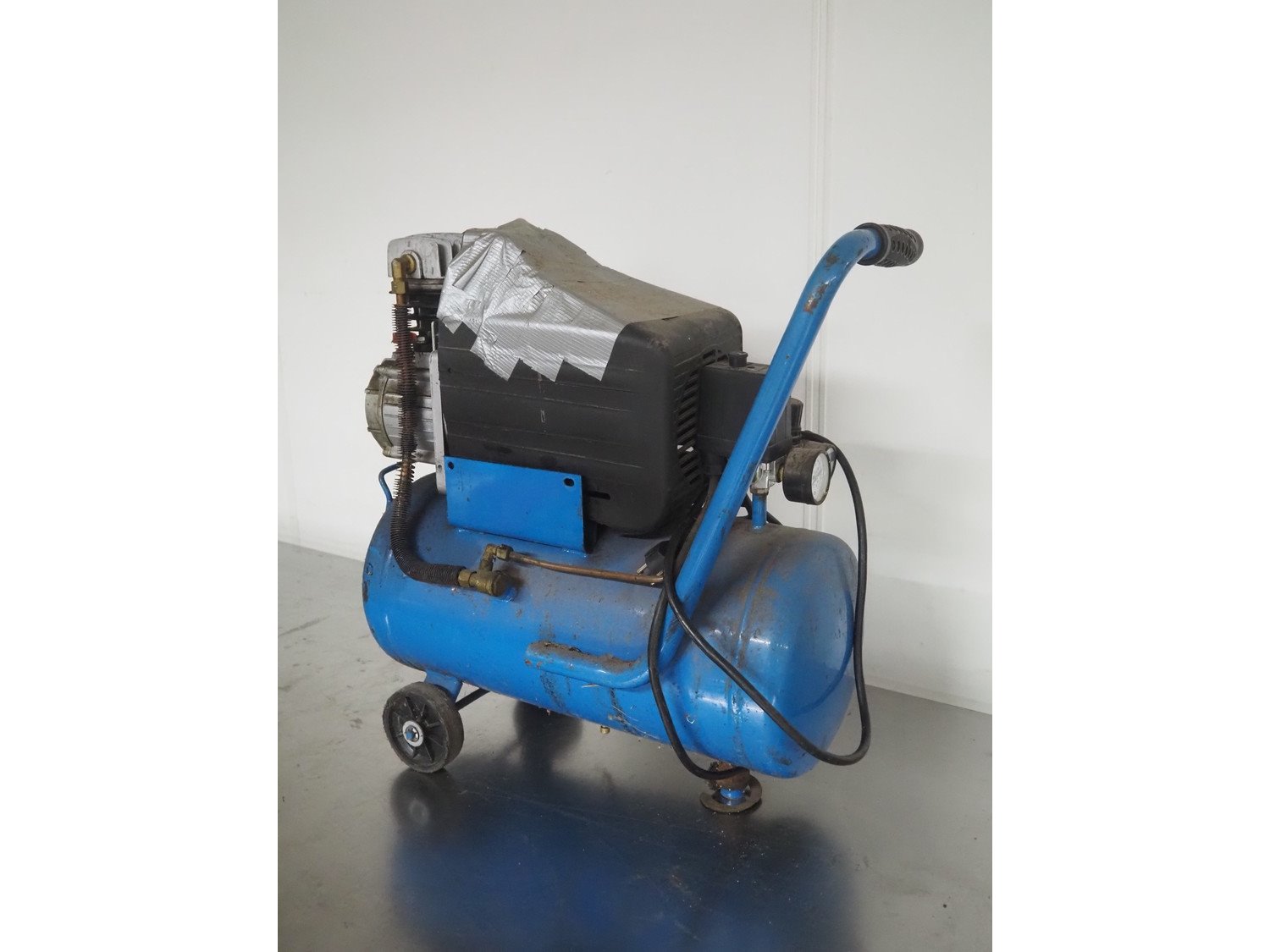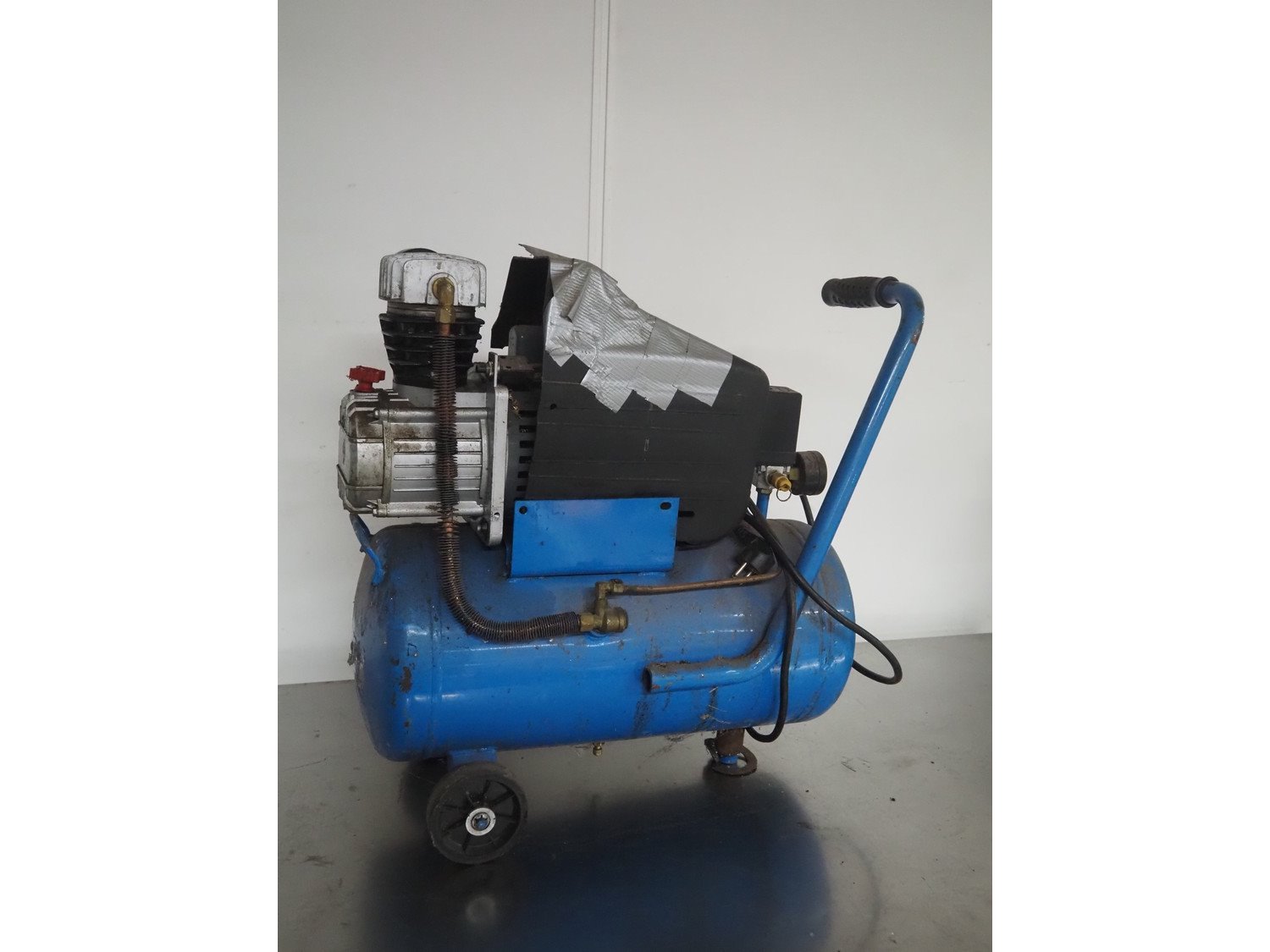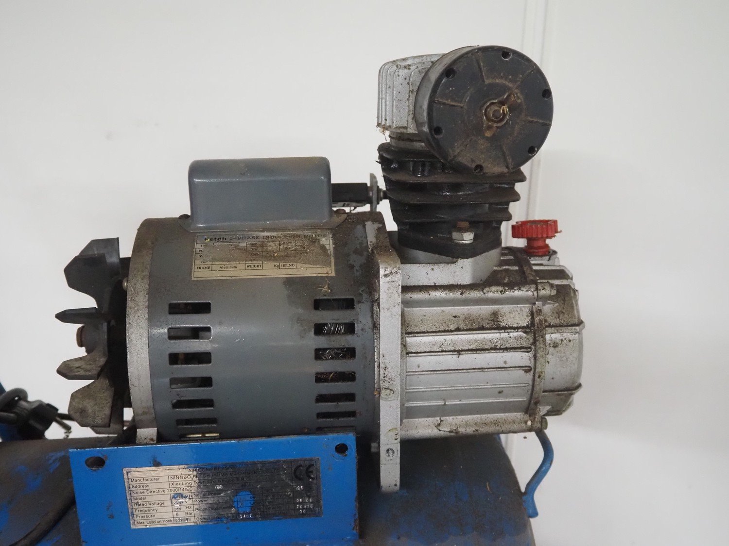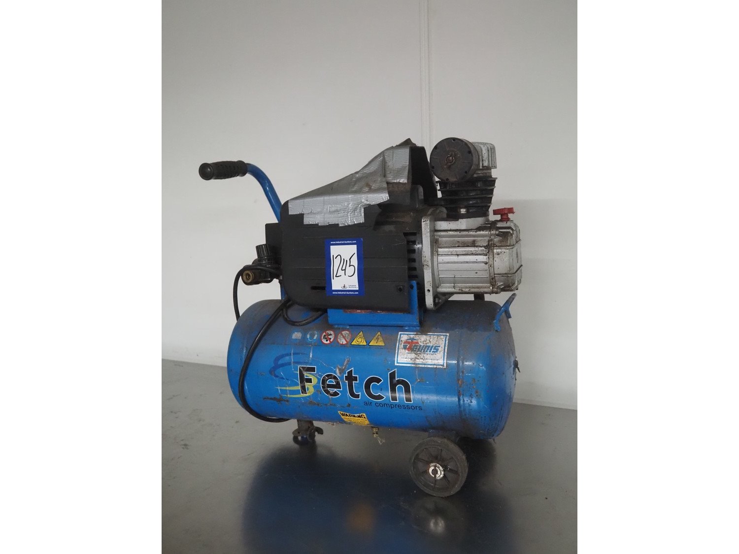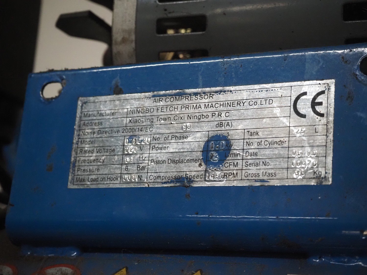 Fetch compressor, type: D21828, serial number: 00476, year of construction: 08-2008, 220 V, 1 Ph, 50 Hz, 1.1 kW, 8 bar, volume: 25 liter, dimensions: 600 mm x 250 mm x 370 mm. Technical condition unknown.