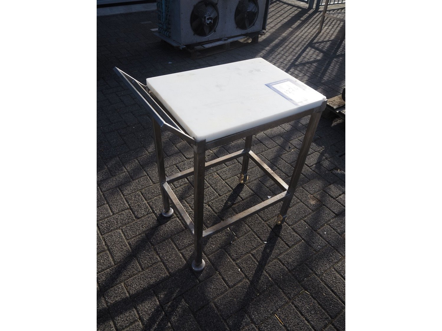 Mobile table, s/s frame with plastic top, dimensions: 730 mm x 440 mm x 940 mm.