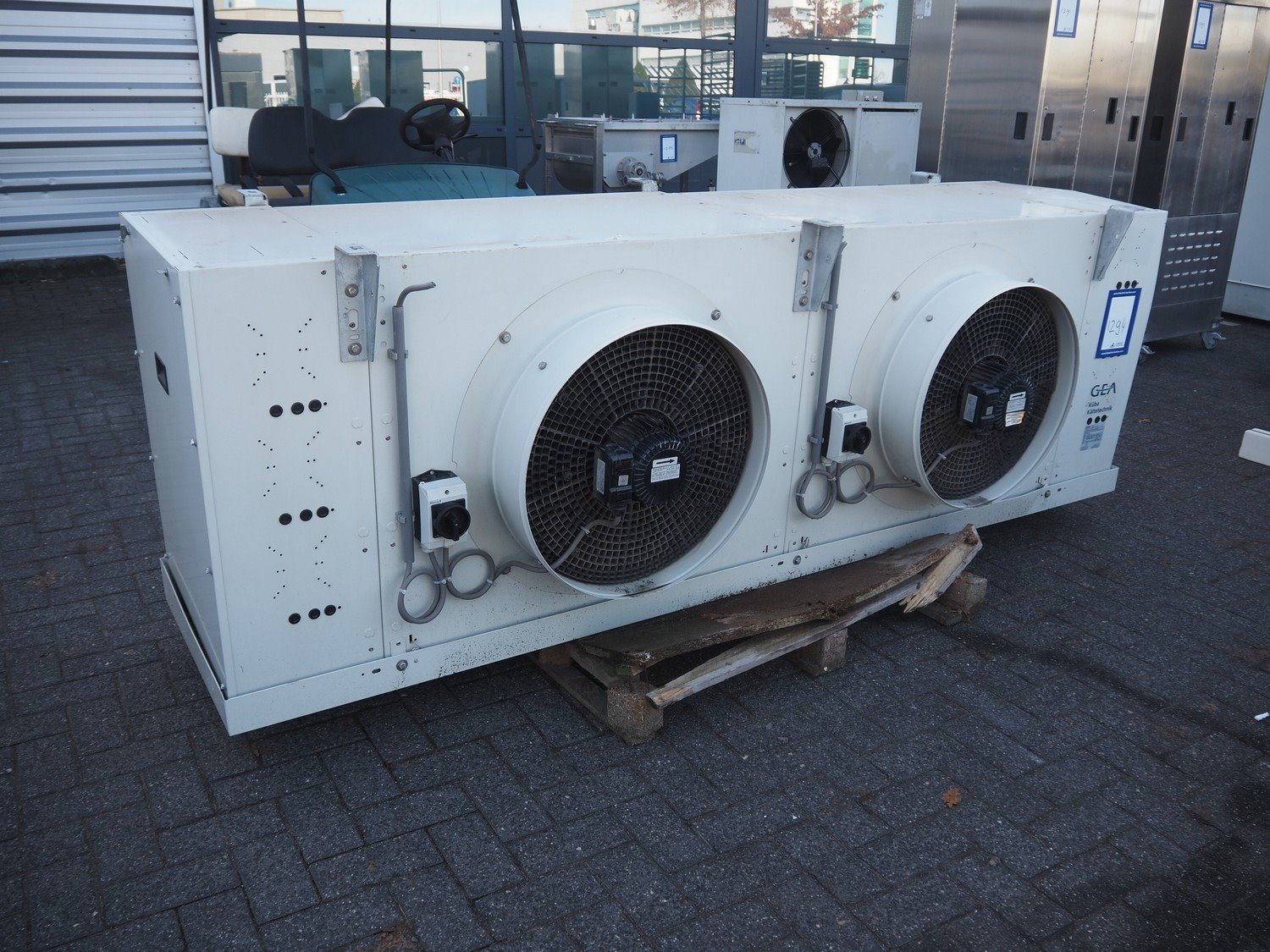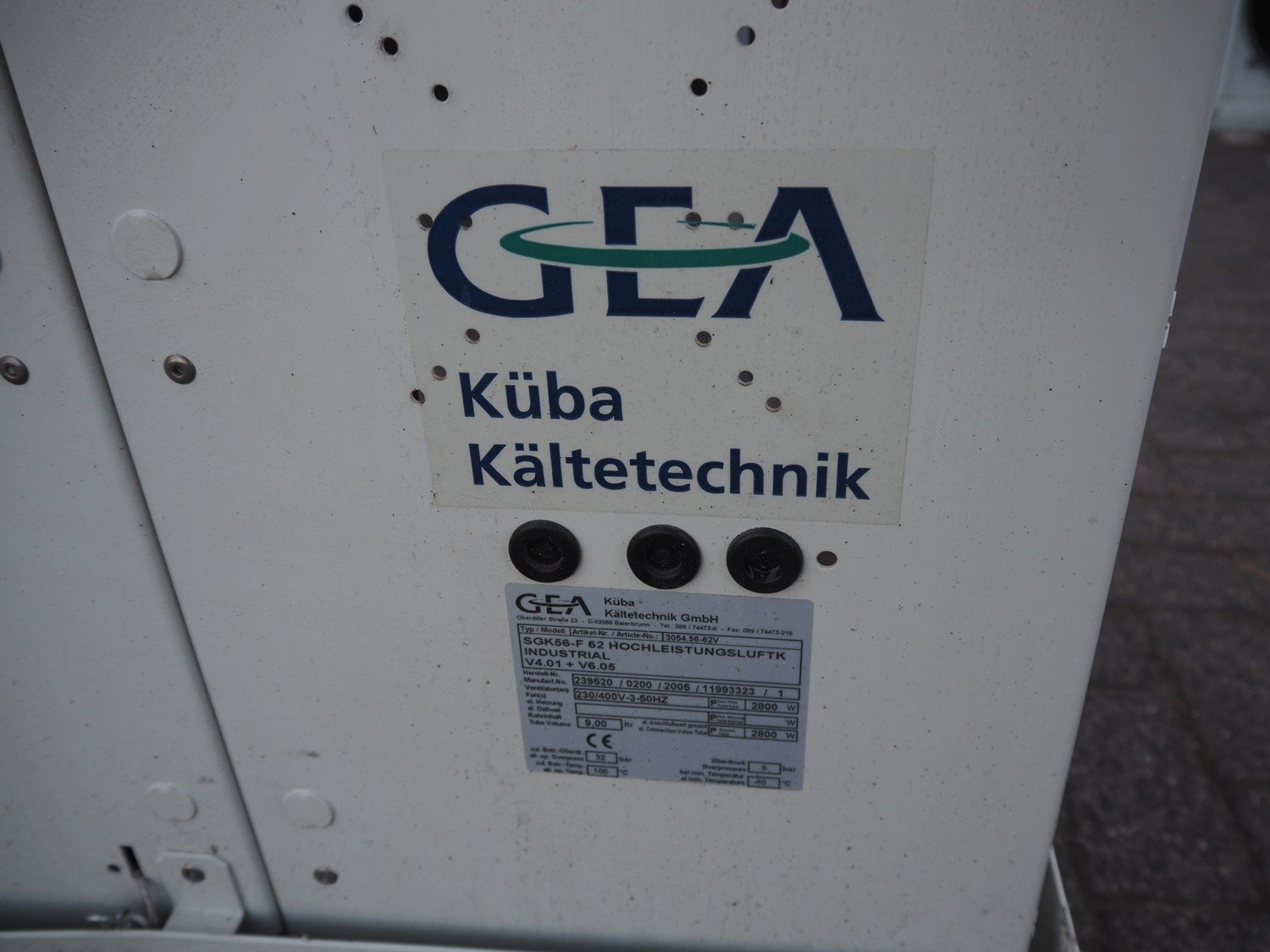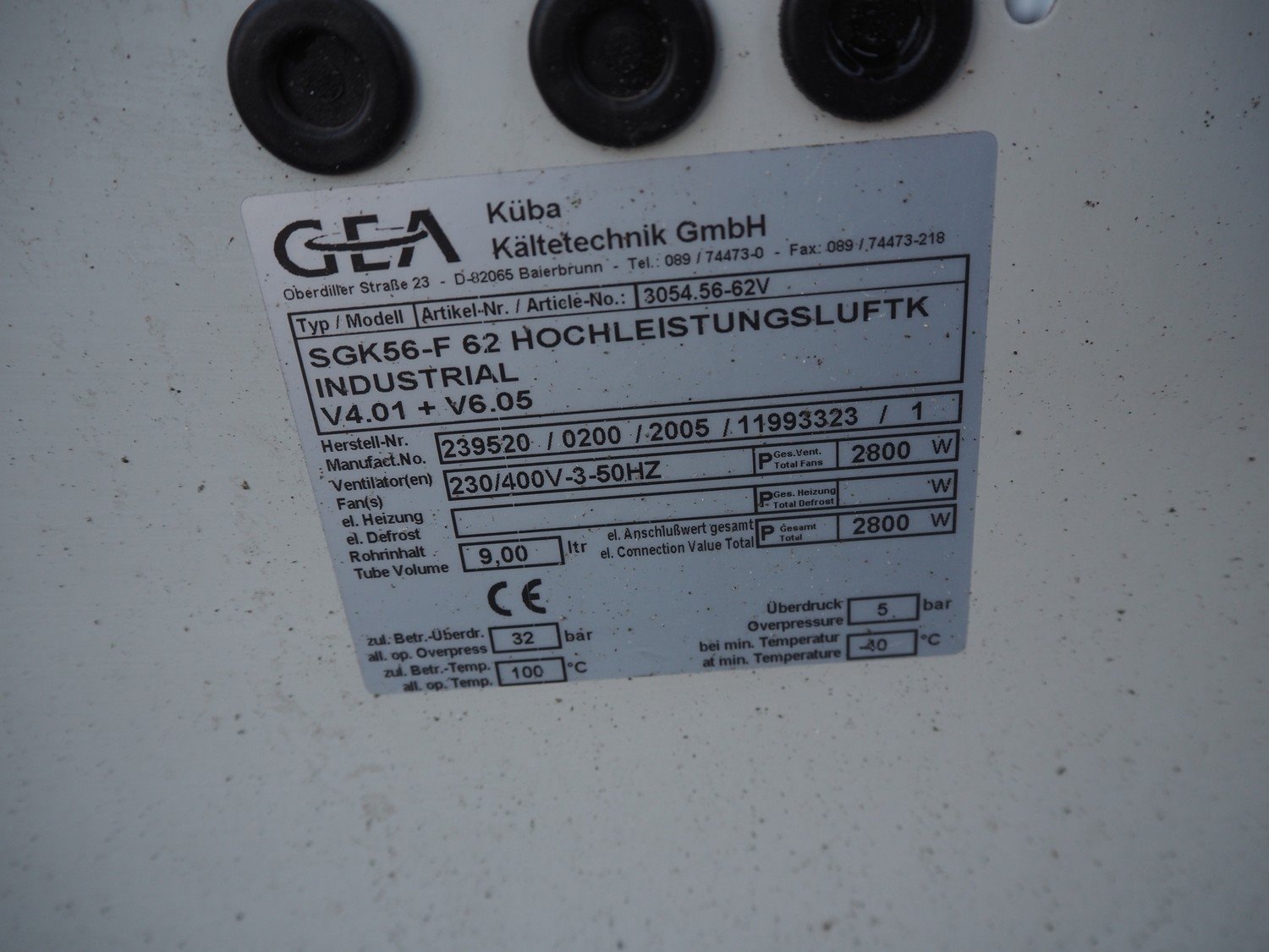 GEA Küba Kältetechnik GmbH evaporator, 2 fans, type: SGK56-F 82, number: 239520/0200/2005/11993323/1, year of construction: 2005, 230/400 V, 3 Ph, 50 Hz, 2800 W, dimensions: 2650 mm x 900 mm x 900 mm.