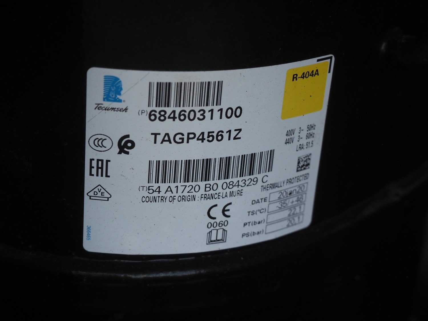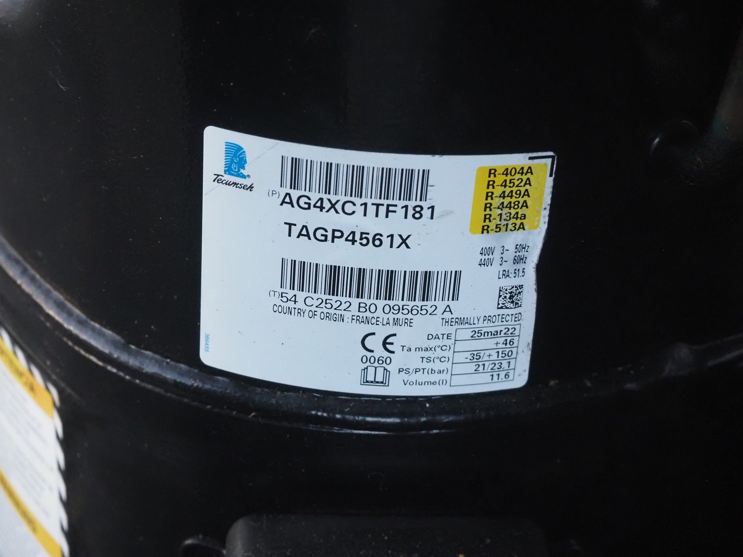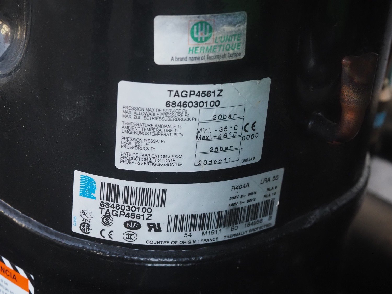 Cabinet with 4 Tecumseh cooling compressors, model: TFHP2480Z, TAGP4561X and (2x) TAGP4561Z, refrigerant: R507, 30 and 10 kg, dimensions: 2300 mm x 750 mm x 1550 mm. 1 compressor defect.