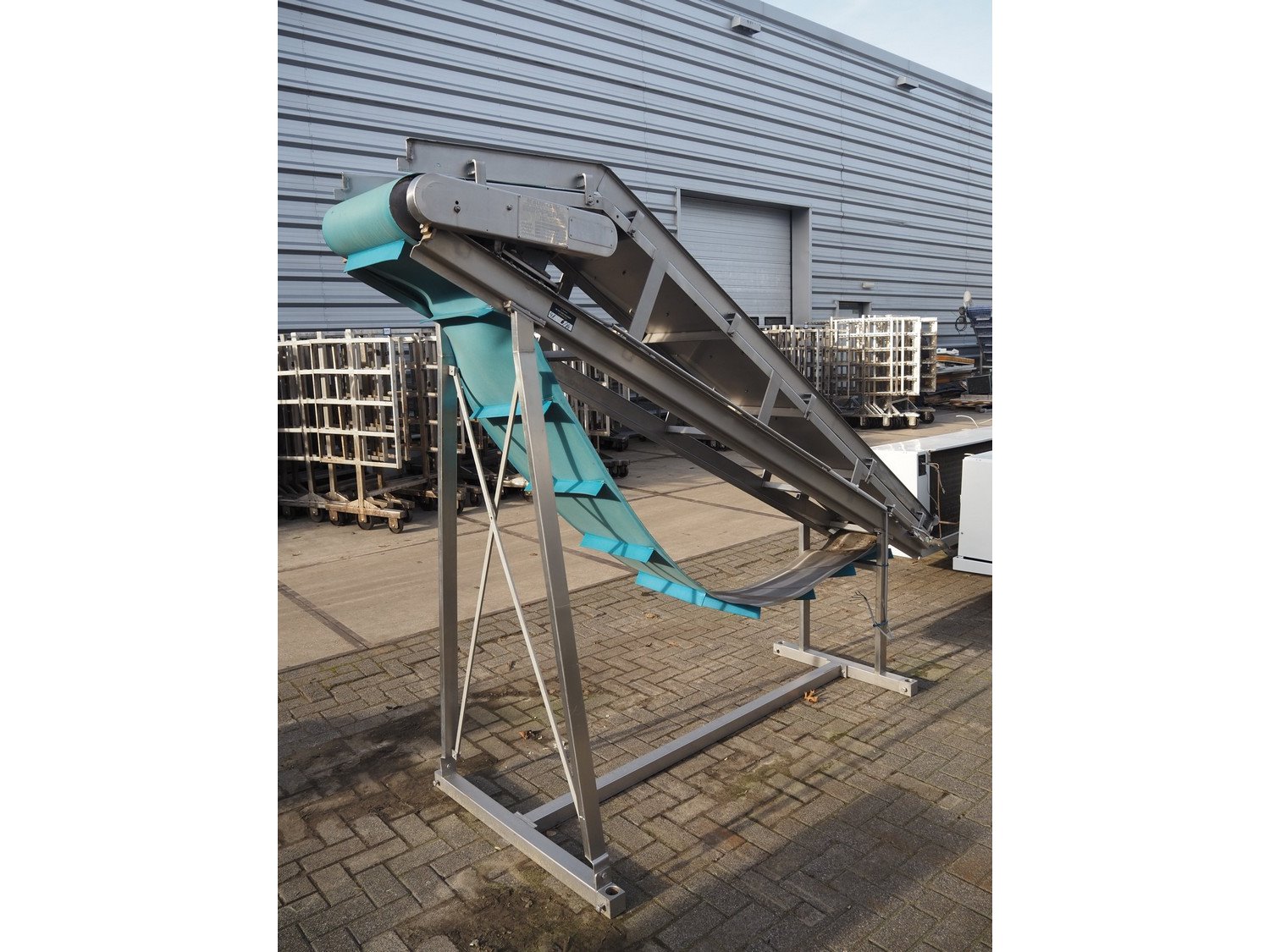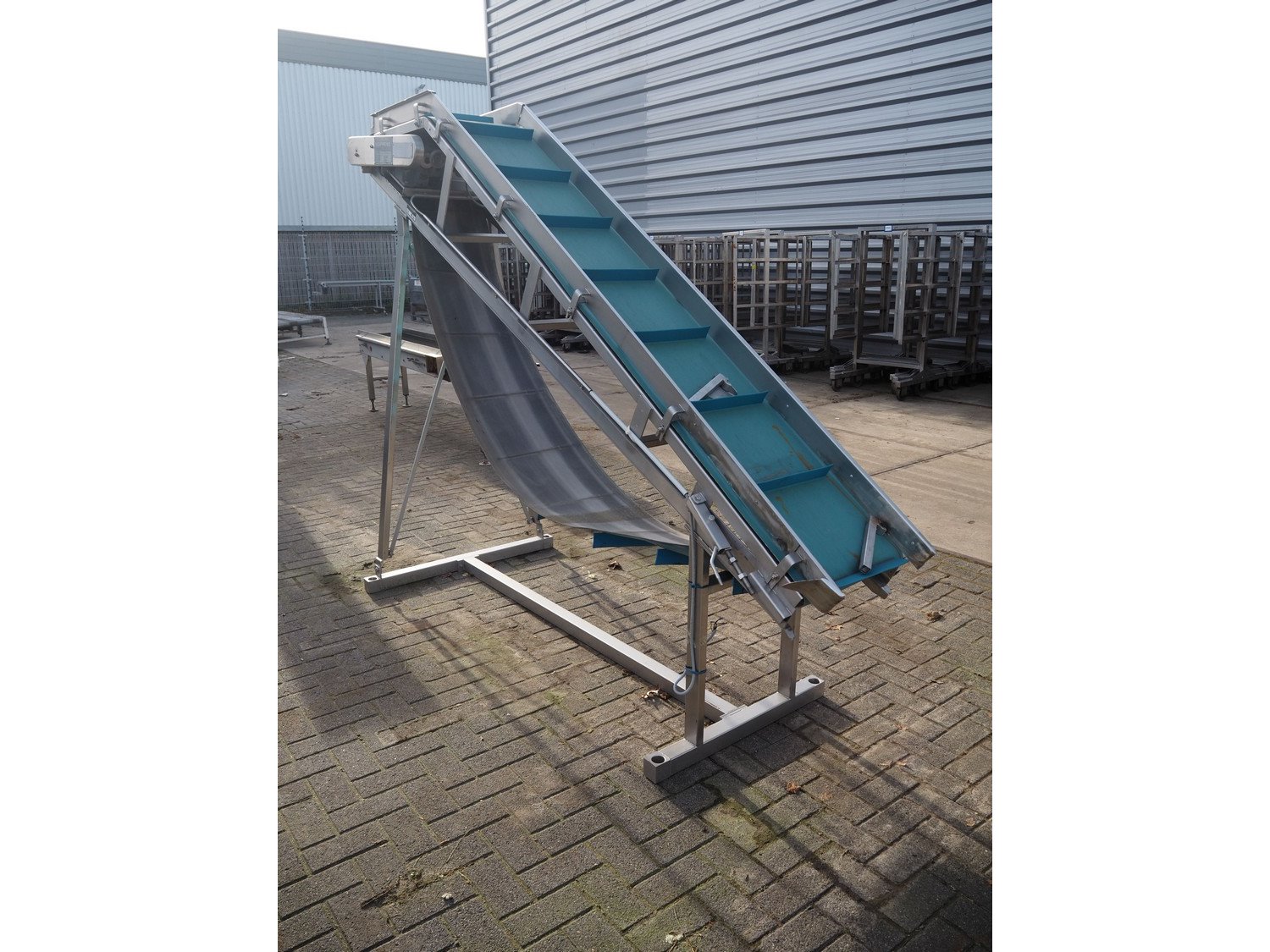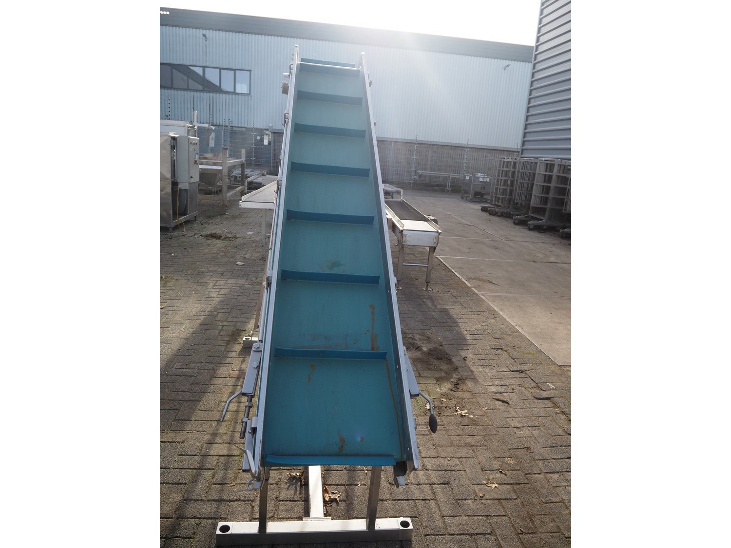 Koppens elevating belt with dividers, s/s frame, plastic belt, type: AVK 3200/450, machine number: AVK 3200/450-94, 380 V, 3 Ph, 50 Hz, 0.87 A, 0.18 kW, weight: 185 kg, belt width: 450 mm, distance between dividers: 330 mm, divider height: 50 mm, elevating height: 2100 mm, total dimensions: 3000 mm x 1100 mm x 2200 mm.