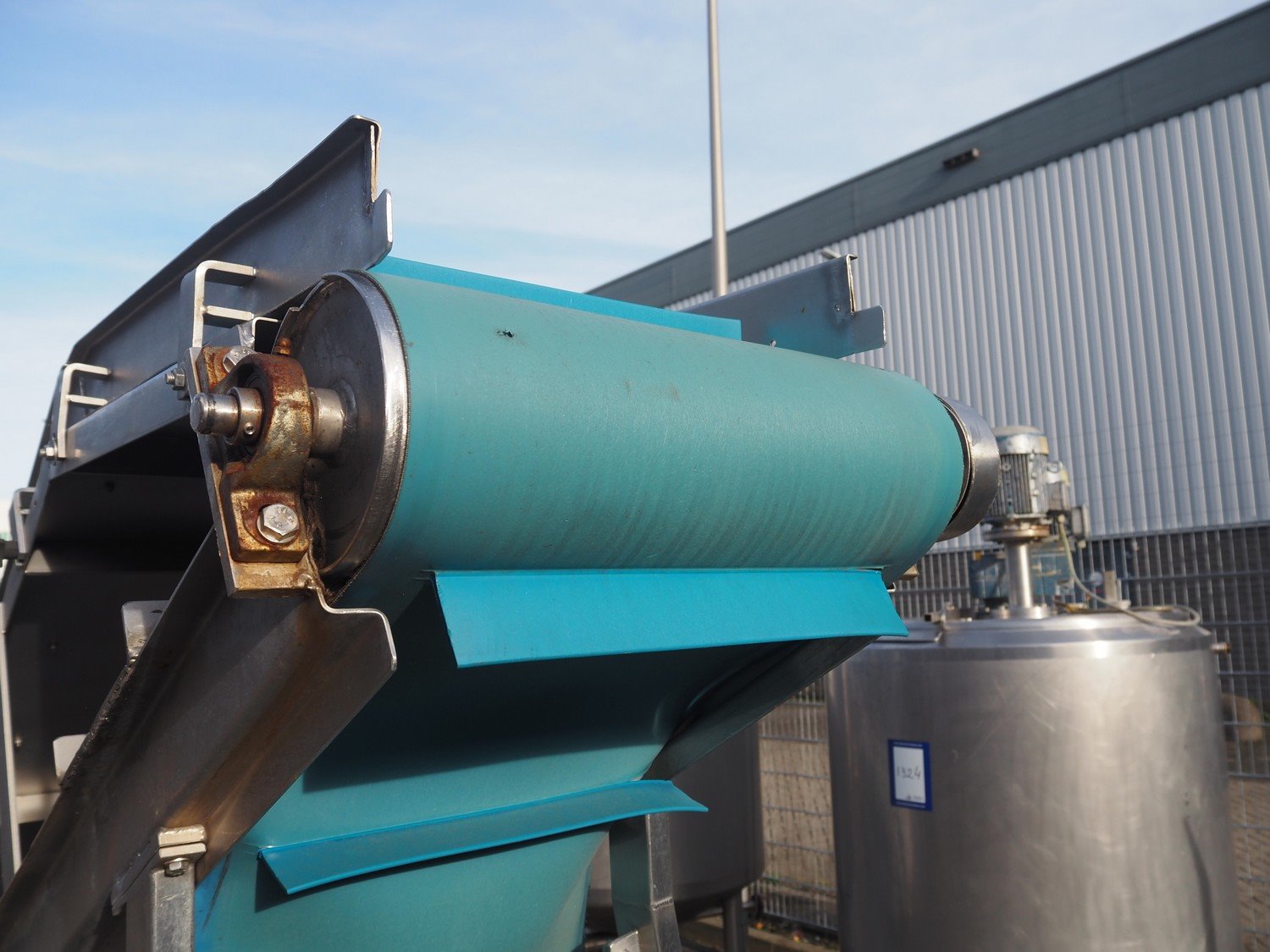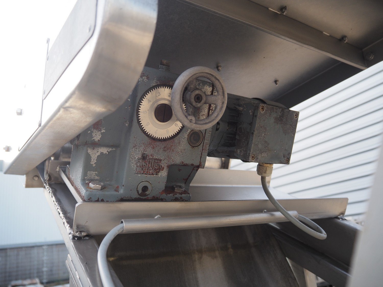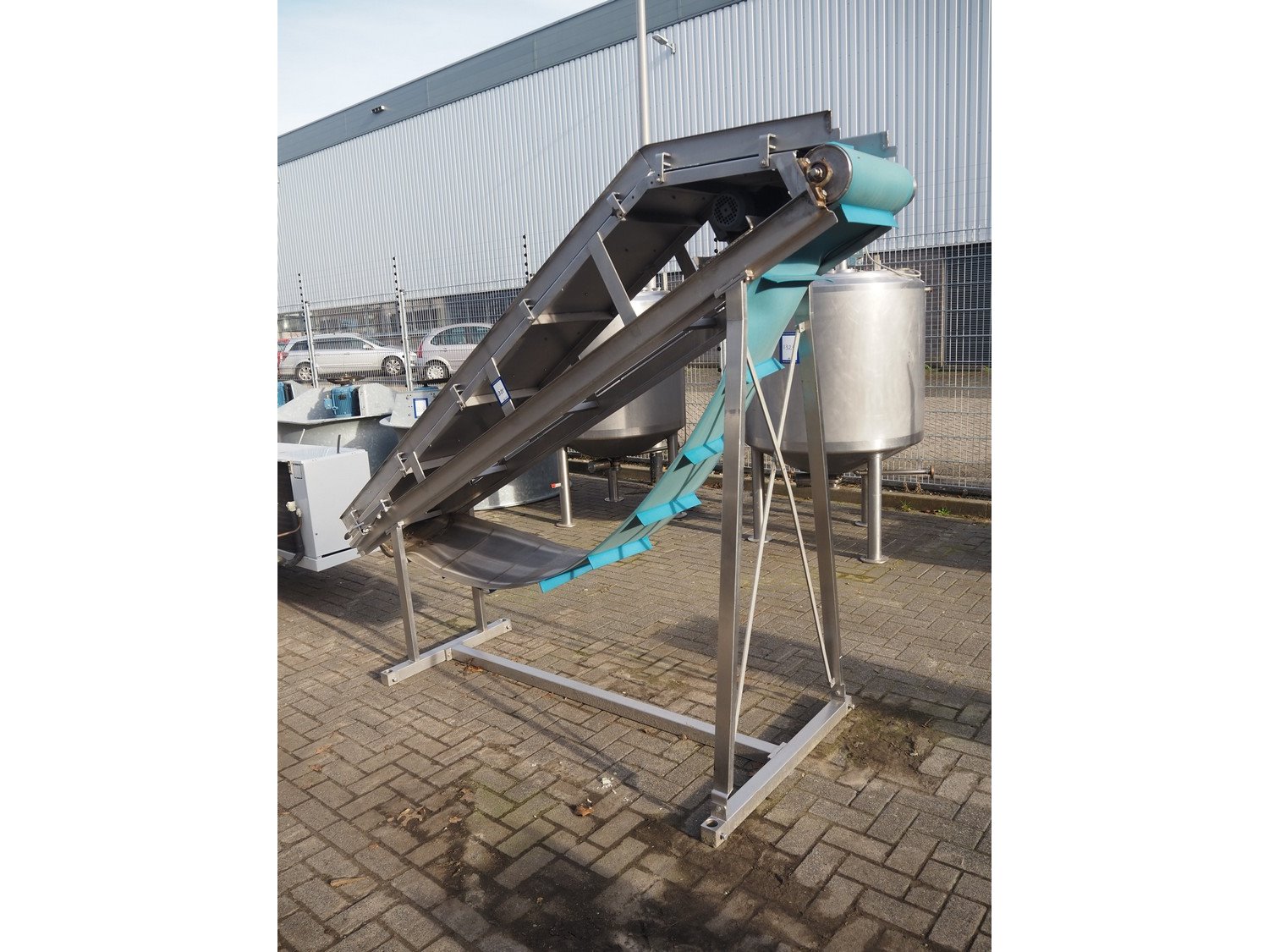 Koppens elevating belt with dividers, s/s frame, plastic belt, type: AVK 3200/450, machine number: AVK 3200/450-94, 380 V, 3 Ph, 50 Hz, 0.87 A, 0.18 kW, weight: 185 kg, belt width: 450 mm, distance between dividers: 330 mm, divider height: 50 mm, elevating height: 2100 mm, total dimensions: 3000 mm x 1100 mm x 2200 mm.