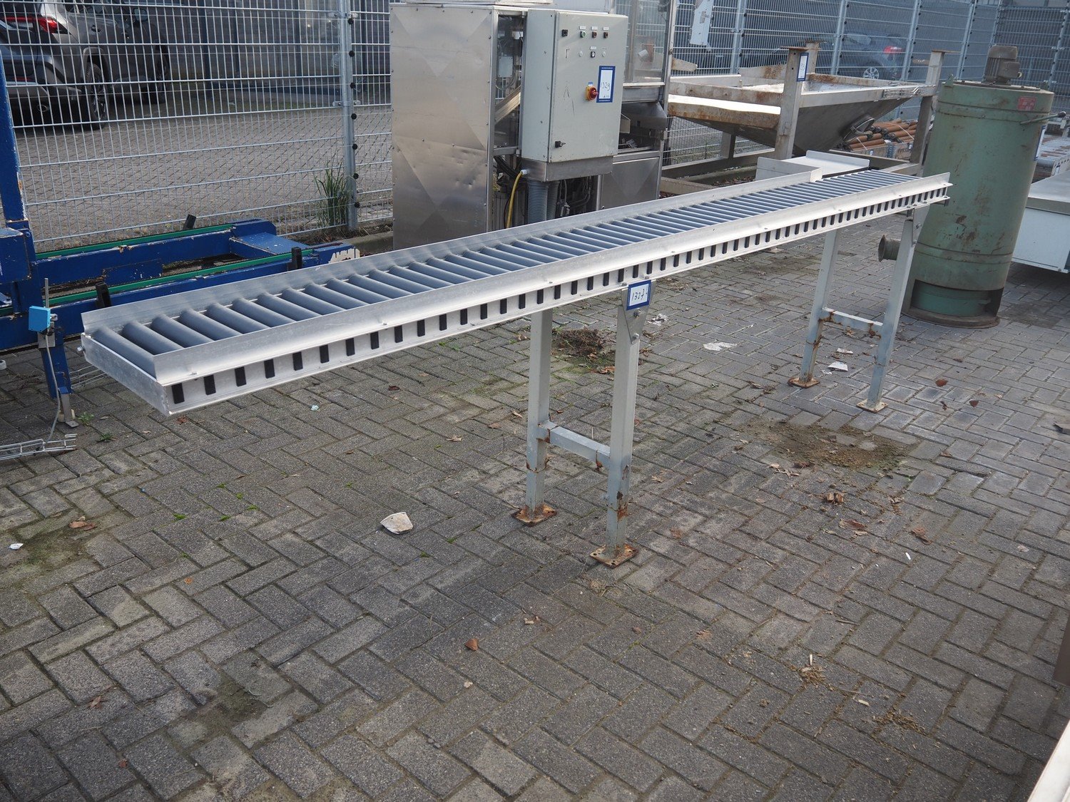Roller conveyor, steel frame, plastic rollers, roller width: 340 mm, total dimensions: 3530 mm x 500 mm x 1010 mm.